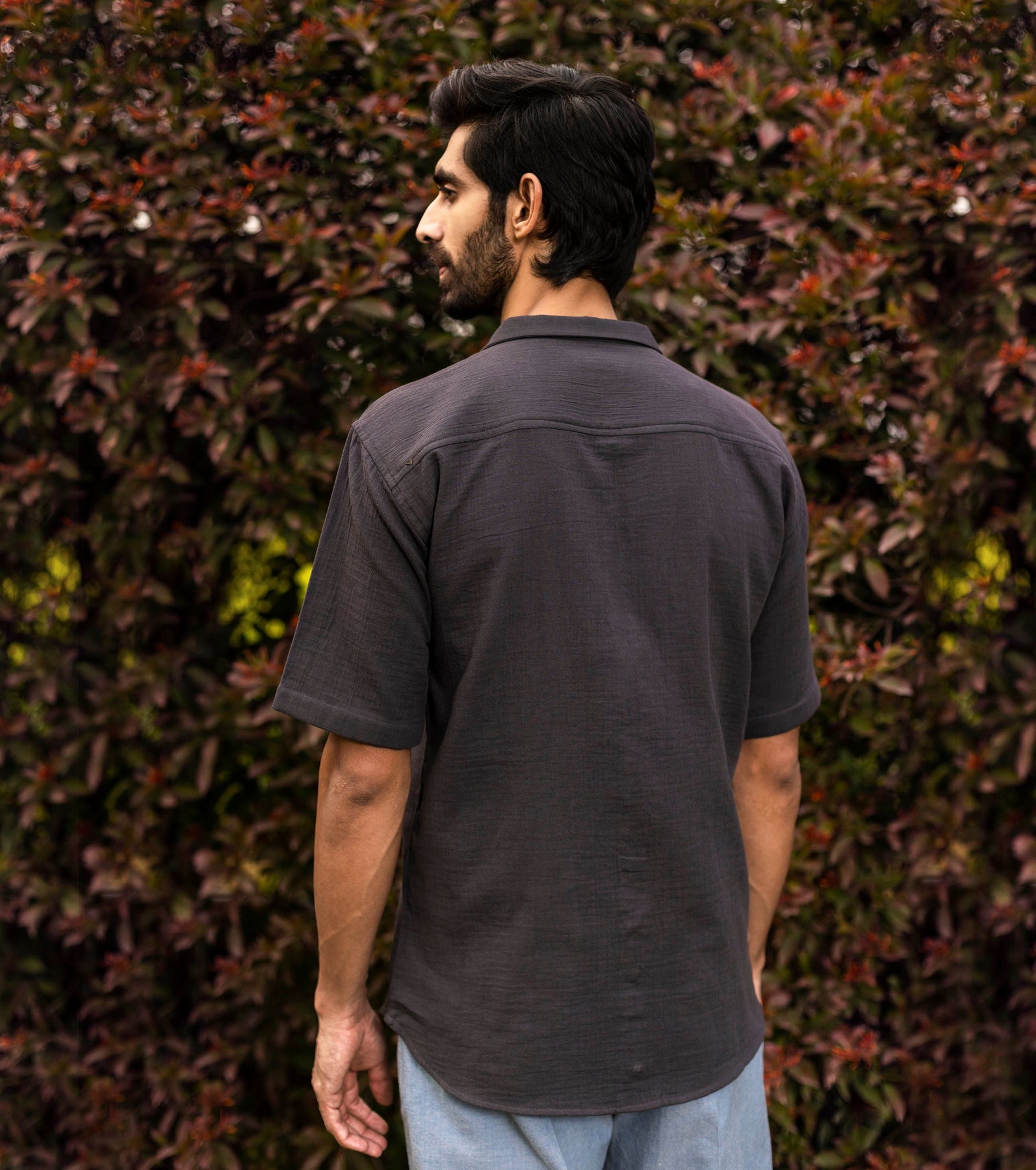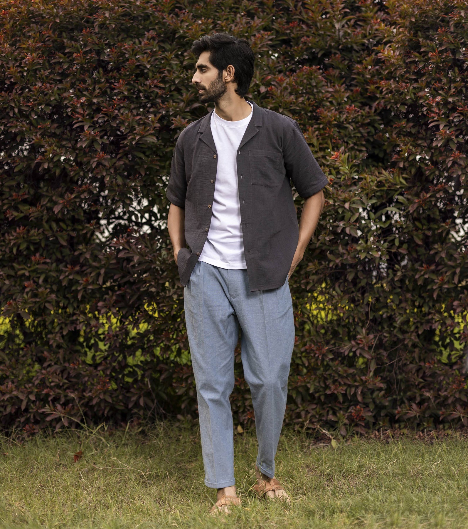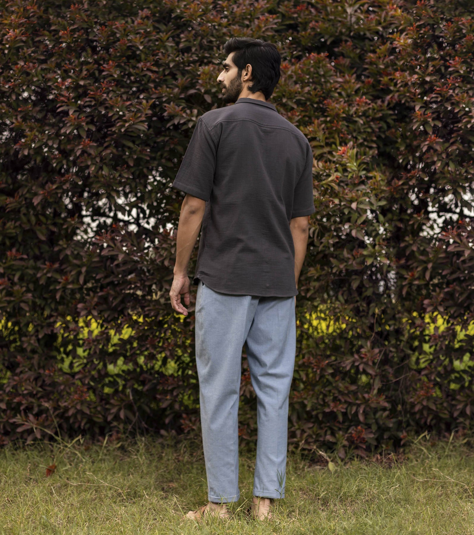 In the shadowy solace of quiet corners, spending time with yourself, let the silence speak through your reflection, offering a glimpse into hidden parts of your soul. Classic charcoal cotton with a notched collar, wooden buttons, ikat detailing and front pocket.