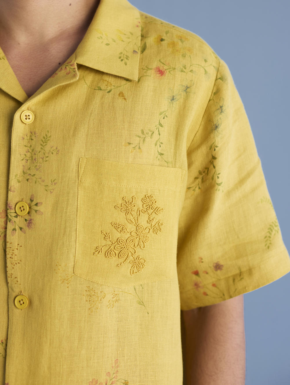 A modern short sleeve shirt with a one piece collar which can also be worn open, like a cuban collar, designed in a hand-painted floral print styled with a hand-embroidered floral motif on the pocket with tonal coloured beads. Our take on a fun and different summer shirt for men.