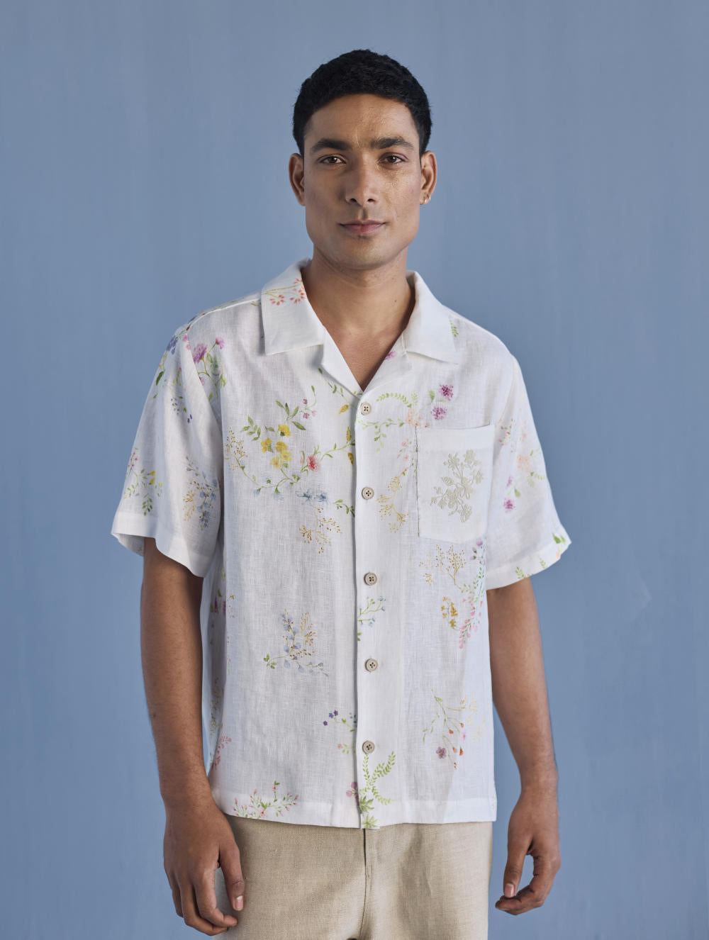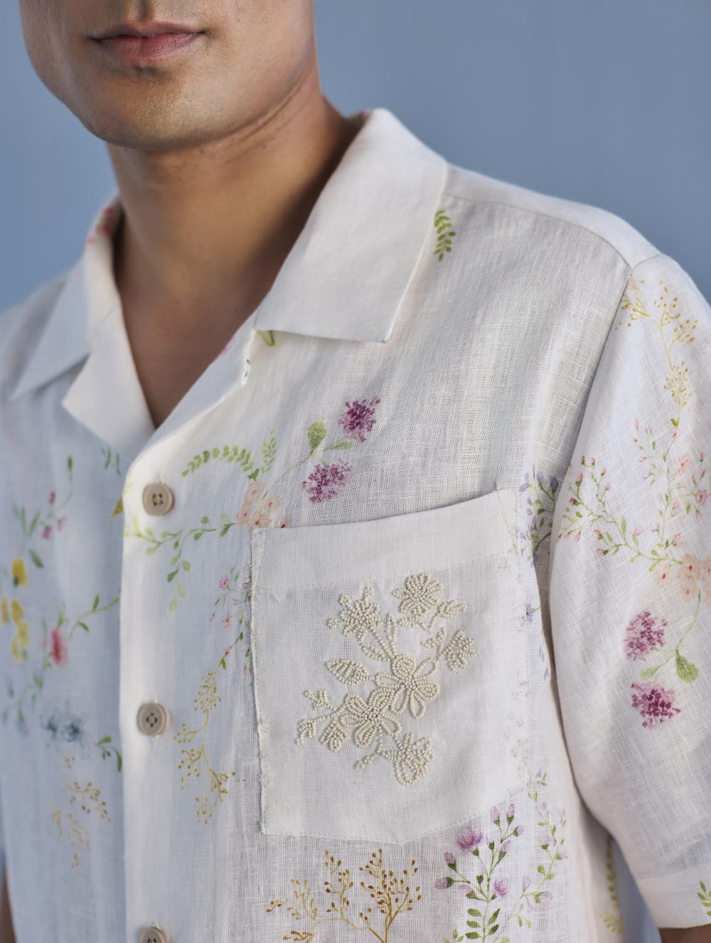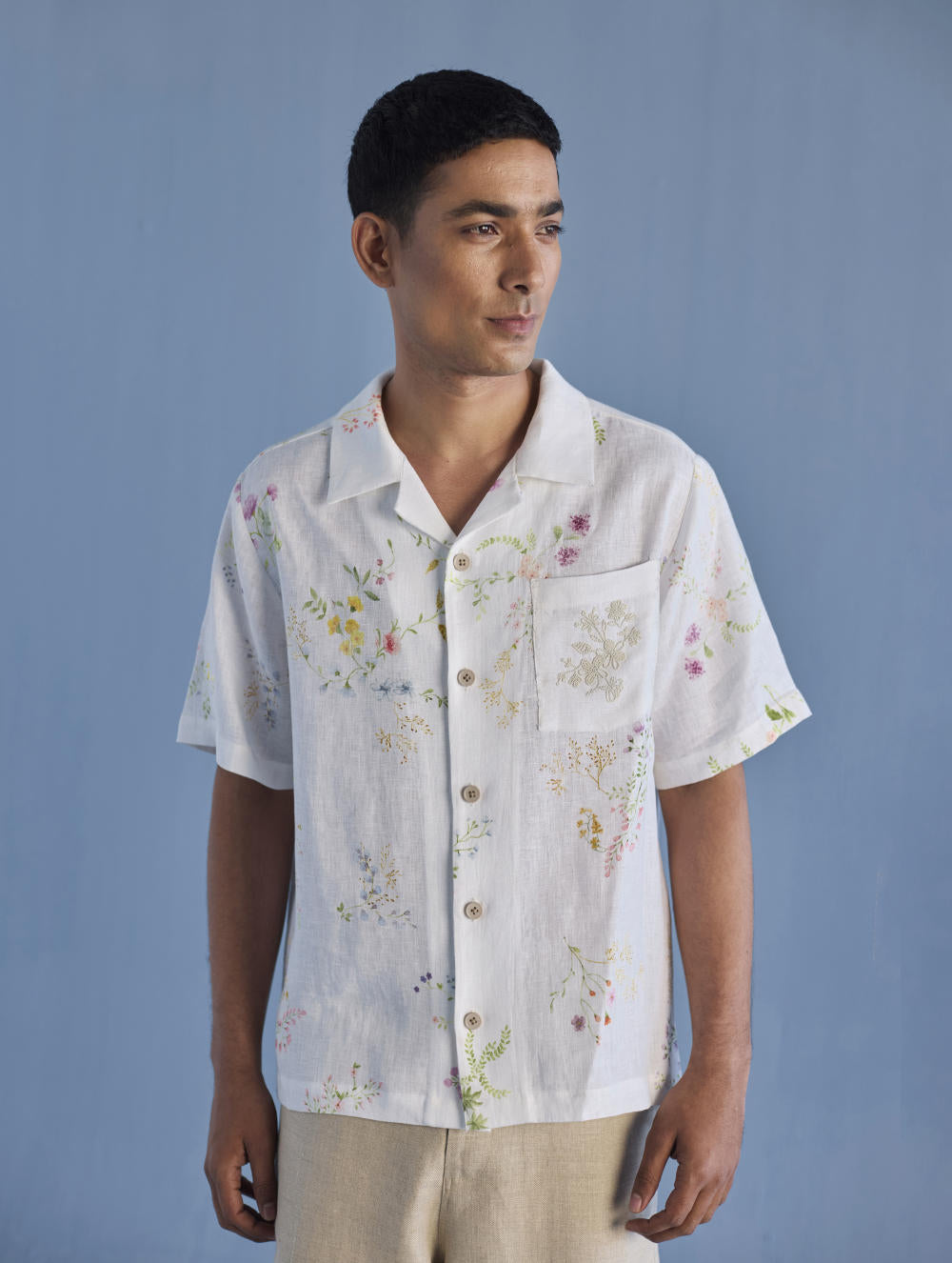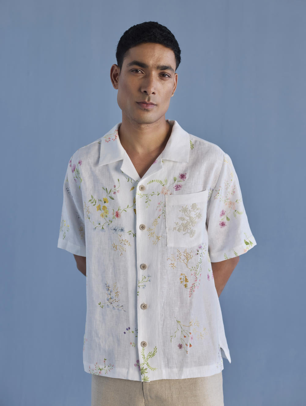 A modern short sleeve shirt with a one piece collar which can also be worn open, like a cuban collar, designed in a hand-painted floral print styled with a hand-embroidered floral motif on the pocket with tonal coloured beads. Our take on a fun and different summer shirt for men.