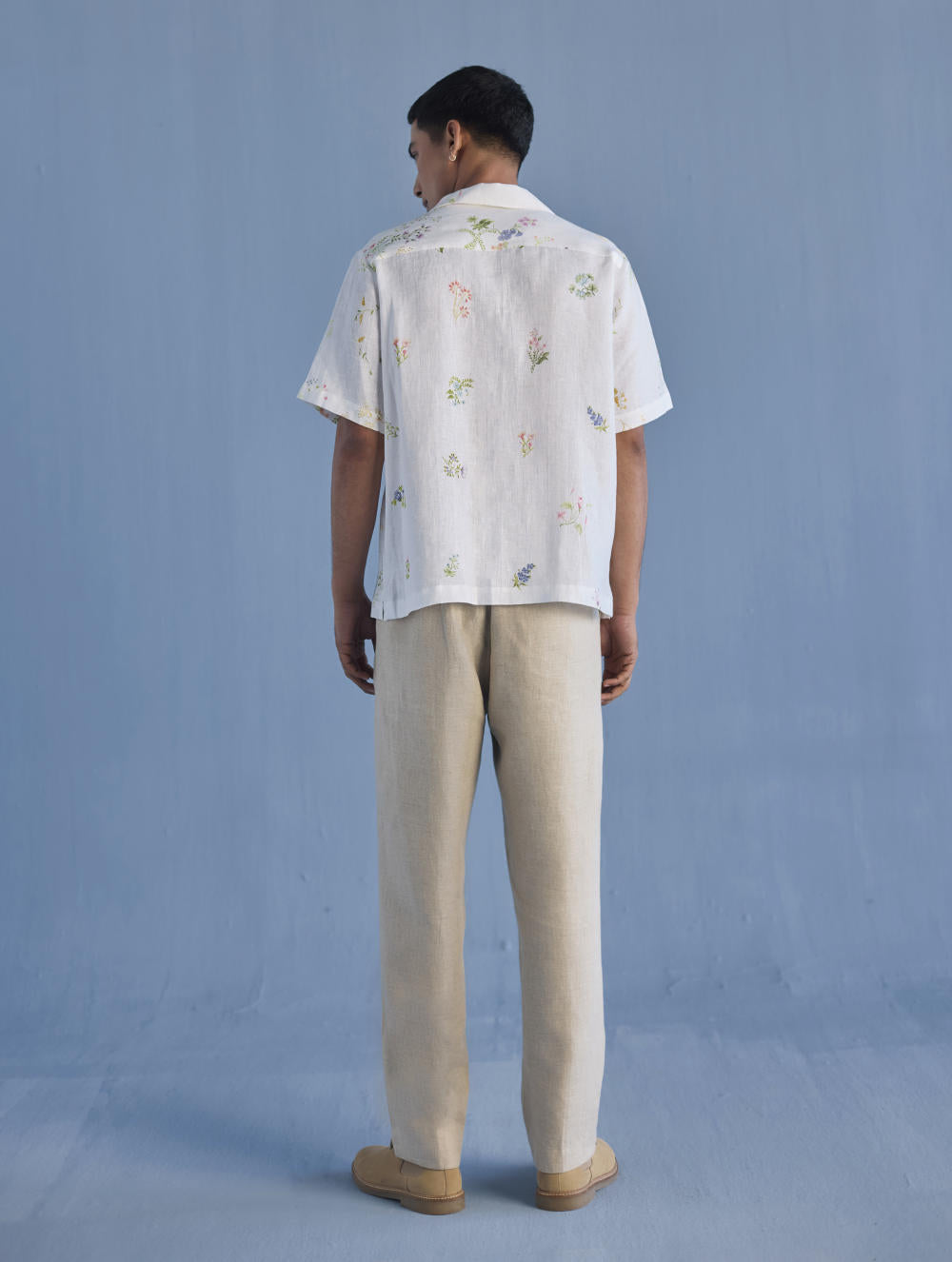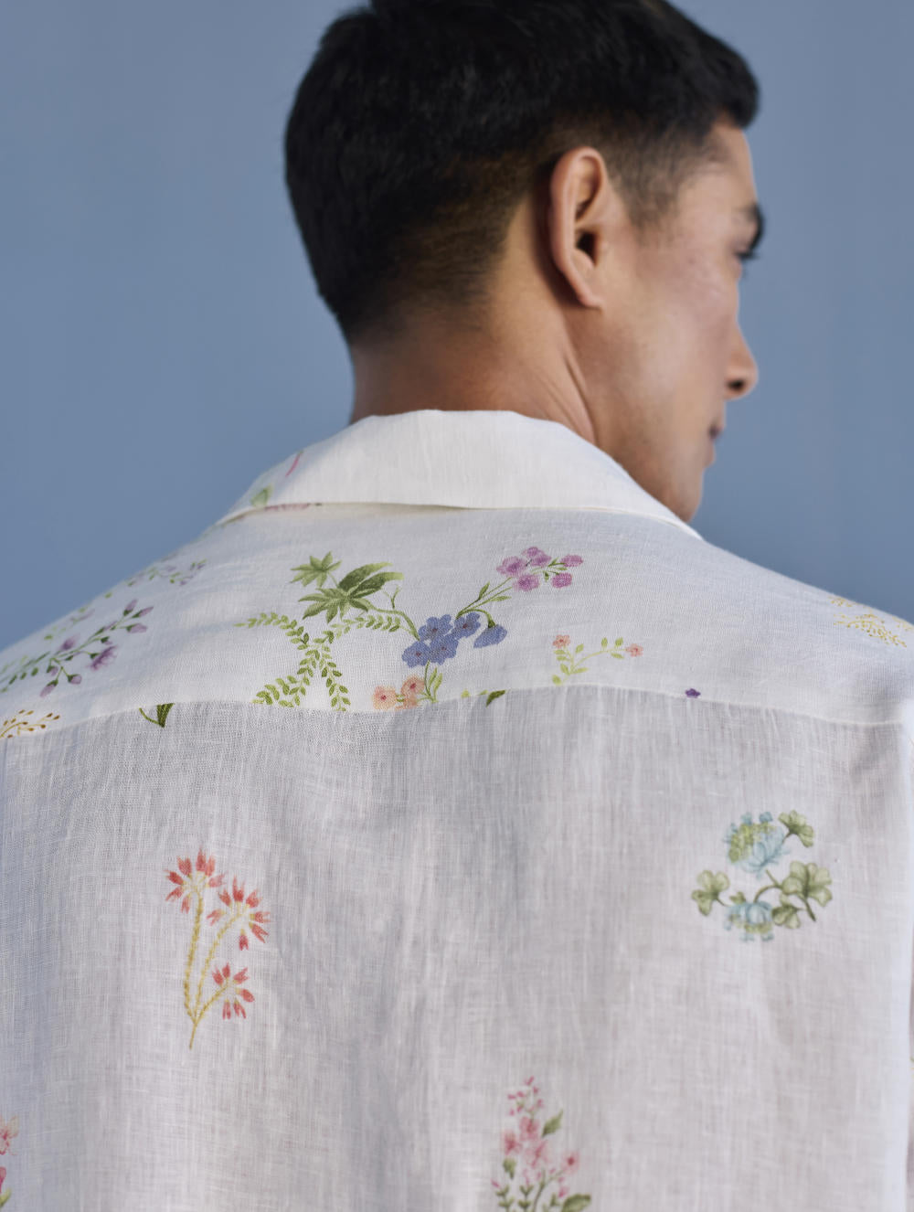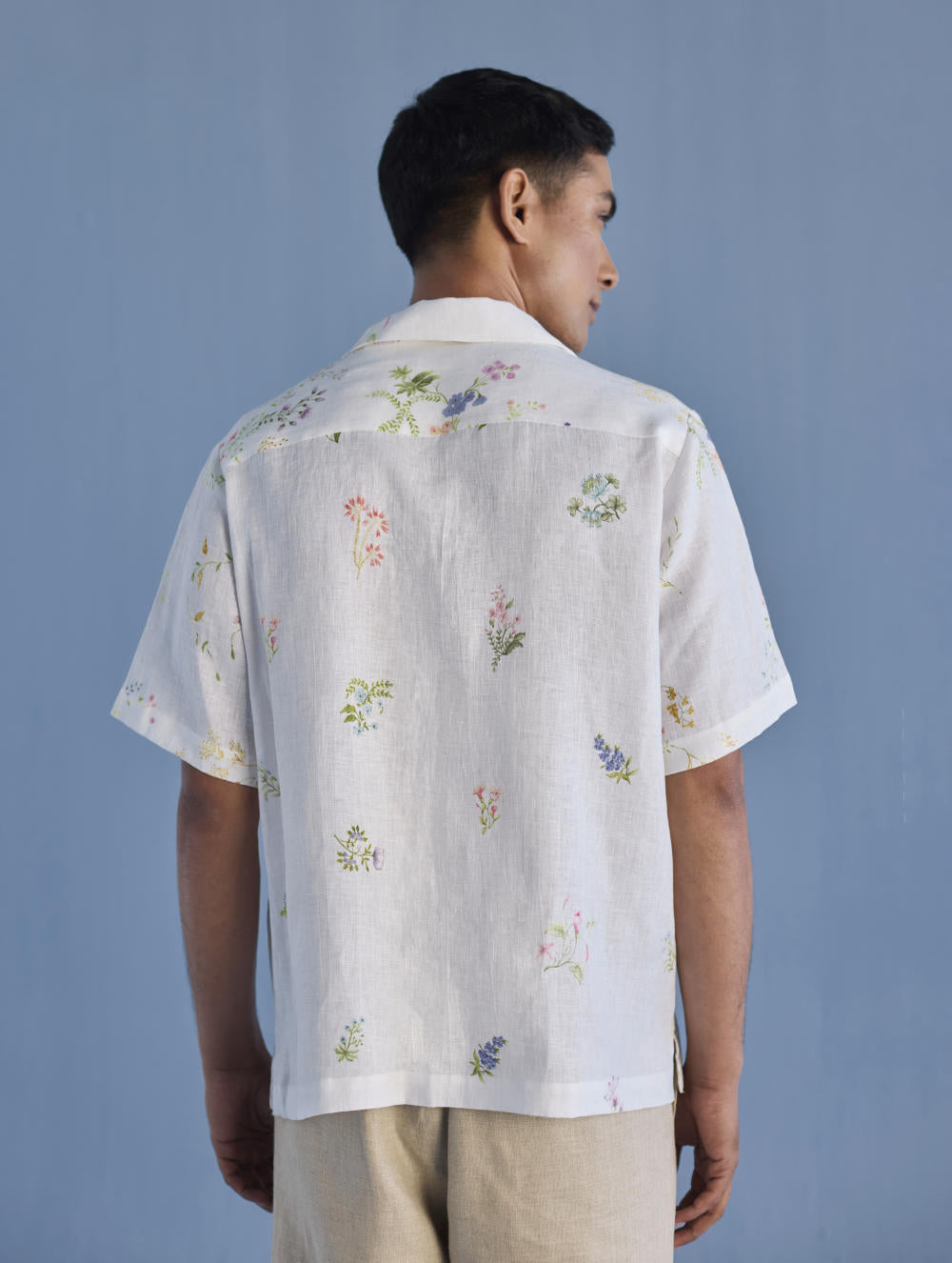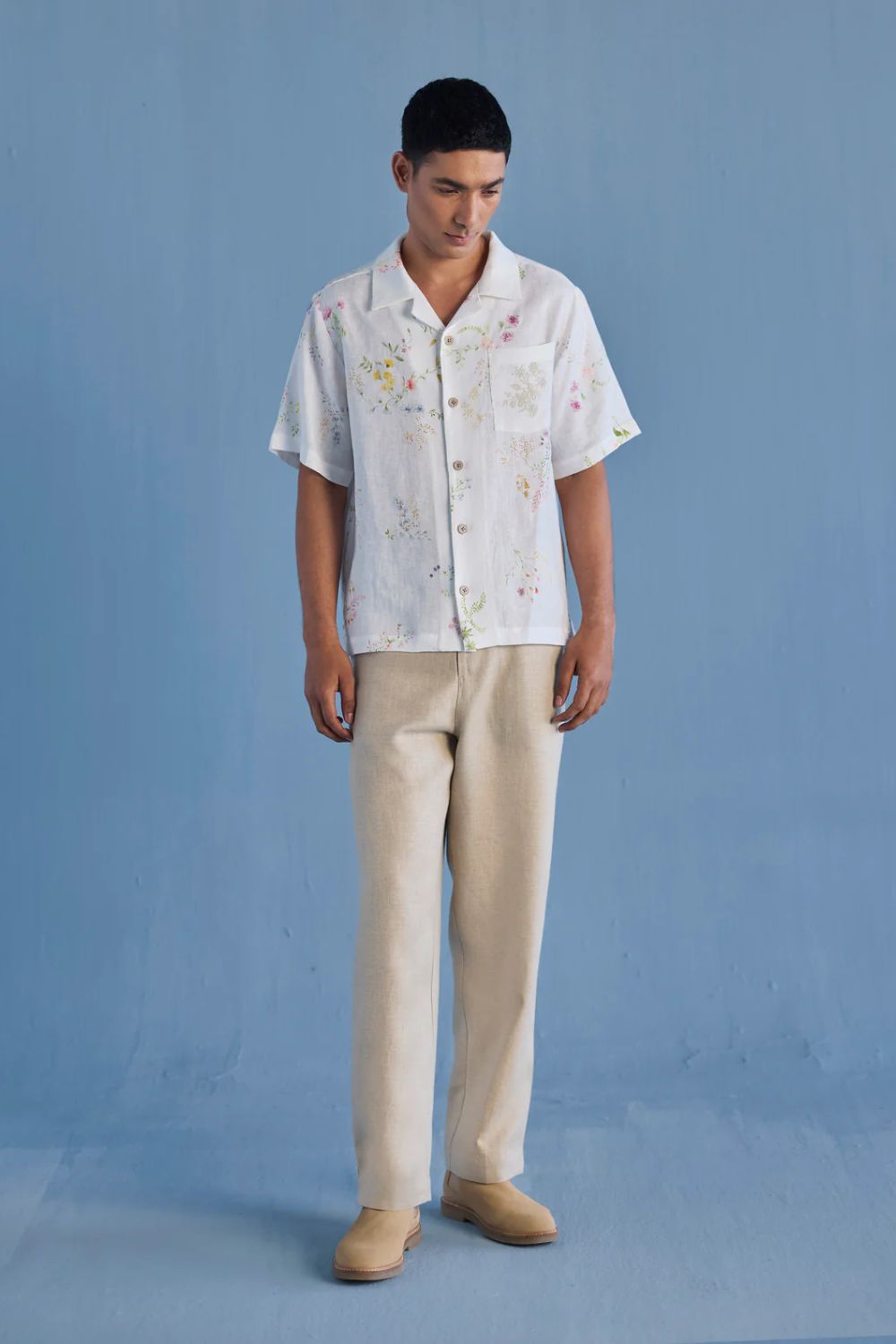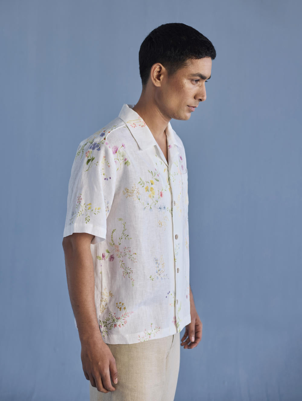 A modern short sleeve shirt with a one piece collar which can also be worn open, like a cuban collar, designed in a hand-painted floral print styled with a hand-embroidered floral motif on the pocket with tonal coloured beads. Our take on a fun and different summer shirt for men.