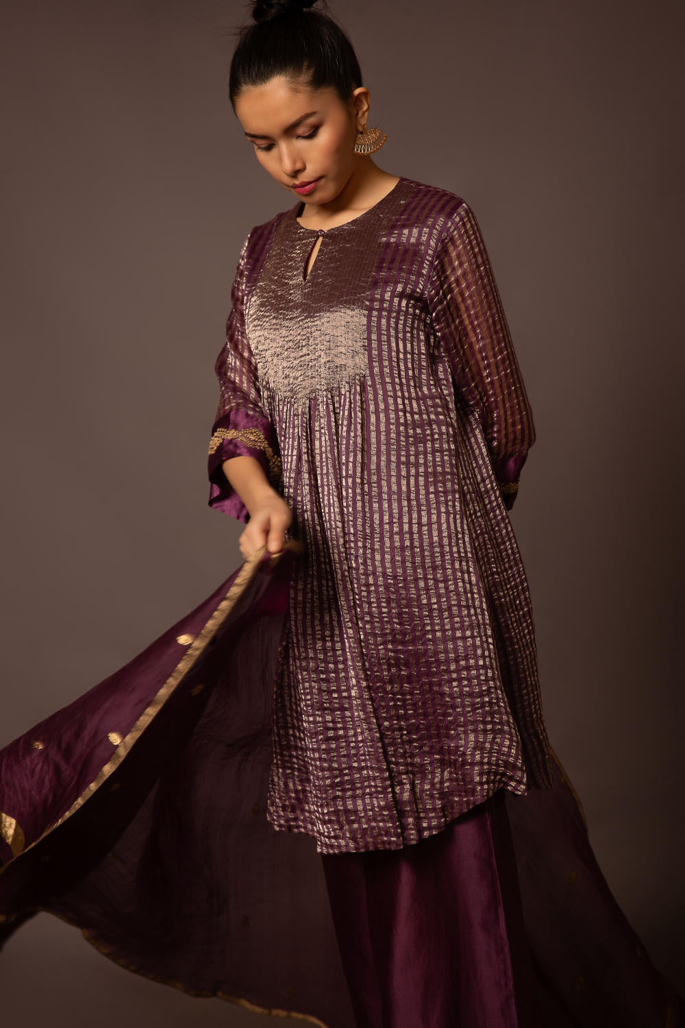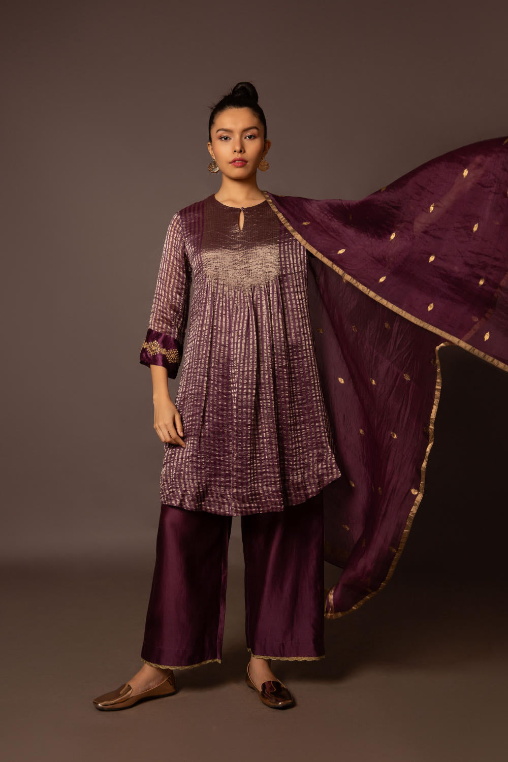 Jewel toned Benerasi Zari Striped Pintucked kurta with handwork at sleeve hem with Benerasi buti dupatta and pants