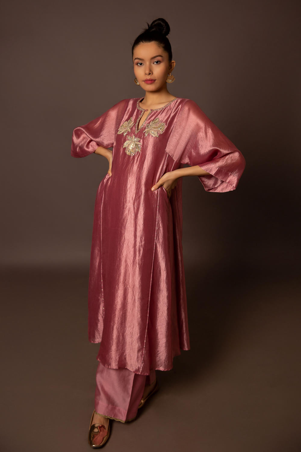 Hand dyed Dupion silk kurta with pitta handwork at neck and side panels with pants.