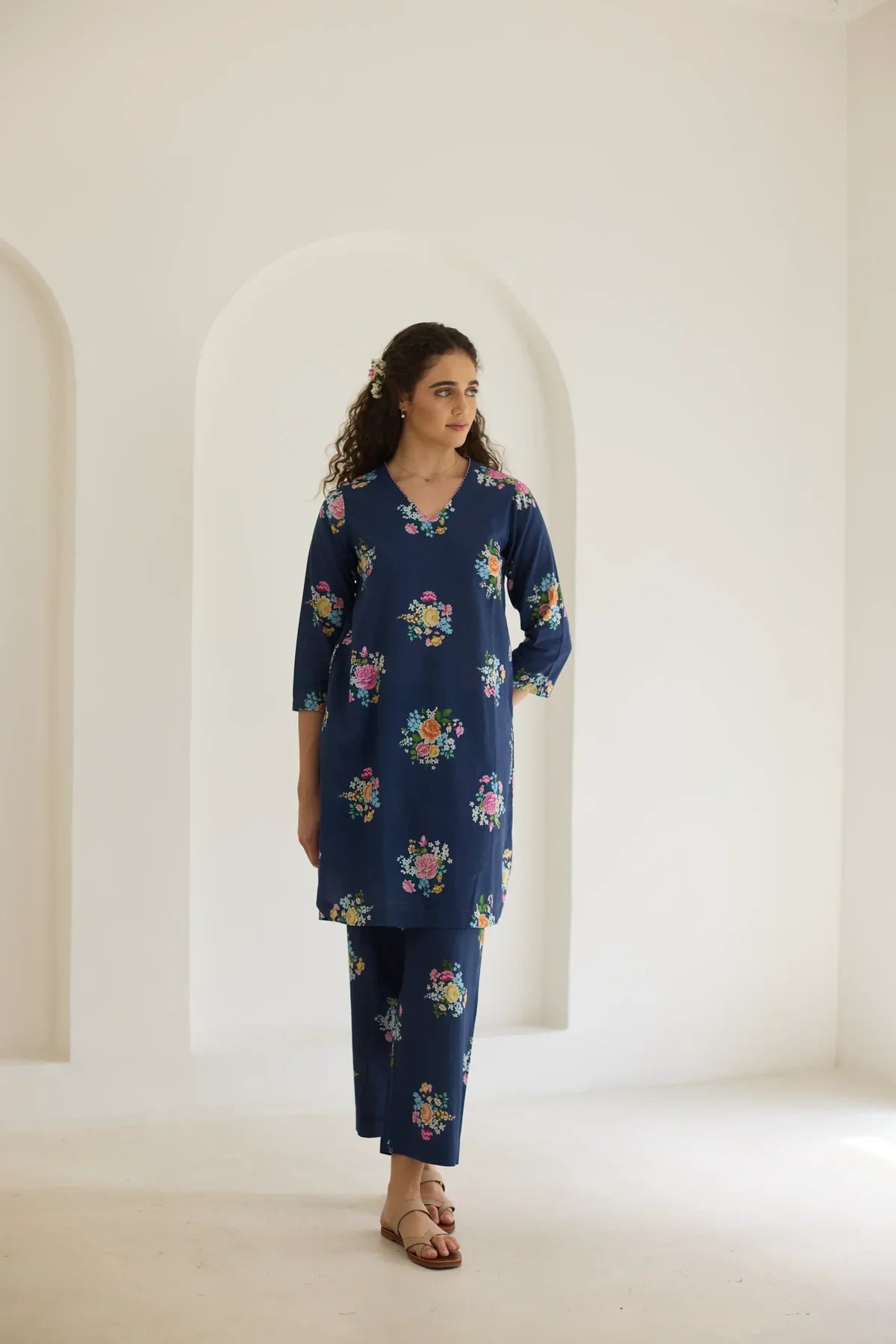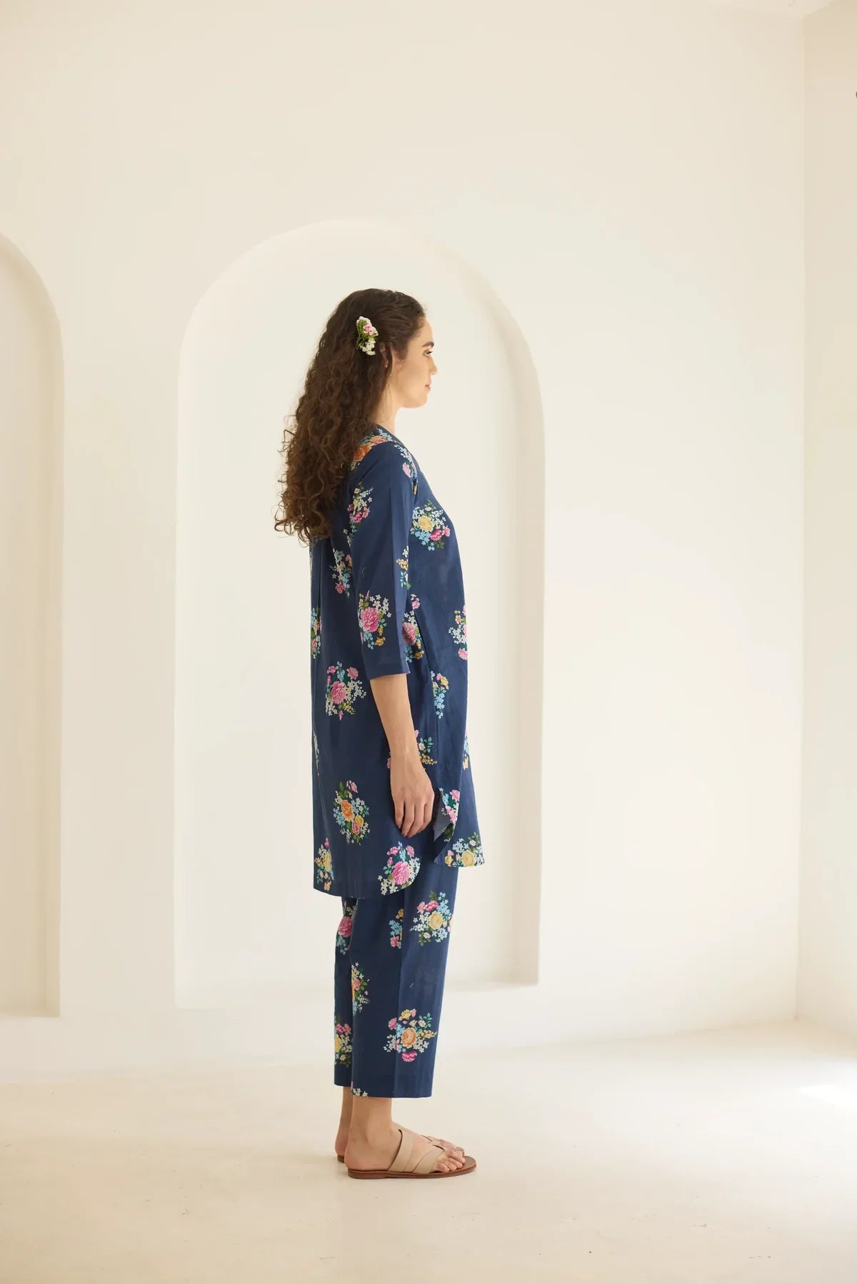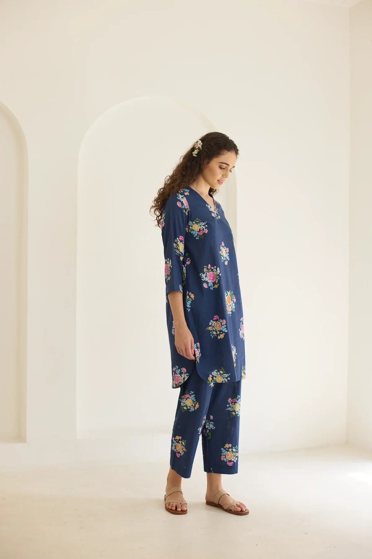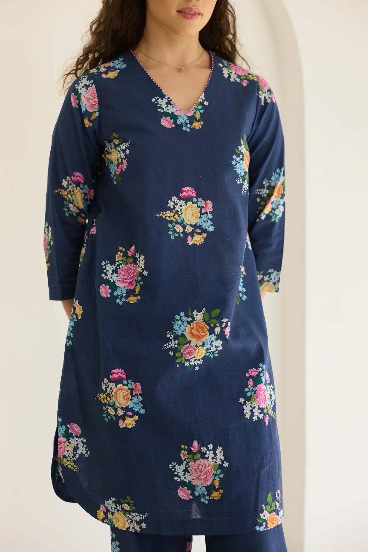 Featuring a flower bunch print in deep blue, it lends a beautiful tribute to nature's vibrant tapestry. A bunch of flowers, depict the harmony of diverse beauty, evoking feelings of warmth, connection, and celebration.