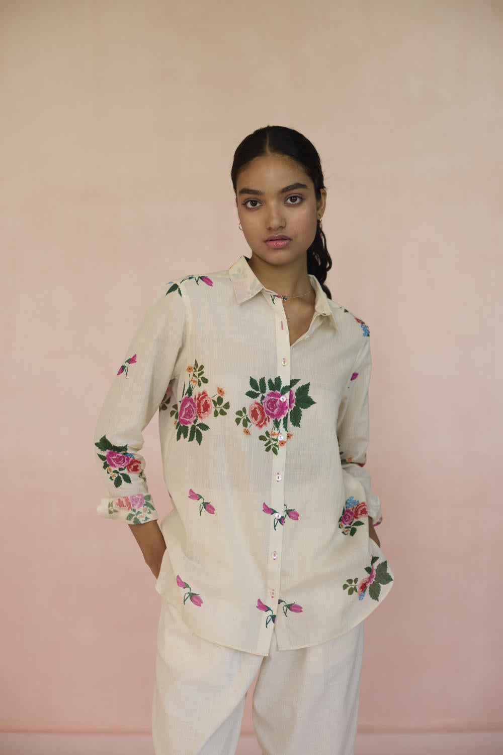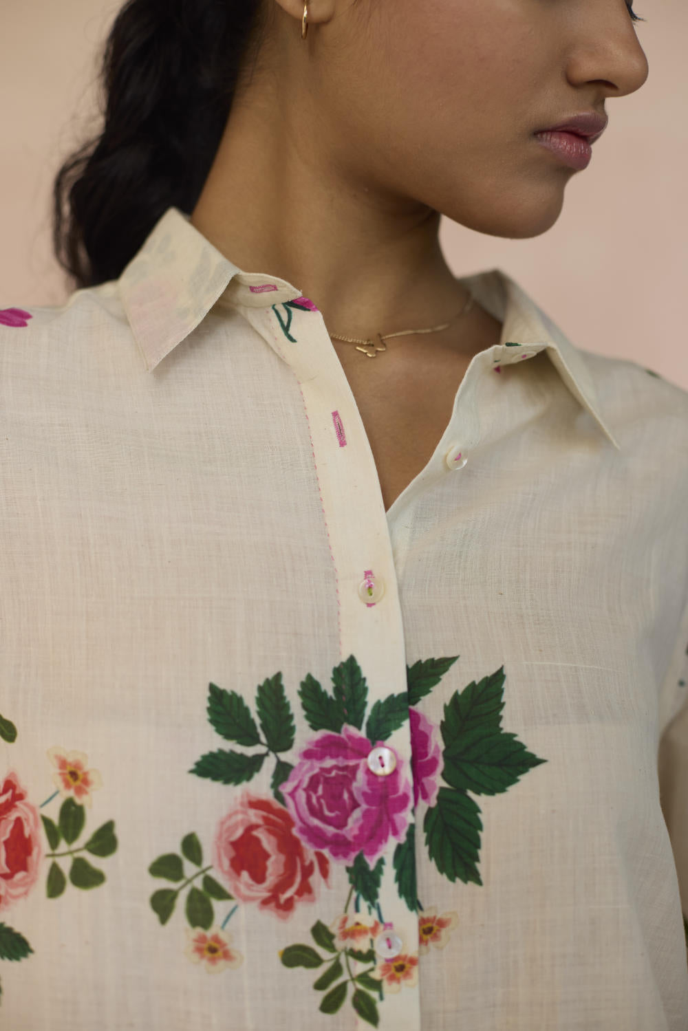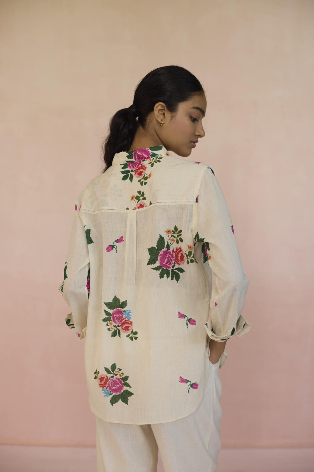 Our Rose Chintz shirt with its vibrant bloom, weaves together elegance and nostalgia. The roses symbolise romance, grace, and beauty in full bloom. This floral motif captures the essence of heritage, offering a refined yet sophisticated feel. The shirt is made with 100% handspun, handwoven cotton that lends grace and form to the fabric. Hand-sewn shell buttons and hand-swen seams adds a touch of individuality. The soft, yet durable cotton drapes effortlessly, offering comfort without compromising on style. This is a wardrobe staple.