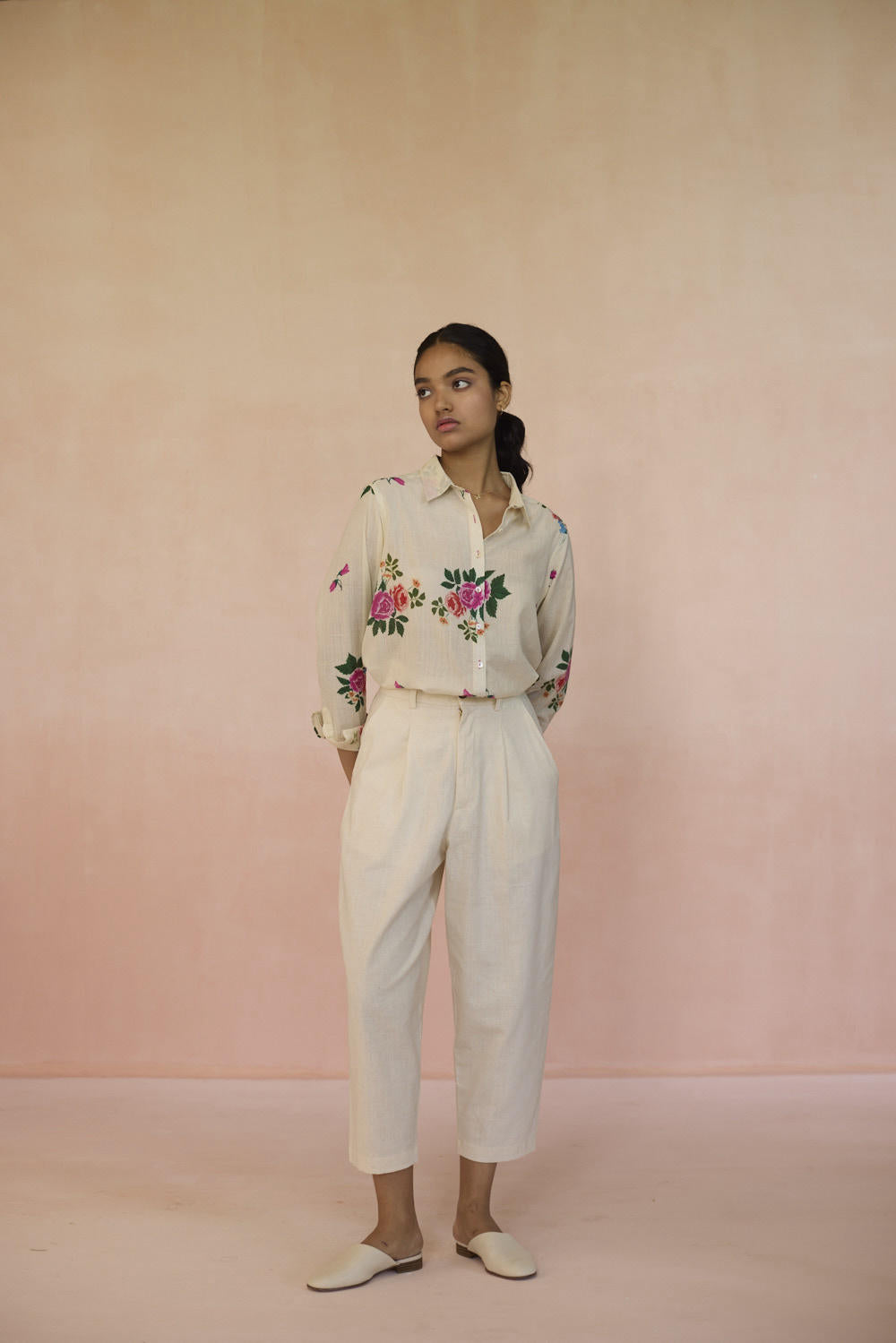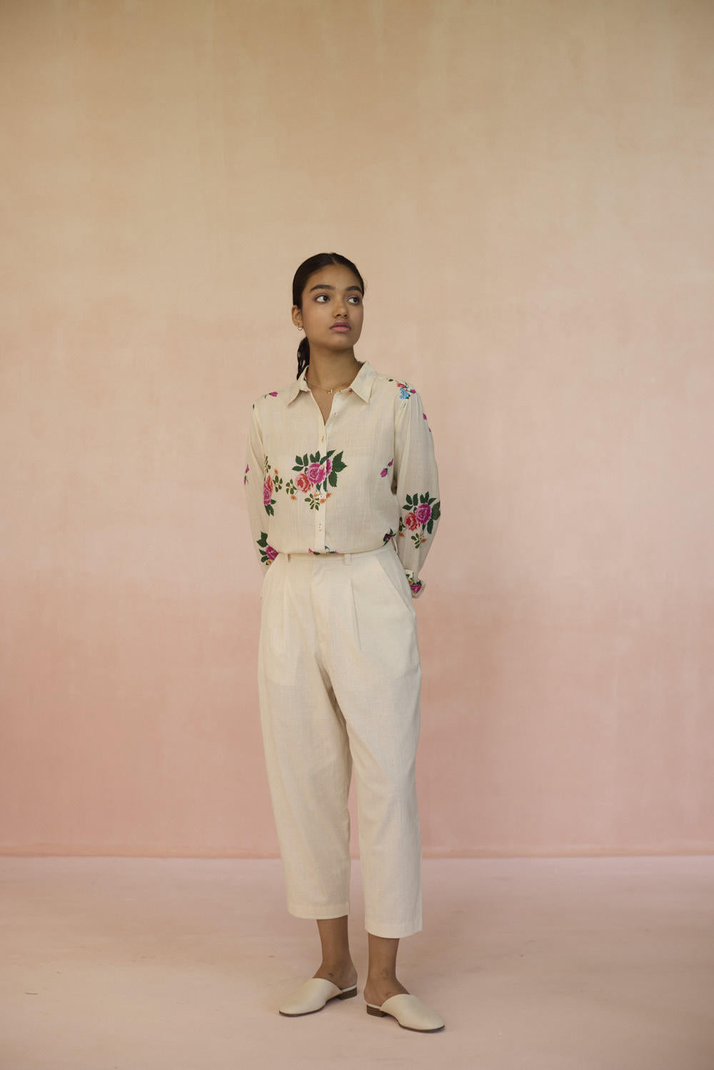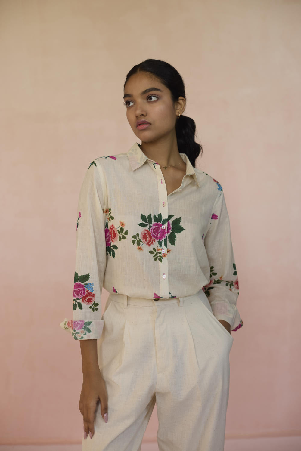 Our Rose Chintz shirt with its vibrant bloom, weaves together elegance and nostalgia. The roses symbolise romance, grace, and beauty in full bloom. This floral motif captures the essence of heritage, offering a refined yet sophisticated feel. The shirt is made with 100% handspun, handwoven cotton that lends grace and form to the fabric. Hand-sewn shell buttons and hand-swen seams adds a touch of individuality. The soft, yet durable cotton drapes effortlessly, offering comfort without compromising on style. This is a wardrobe staple.