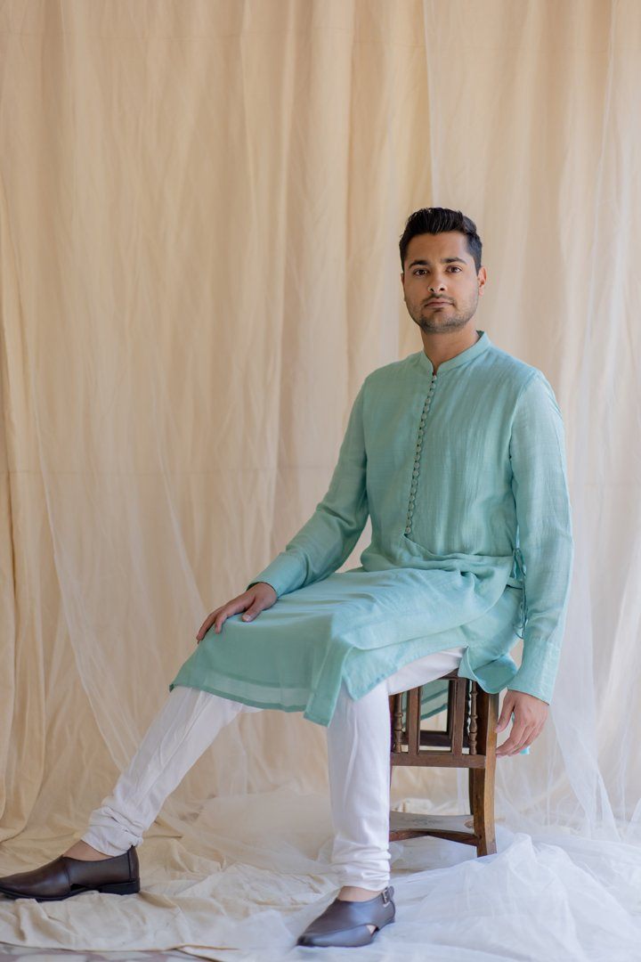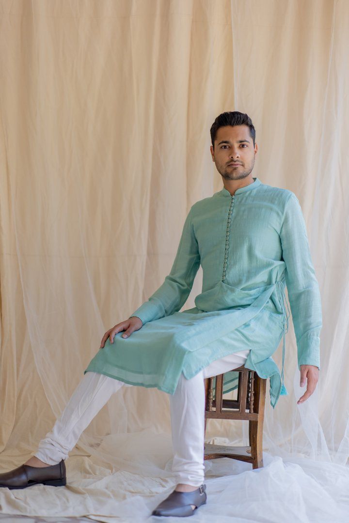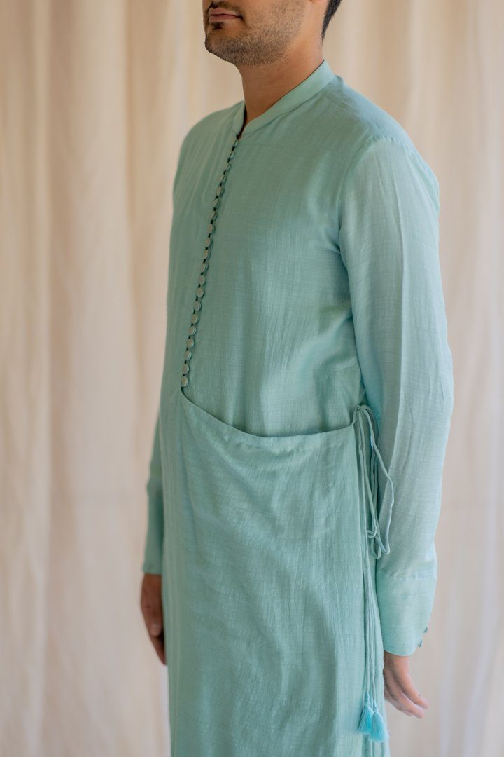 Knee-length coat for men. Upper half is similar to a western style coat and lower part resembles an angrakha. Buttoned down Angrakha with tie up at the waist.