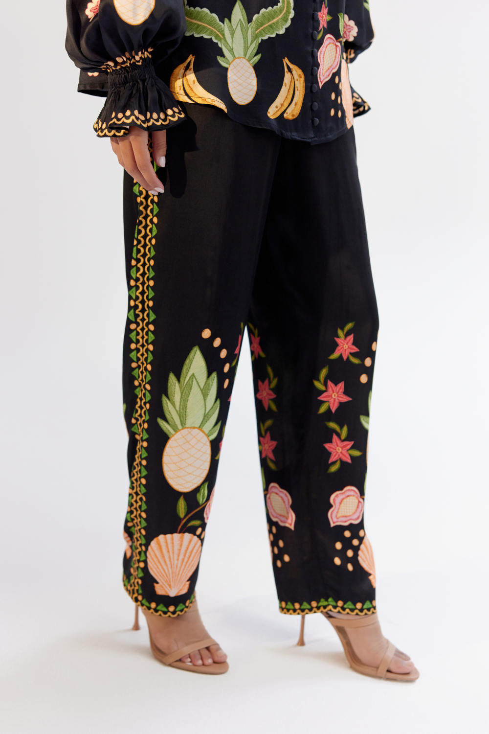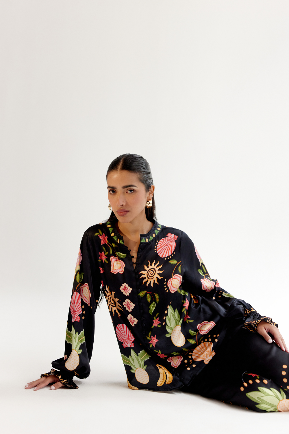 Introducing the Ilia Shirt and Pants Set that brings effortless sophistication with a touch of playful charm. Crafted from luxurious modal satin, this coordinated set features intricate placement printing in the elegant Seashell (Black) design, offering a refined, statement look. The shirt is detailed with a pleated collar and delicate ruffled sleeves, adding texture and femininity to the silhouette. Thoughtfully designed, the button loops are crafted from durable anchor thread, blending craftsmanship with style.