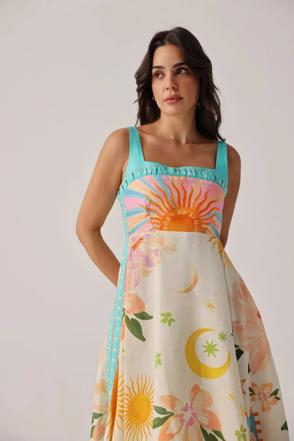 Sleeveless midi dress silhouette with tie-up straps finished with handmade tassels