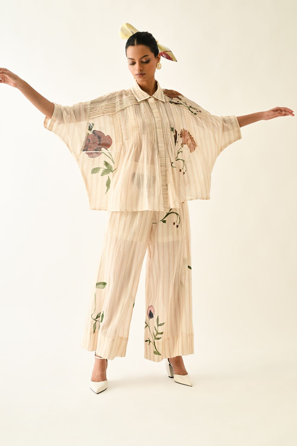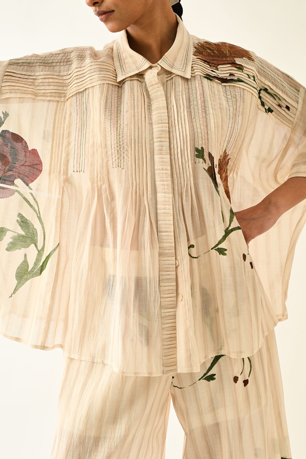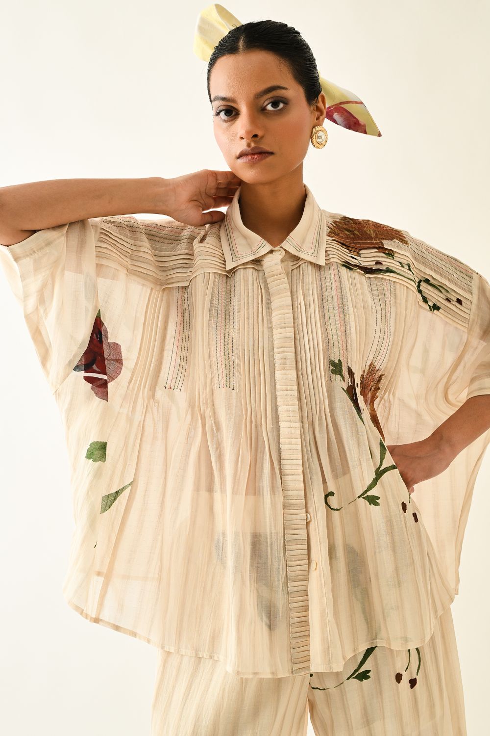 Top: Anti fit, short sleeved top, relaxed fit, vertical pin tucks on front, hand-painted abstract expressionist digitally transferred print, crafted from lightweight textiles. this piece offers both comfort and understated elegance. Print may vary- Single piece.