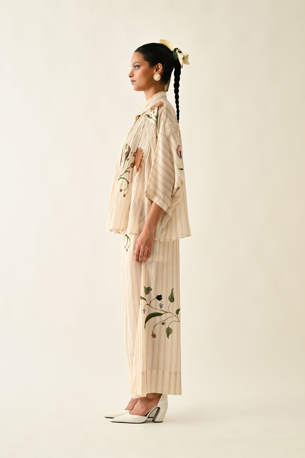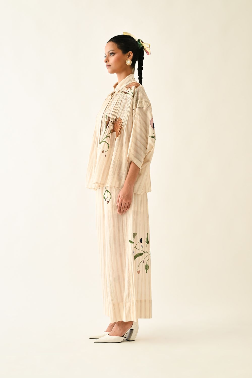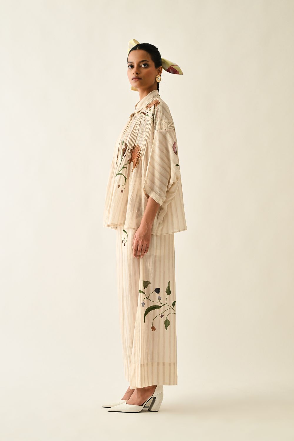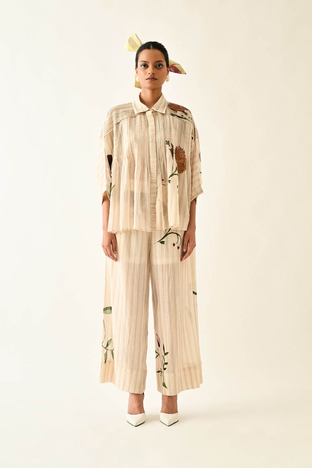Top: Anti fit, short sleeved top, relaxed fit, vertical pin tucks on front, hand-painted abstract expressionist digitally transferred print, crafted from lightweight textiles. this piece offers both comfort and understated elegance. Print may vary- Single piece.