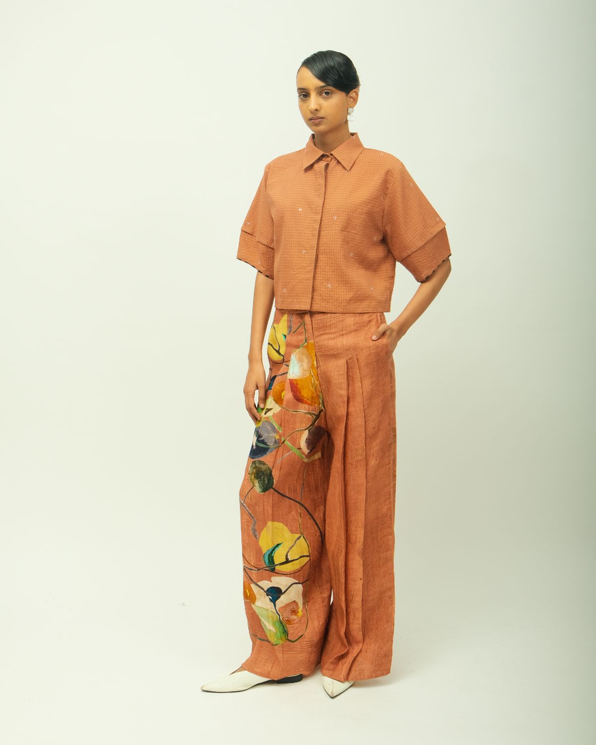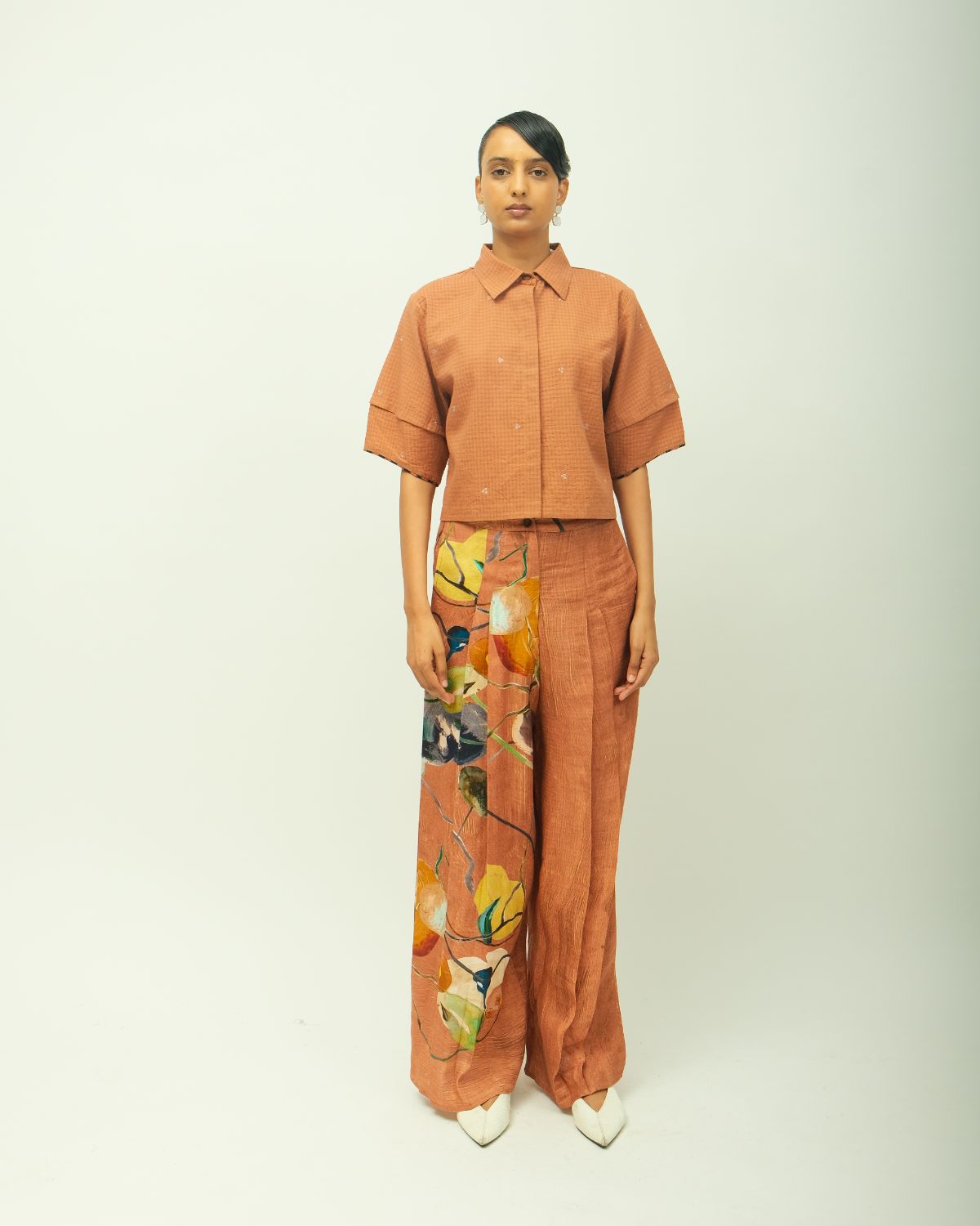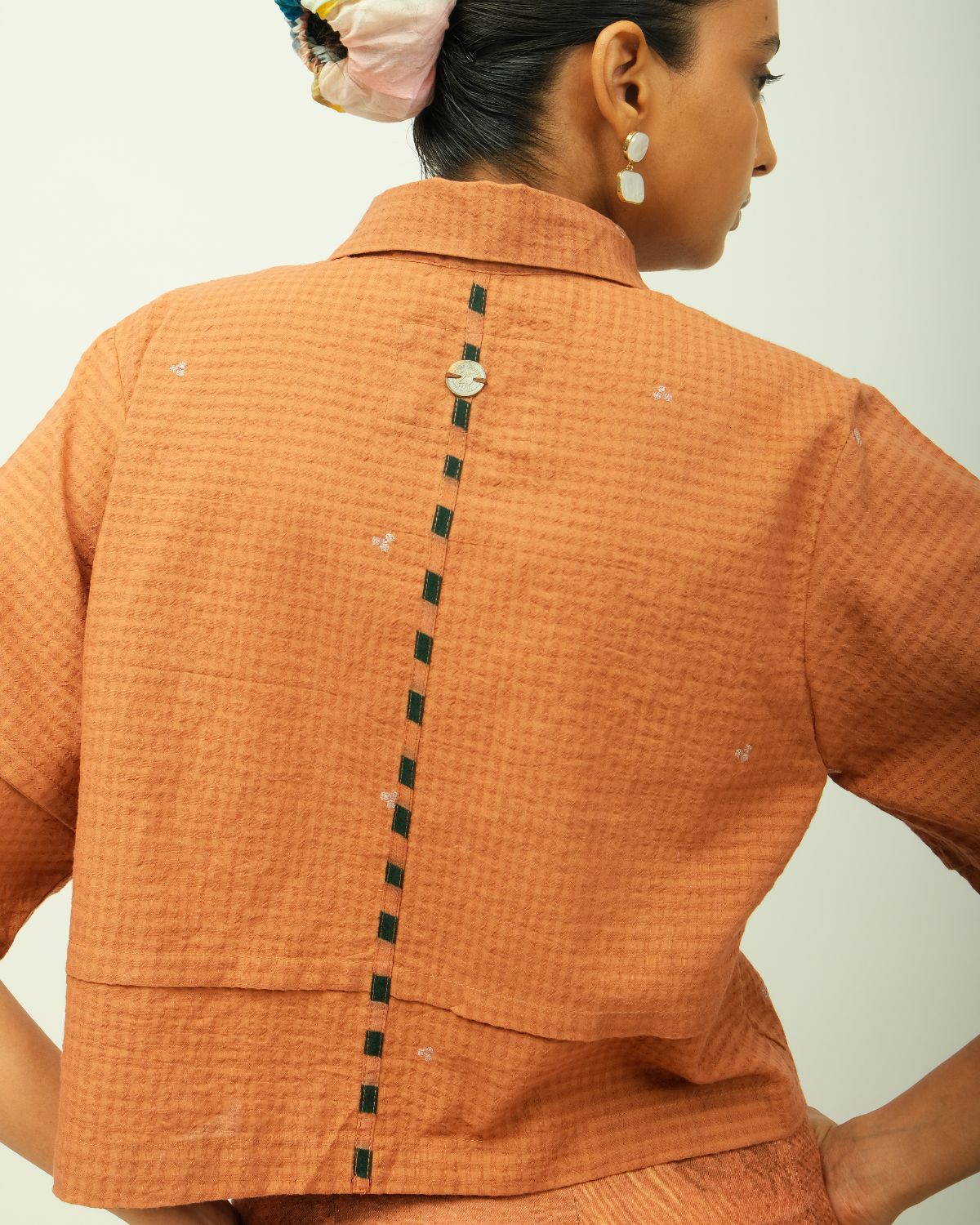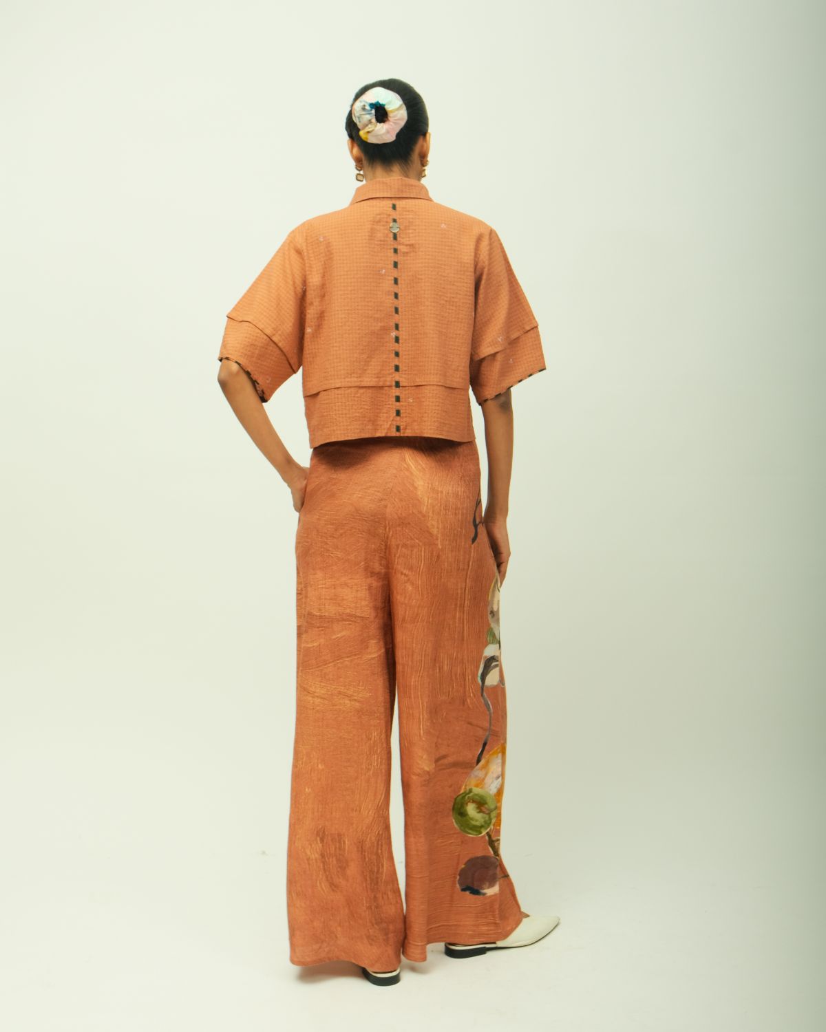 Cropped top, V-neckline,full placket, short sleeves, bead detailing, horizontal seam detail, the outfit is made from lightweight textiles, Variations in color, texture, and weave are inherent due to the hand-made nature of the garment- Single piece. Garment Length - 18"