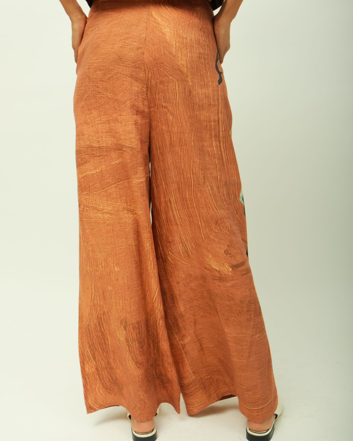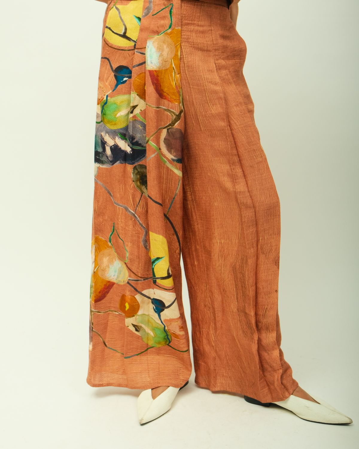 Lower: Anti fit, front belt, comes with drawstring, back elasticated lowers, flared fit, hand-painted abstract expressionist digitally transferred print, side pockets, variations in color, texture, and weave are inherent due to the hand-made nature of the garment. Print placements will vary—single Piece.