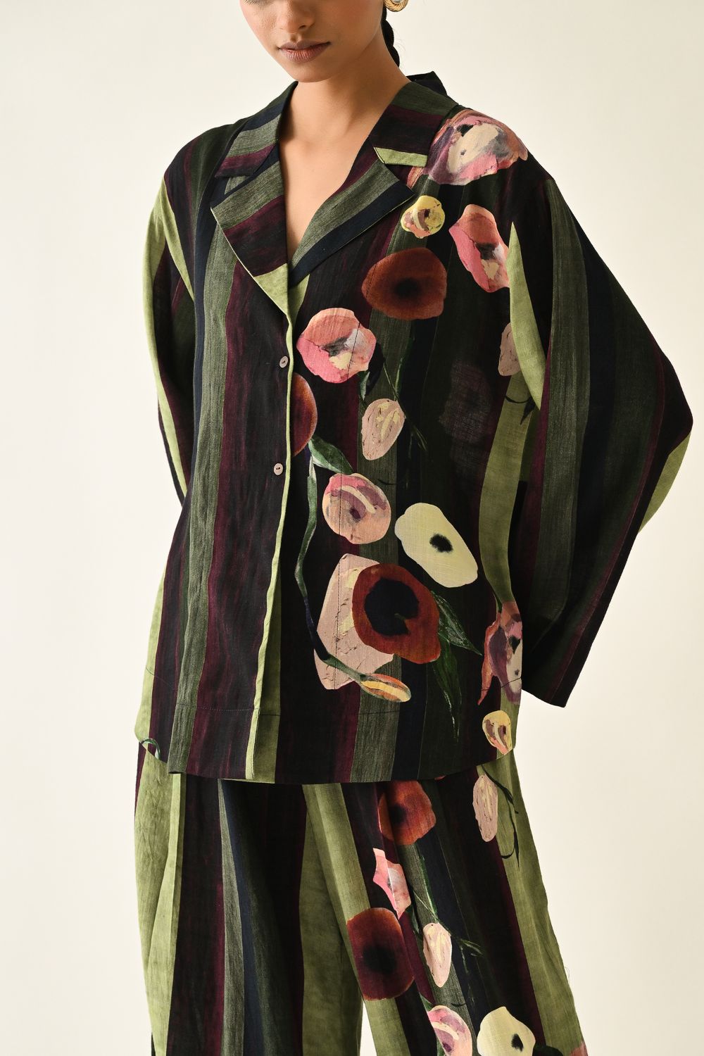 Jacket: Anti-fit jacket shirt is hand-painted abstract expressionist print, digitally transferred. The shirt features a lapel collar, Kimono sleeves. Print placements will vary—single piece. Model is wearing - XS/S.
