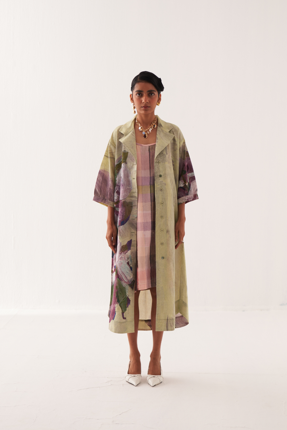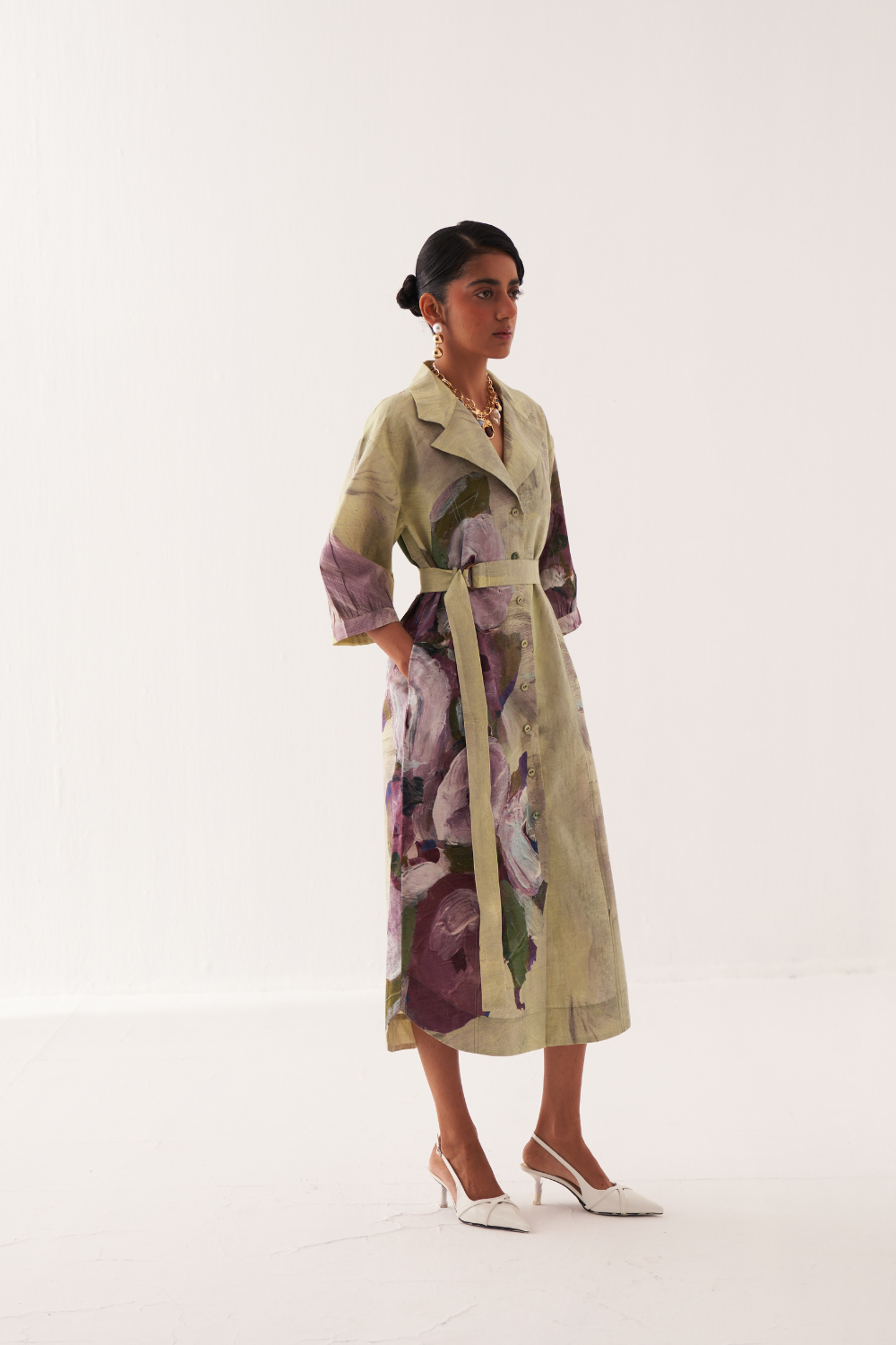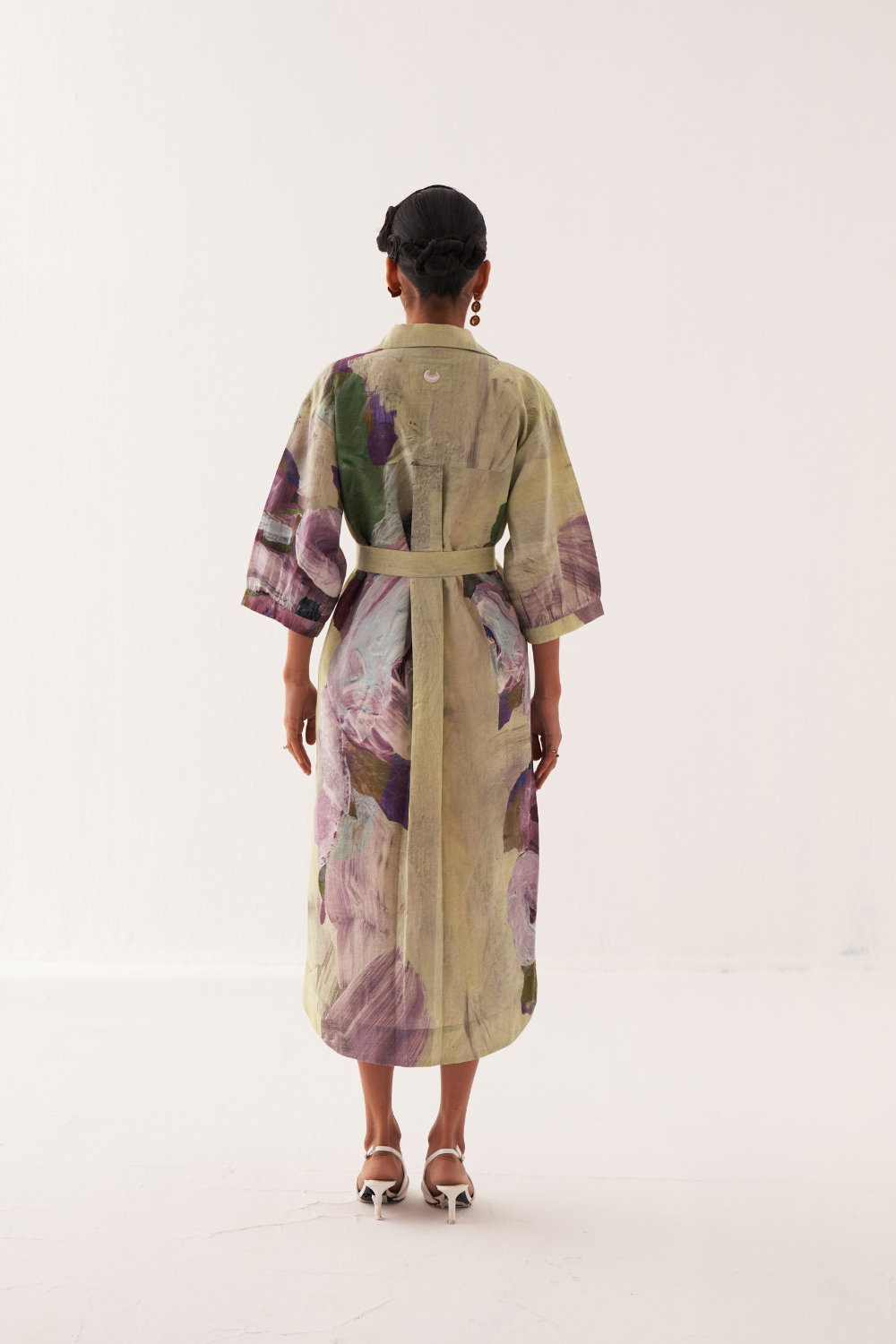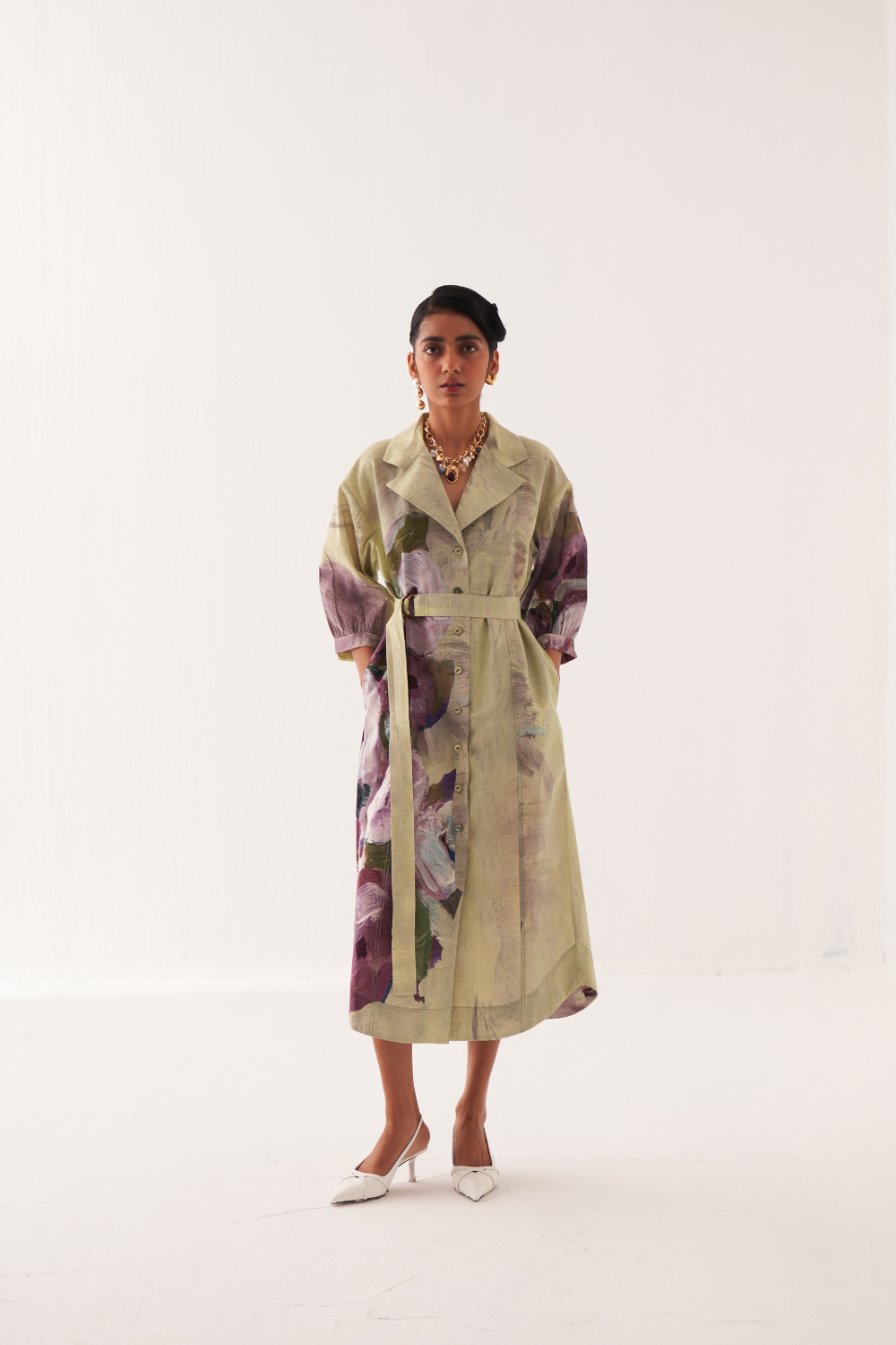 Anti-Fit Trench Dress featuring a hand-painted abstract expressionist print, digitally transferred for a unique touch with gathered sleeves, a back yoke, and a box pleat. Finished with OFR’s hand-embossed signature lune embroidery. Print placements will vary—single Piece. Model is wearing size XS/S.