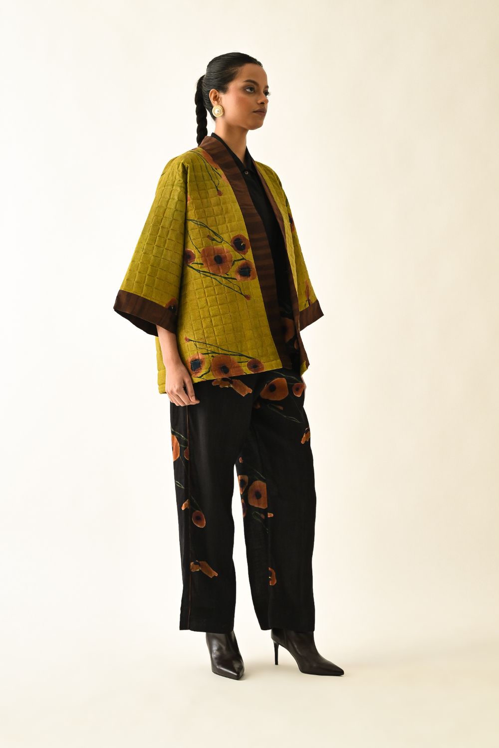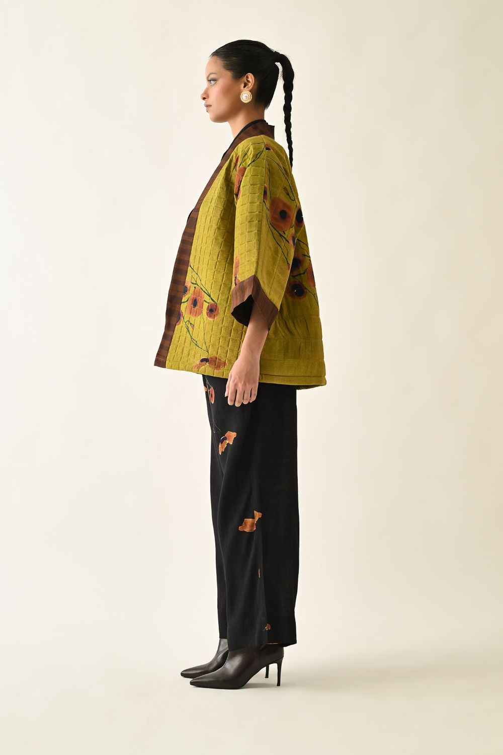Jacket: A handcrafted quilted jacket featuring a vibrant floral hand-painted pattern on a textured grid base. Designed with a relaxed, open-front silhouette and a contrasting striped lapel.
