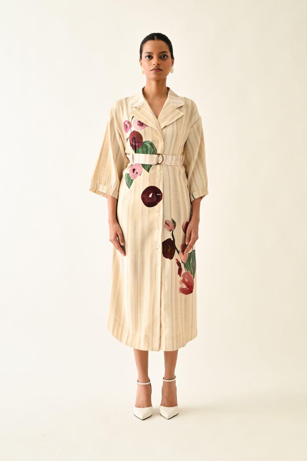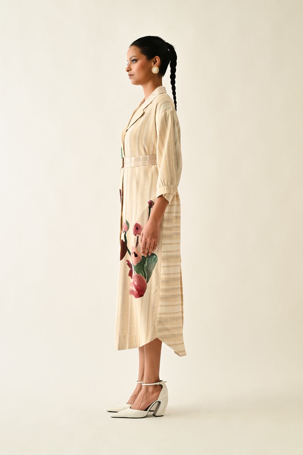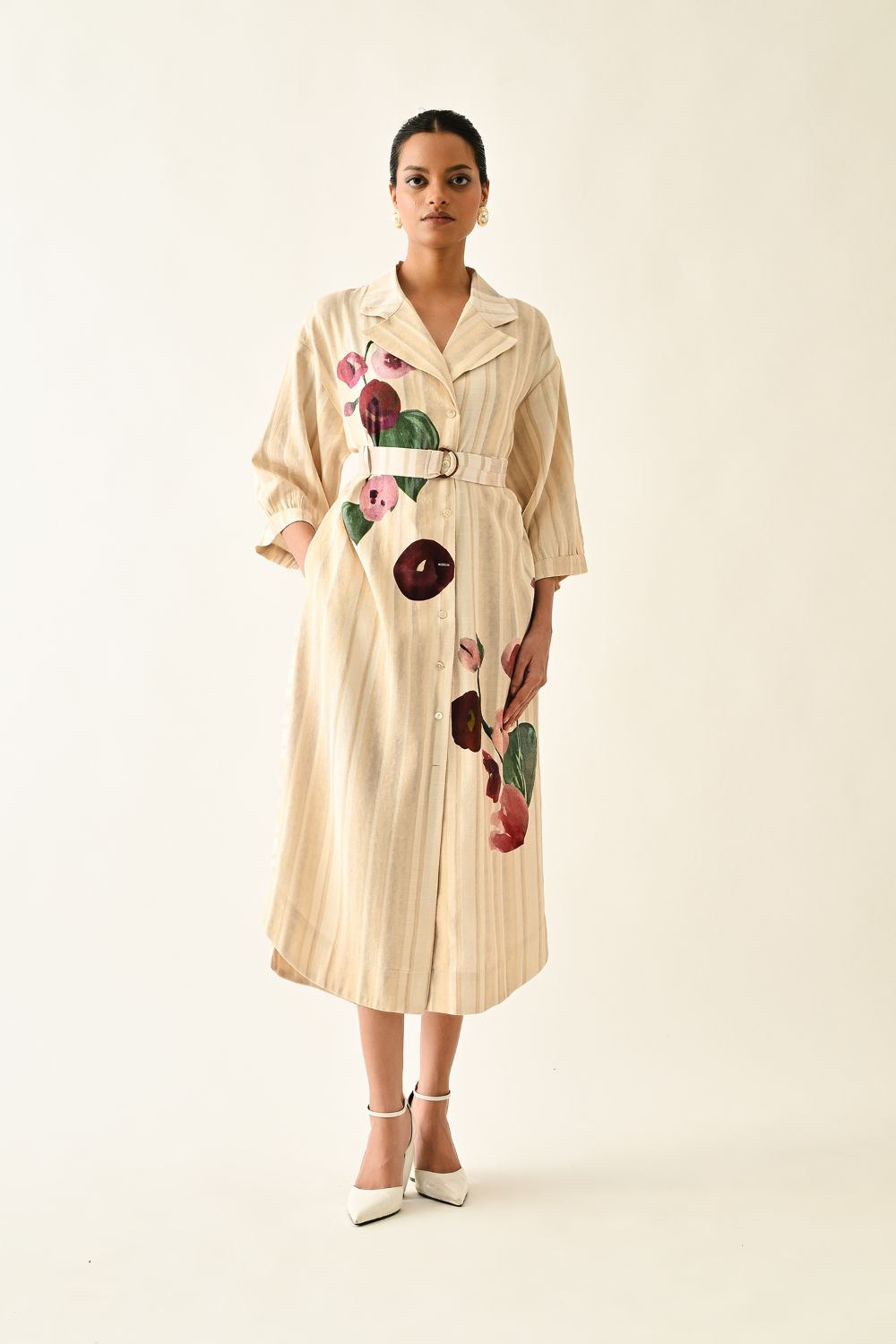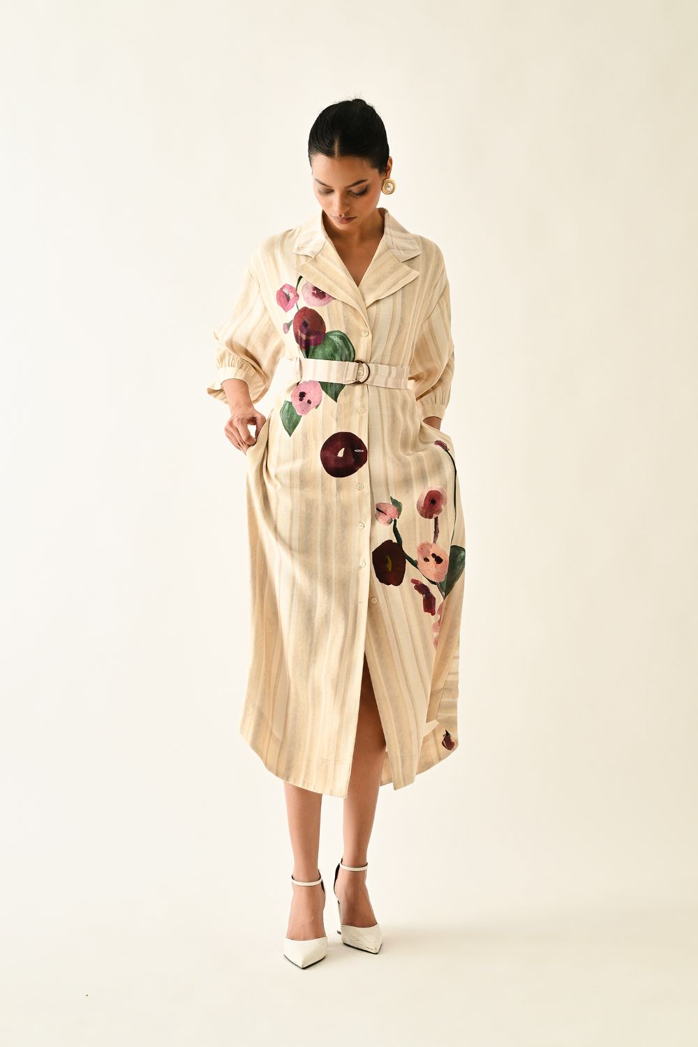 Dress: An Anti fit trench with Hand-painted abstract expressionist digitally transferred print, gathered sleeves, back yoke, box pleat at the back. Print placement will vary - single piece. Model is wearing - XS/S