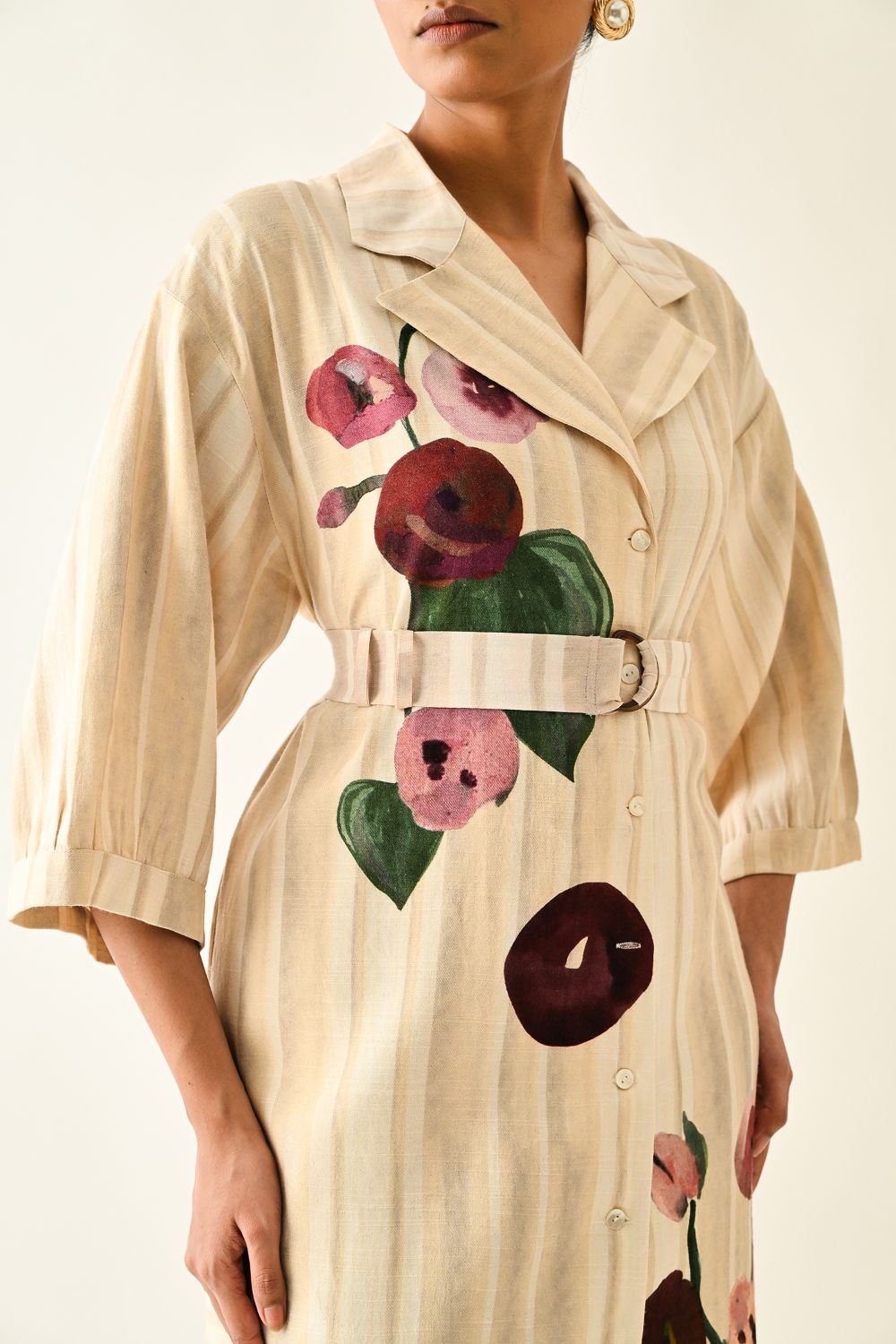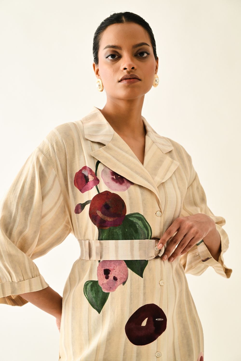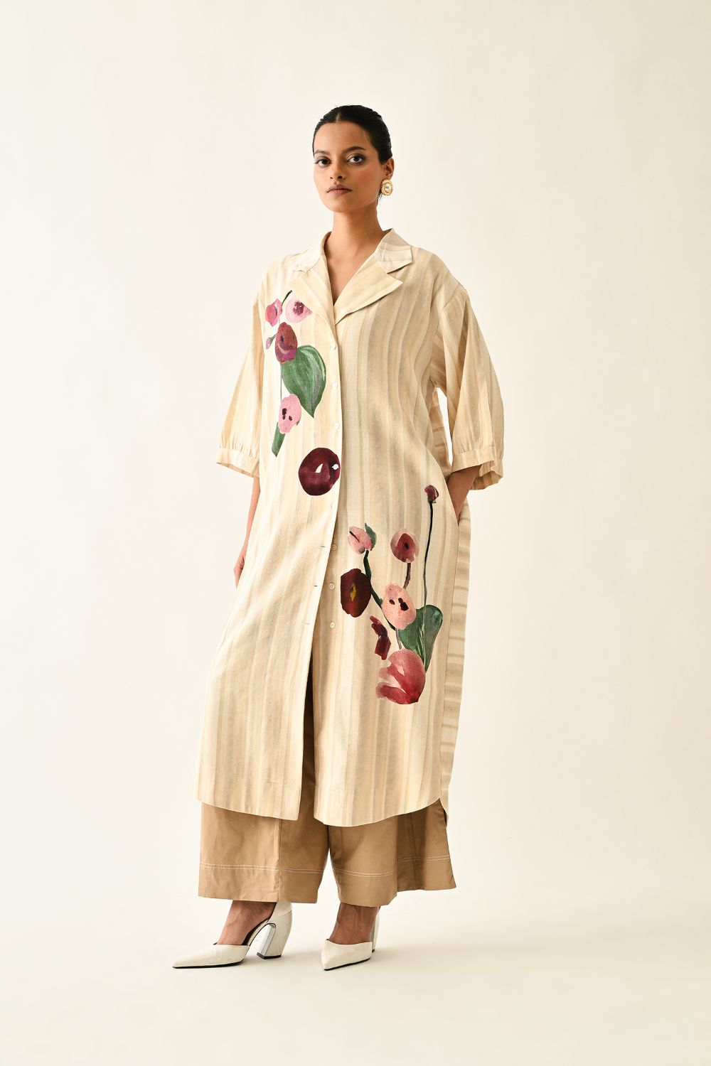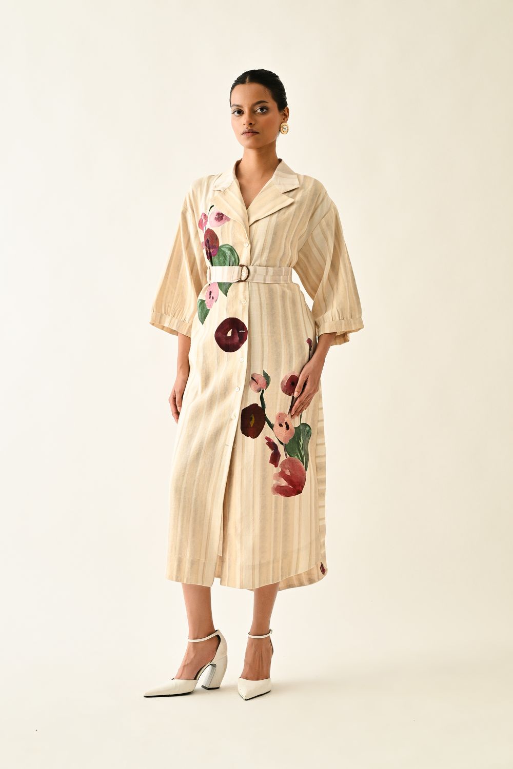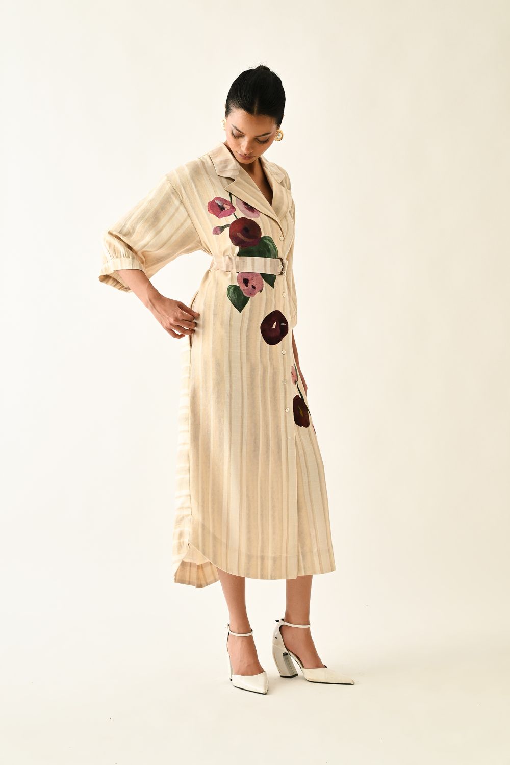 Dress: An Anti fit trench with Hand-painted abstract expressionist digitally transferred print, gathered sleeves, back yoke, box pleat at the back. Print placement will vary - single piece. Model is wearing - XS/S