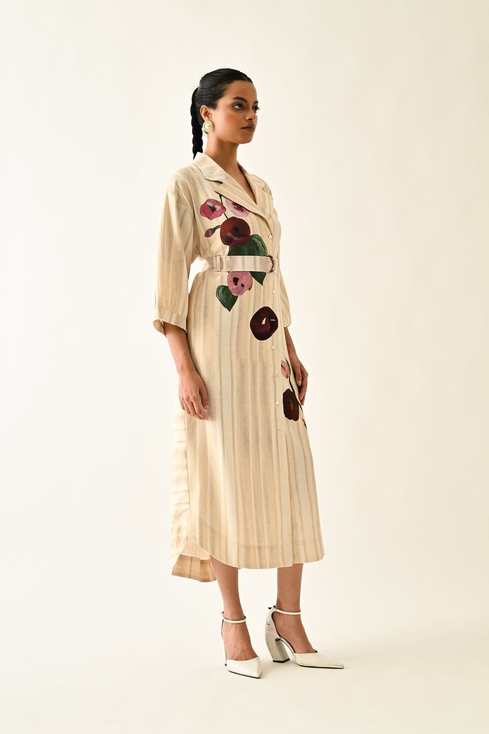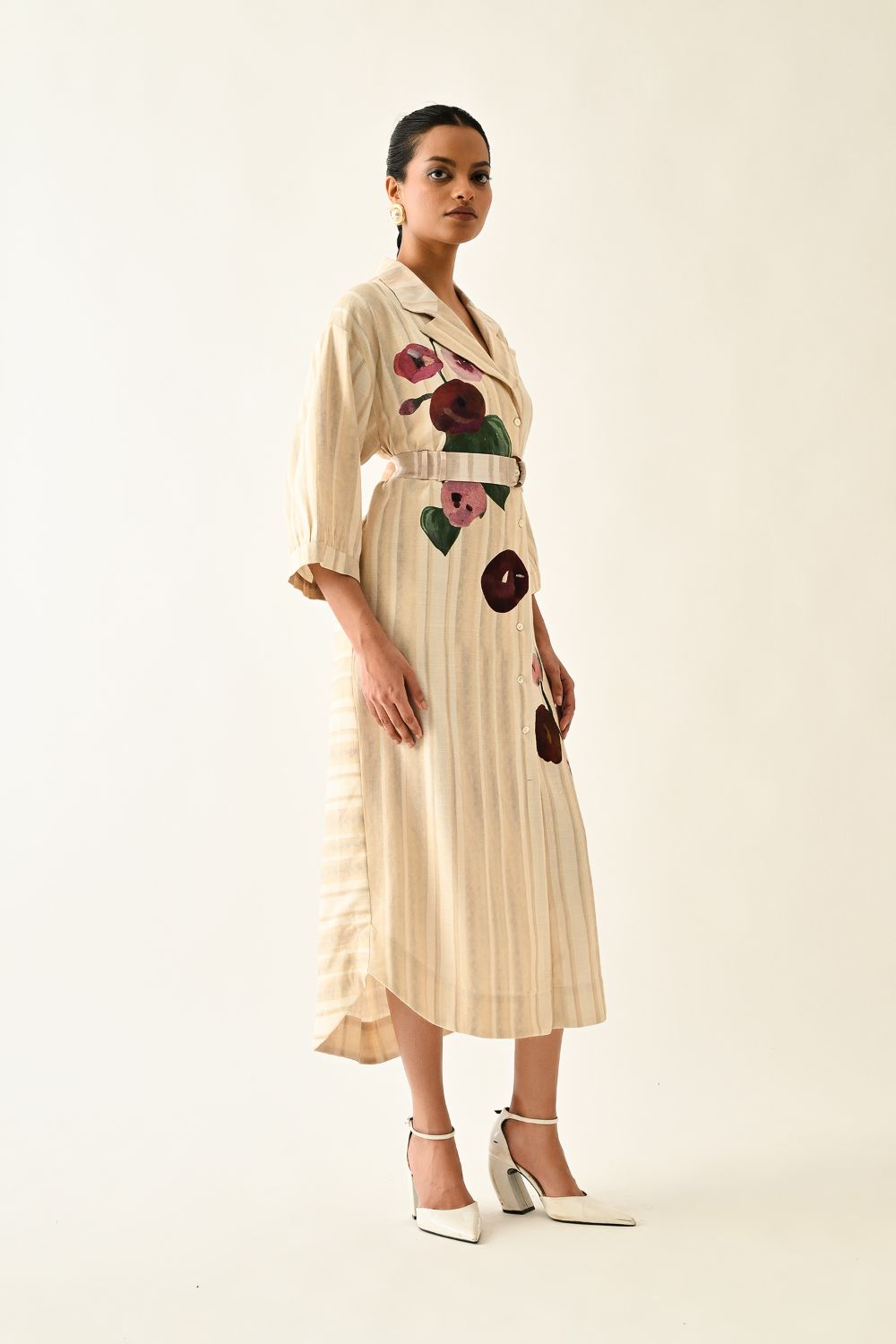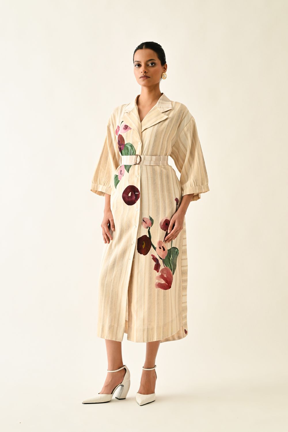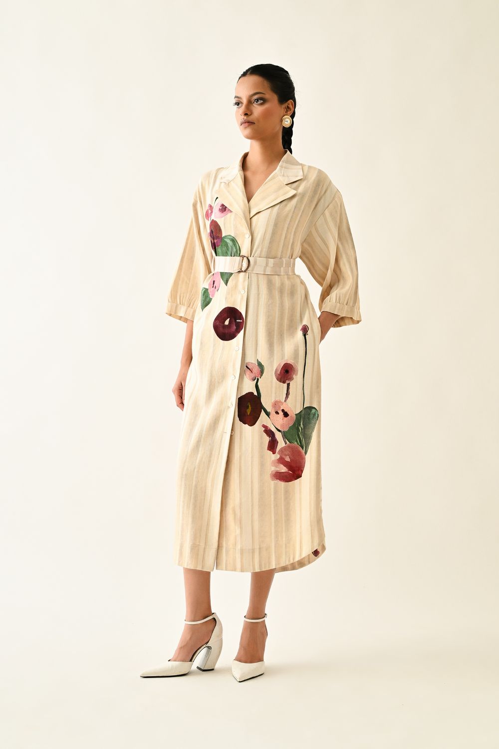 Dress: An Anti fit trench with Hand-painted abstract expressionist digitally transferred print, gathered sleeves, back yoke, box pleat at the back. Print placement will vary - single piece. Model is wearing - XS/S