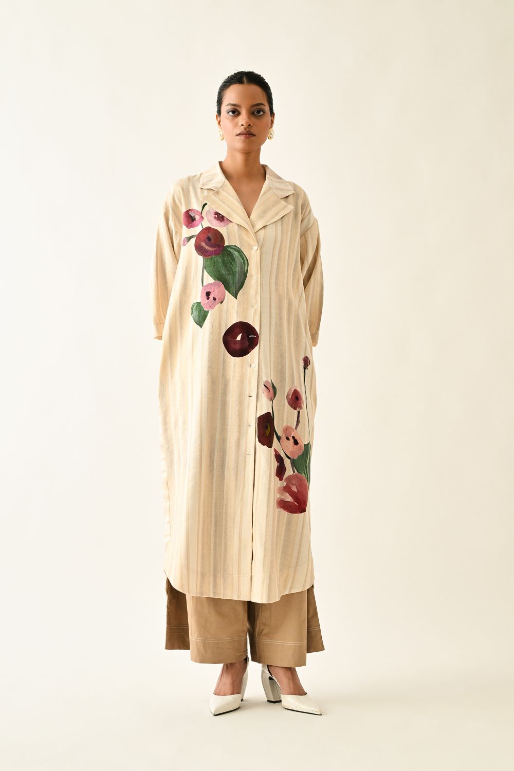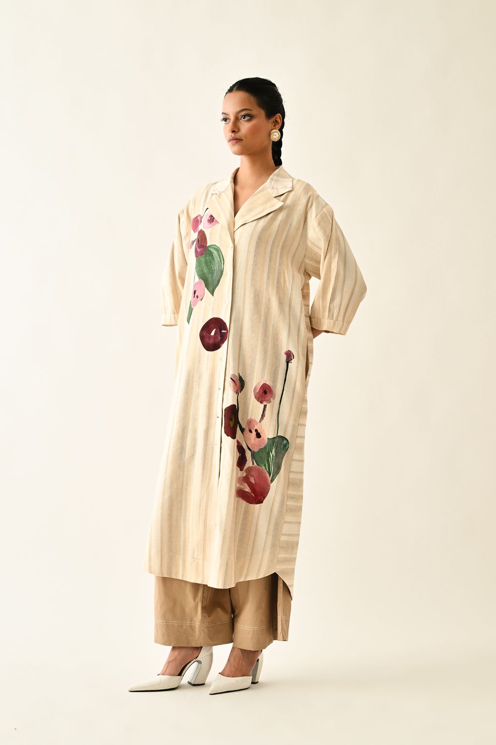 Tunic: An Anti fit trench with Hand-painted abstract expressionist digitally transferred print, gathered sleeves, back yoke, box pleat at the back. Print placement will vary - single piece. Model is wearing - XS/S