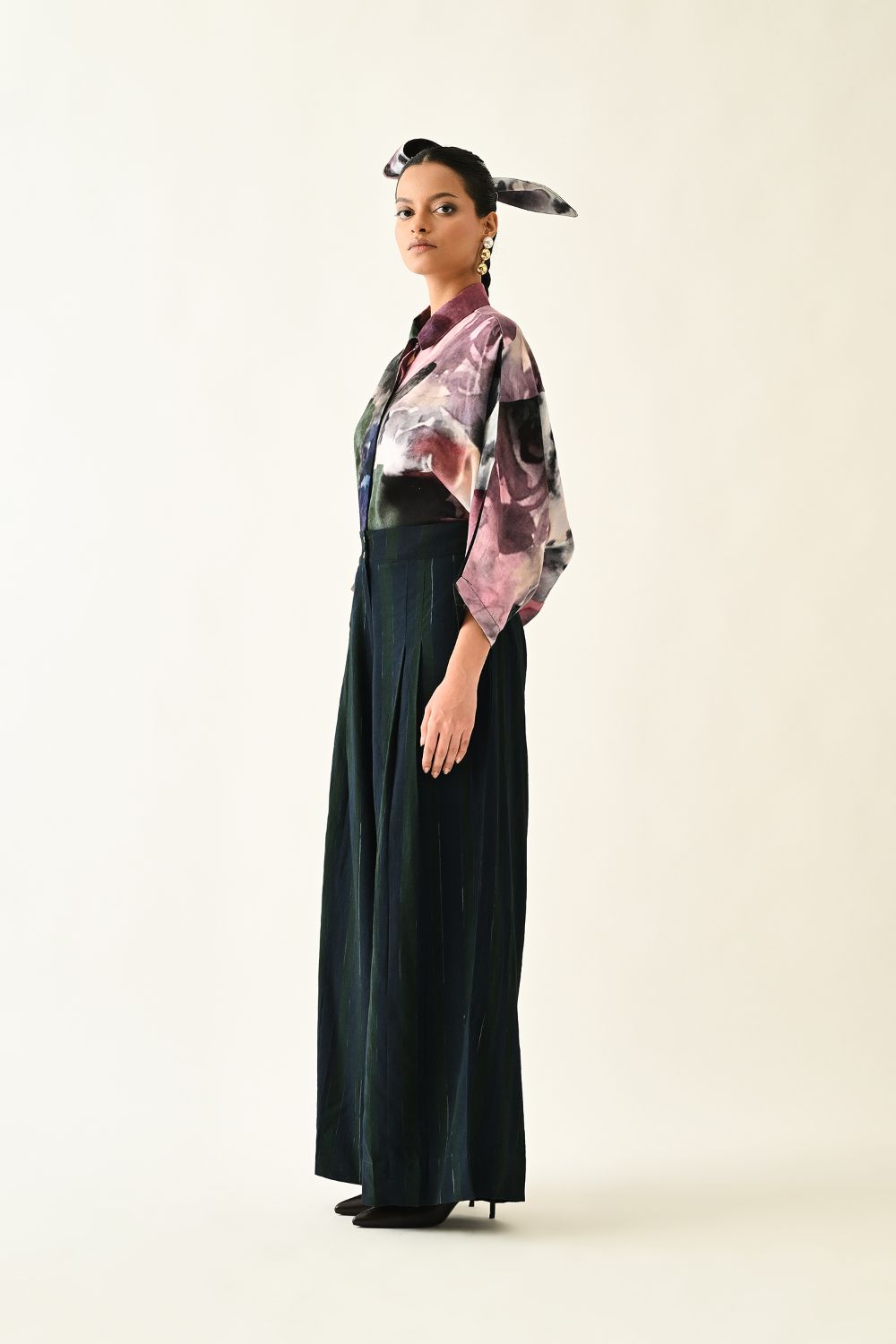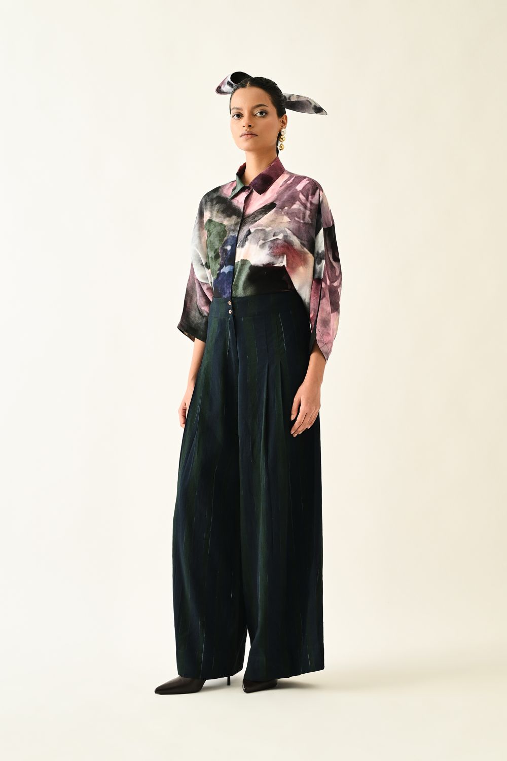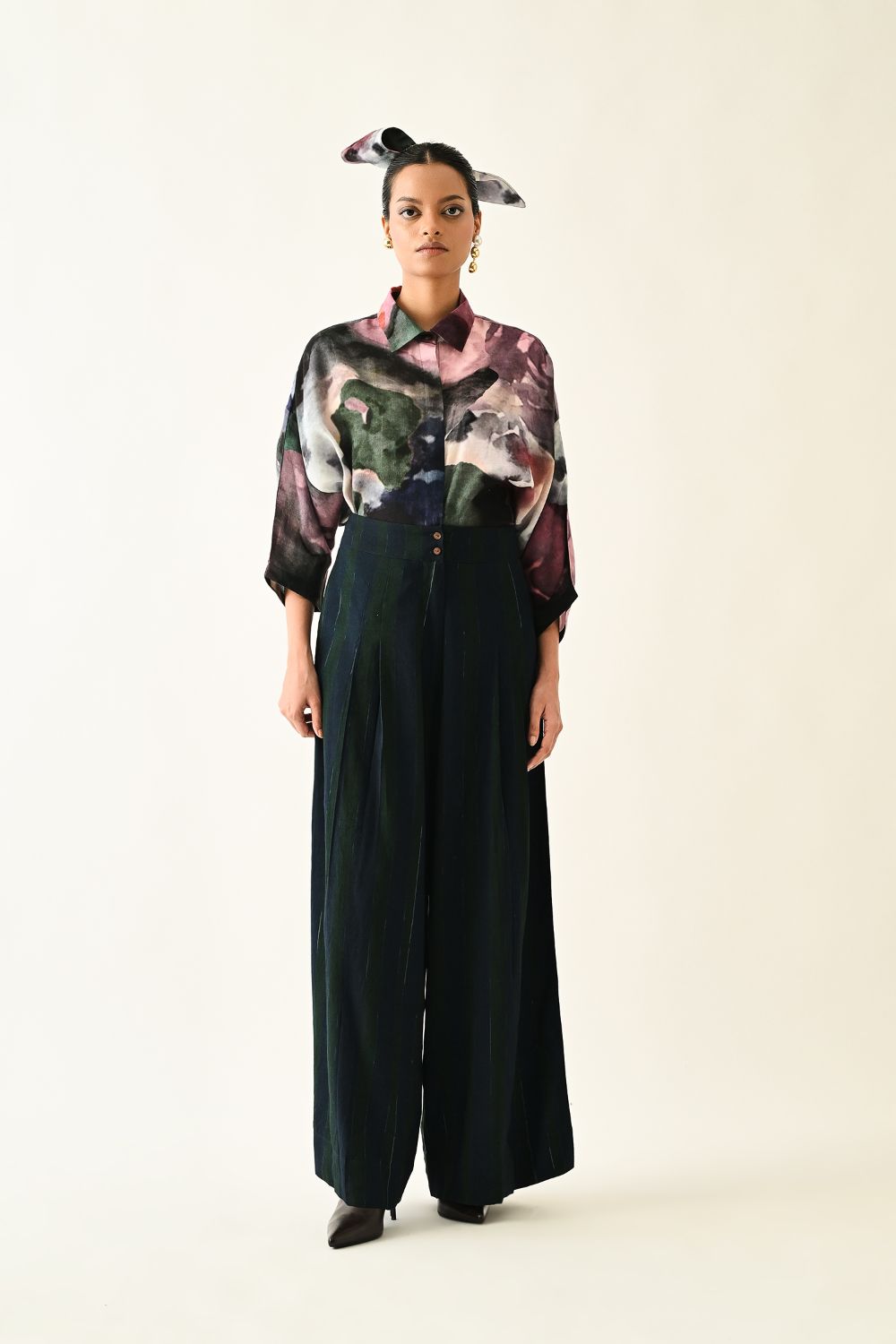 Lower: Anti fit, Pleated pants, Front zipper with button, hand-painted abstract expressionist digitally transferred print, side pockets.