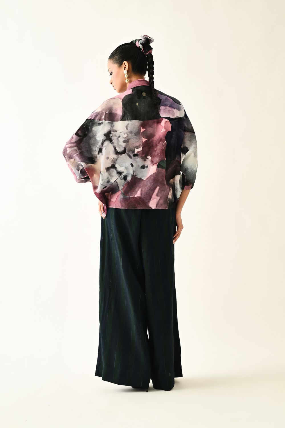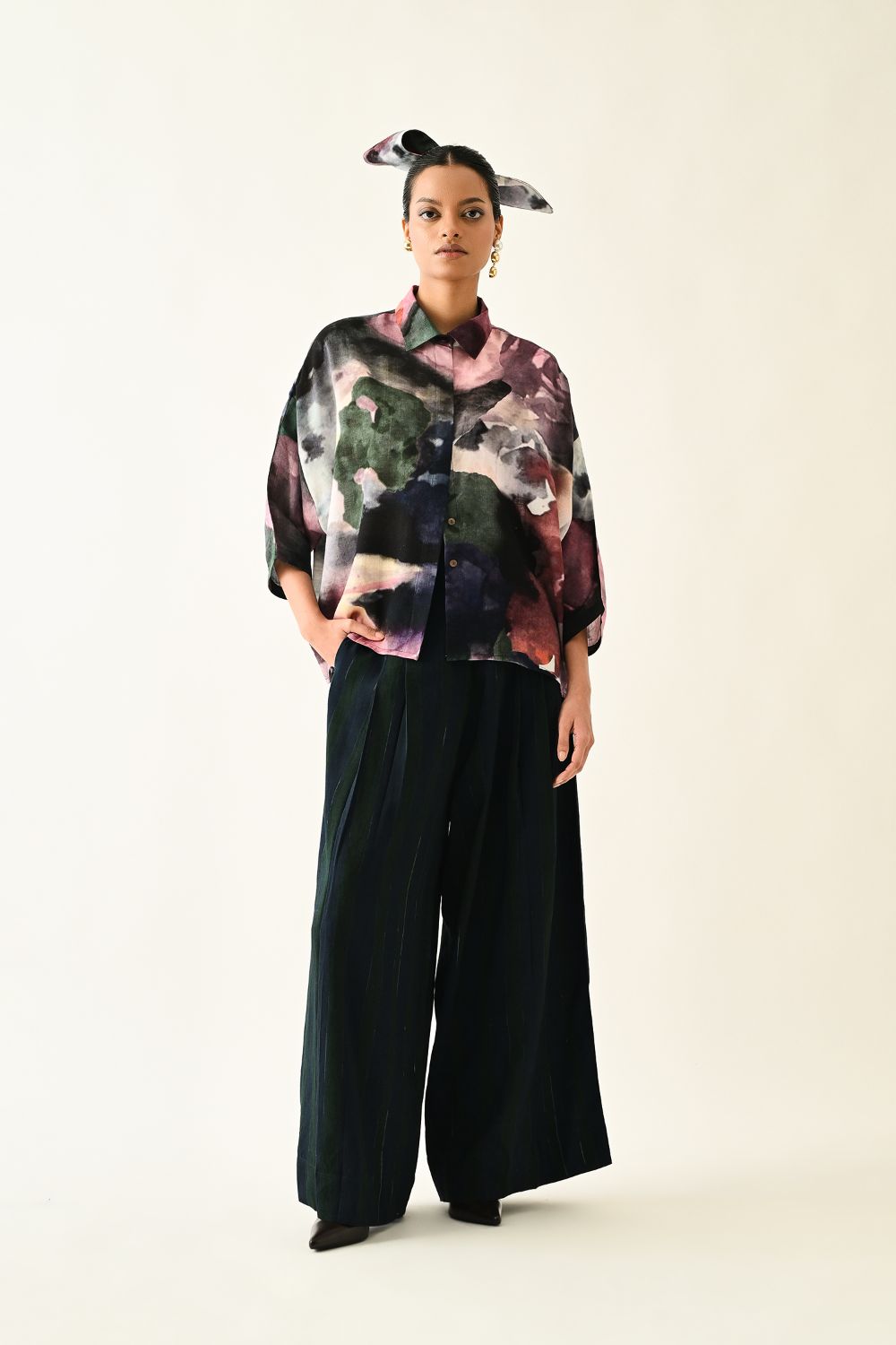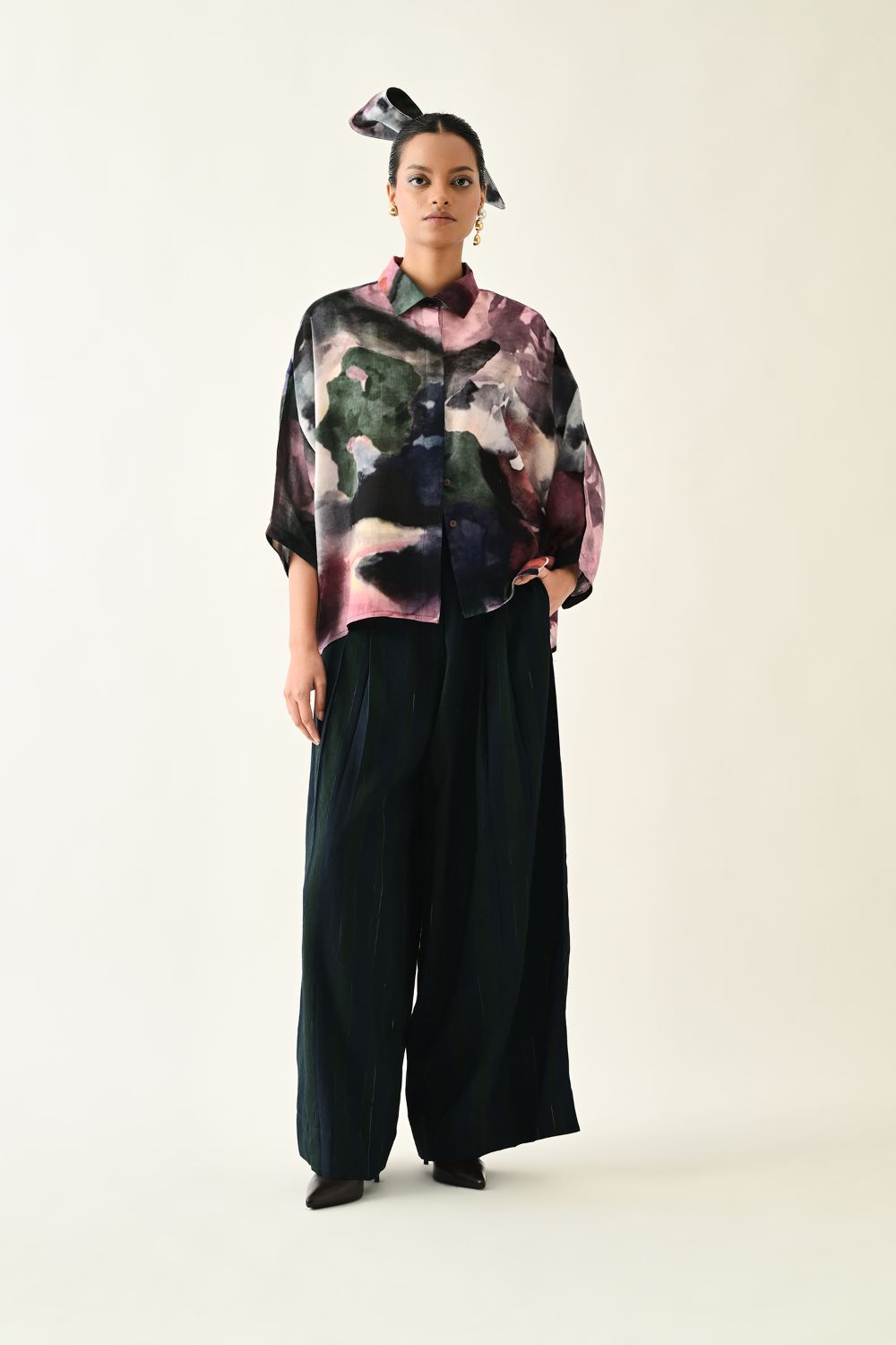 Top: Anti fit Shirt featuring a hand-painted abstract expressionist print, digitally transferred. Designed with a shirt collar, front hidden placket. The back yoke is finished and coding insert. Print placements will vary—single Piece. Model is wearing size XS/S.