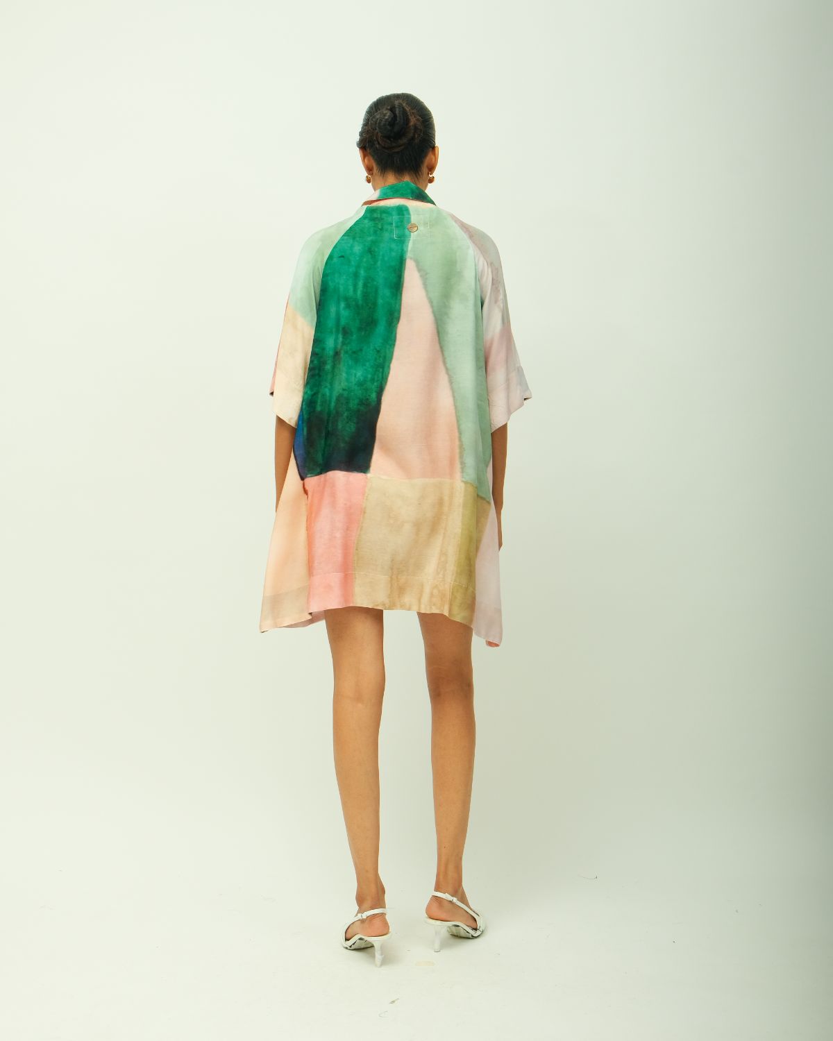 A breezy shirt dress featuring abstract, hand-painted brushstrokes in soft shades of green, blush, and coral. Tailored in a lightweight fabric with a relaxed silhouette, this piece brings together casual ease and artistic expression — ideal for effortless, everyday styling with a statement edge. Garment Length - 34"