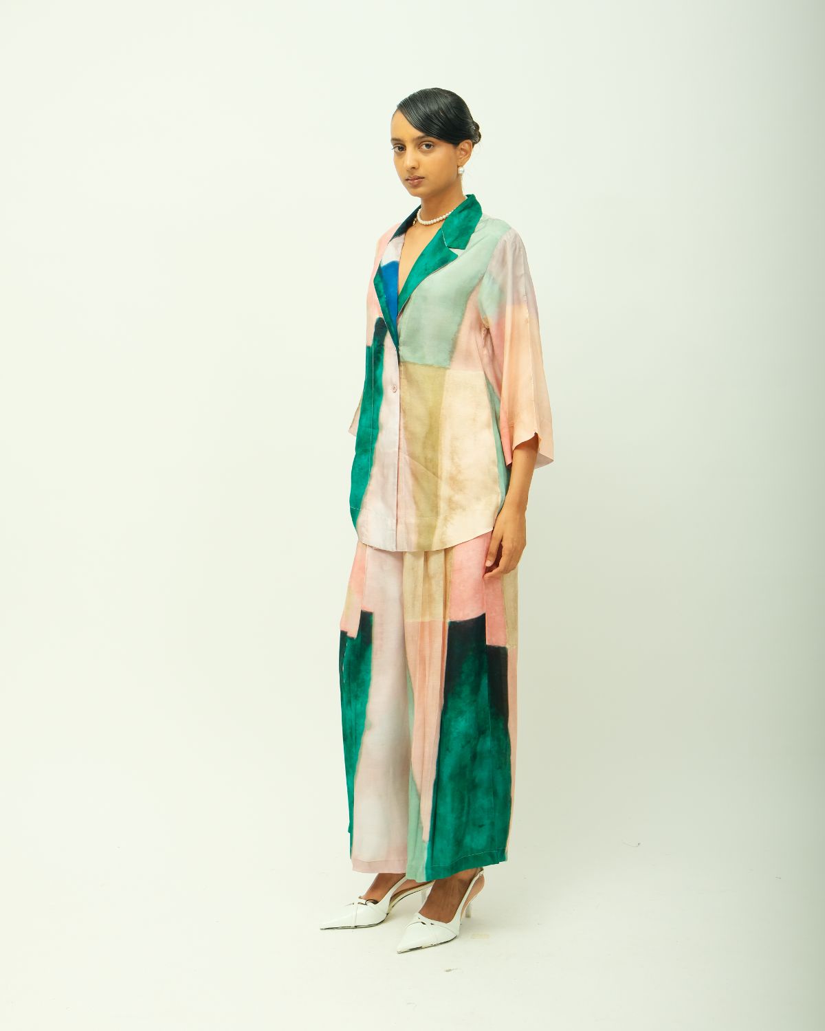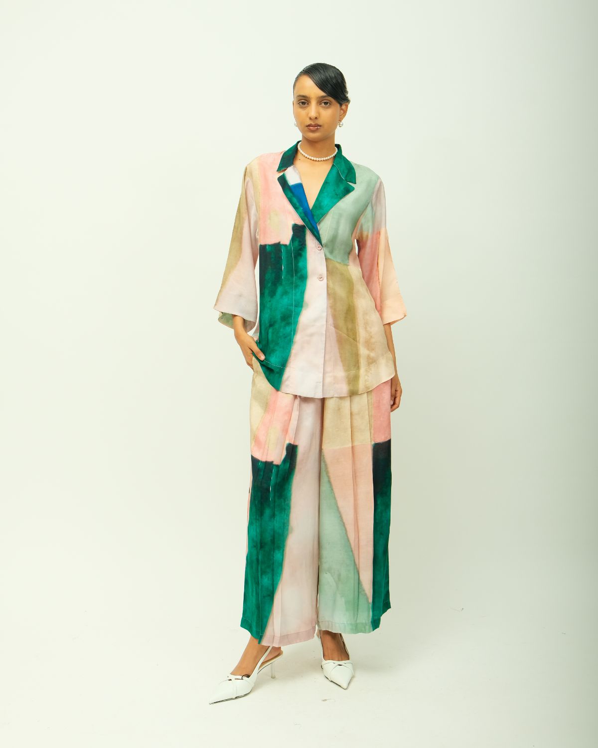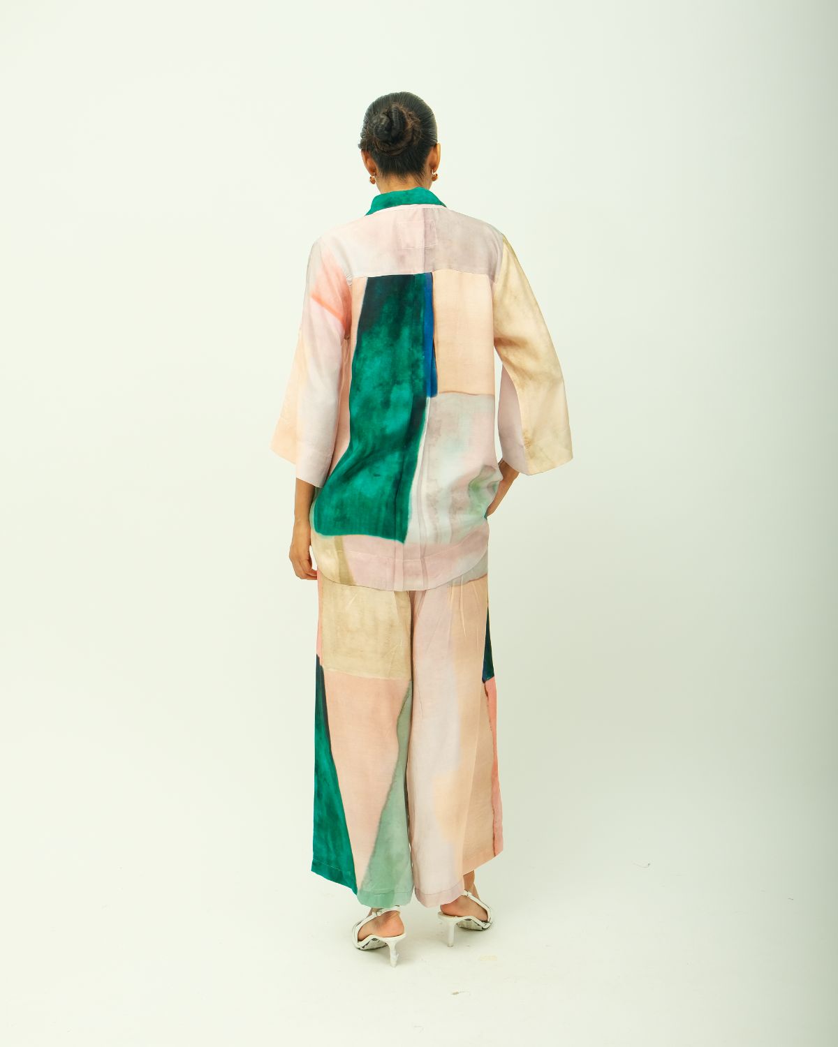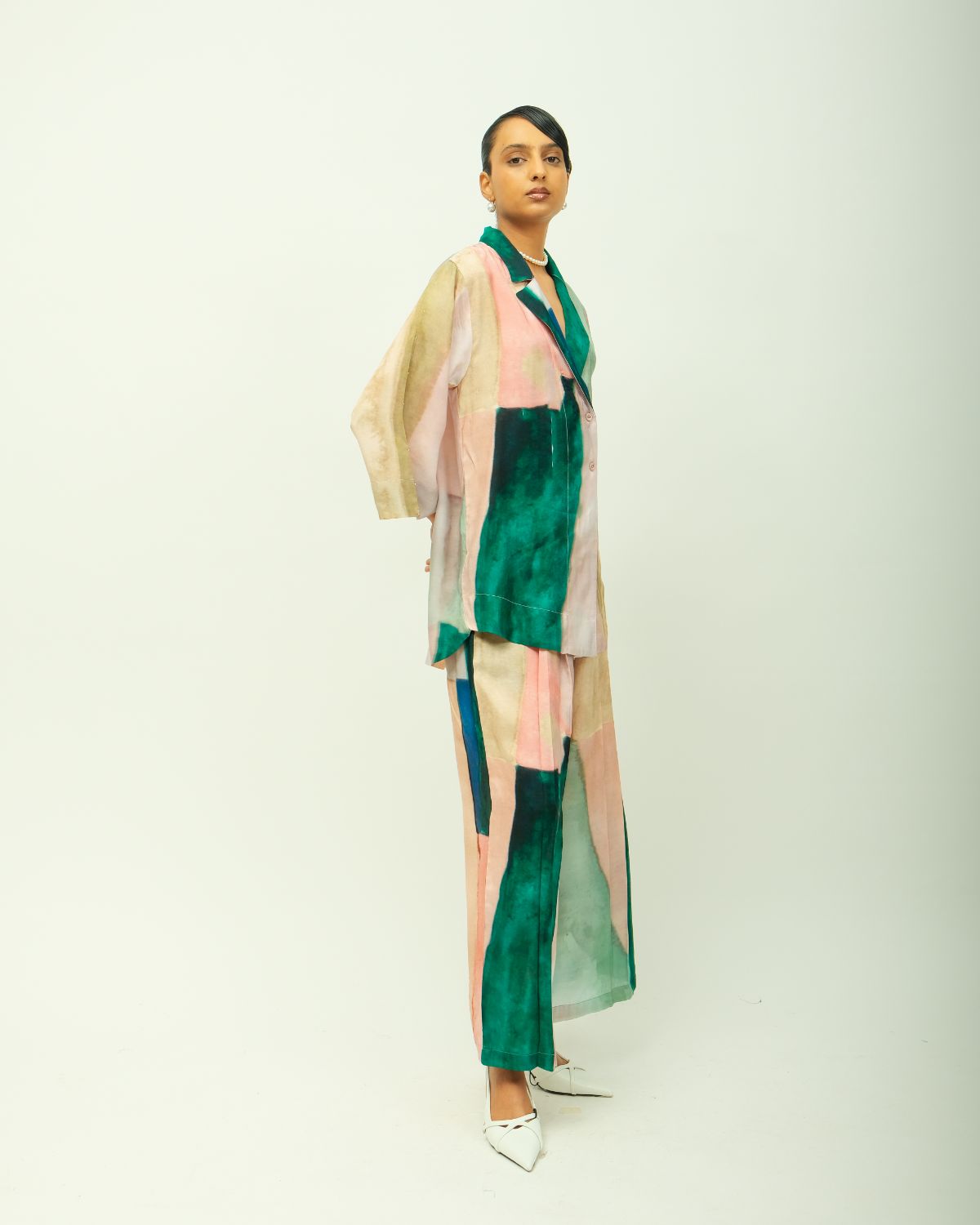 Anti fit, front belt, drawstring attached, back elasticated lowers, flared fit, pleats, hand-painted abstract expressionist digitally transferred print, side pockets. Variations in color, texture, and weave are inherent due to the hand-made nature of the garment- Single piece. Garment Length - 40"