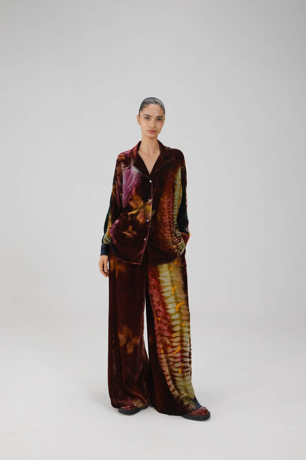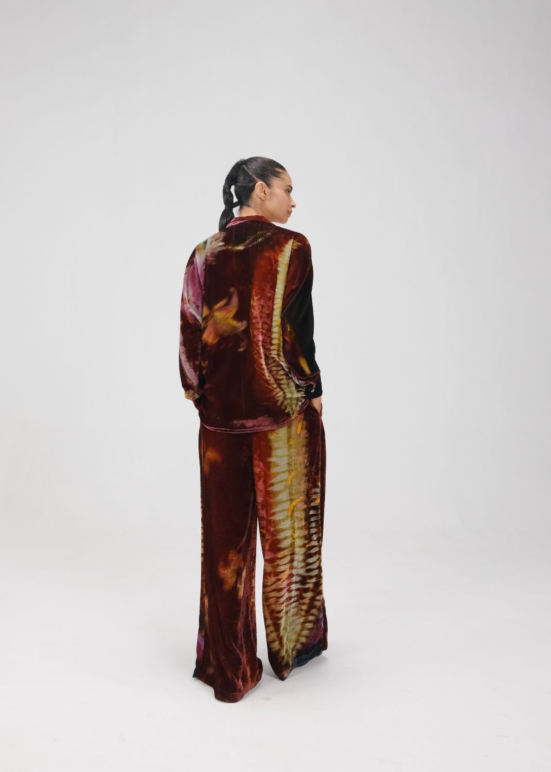 The Lounge shirt is made from Velvet fabric in x-ray print. It is a button-down shirt and has notched collar detailing. "