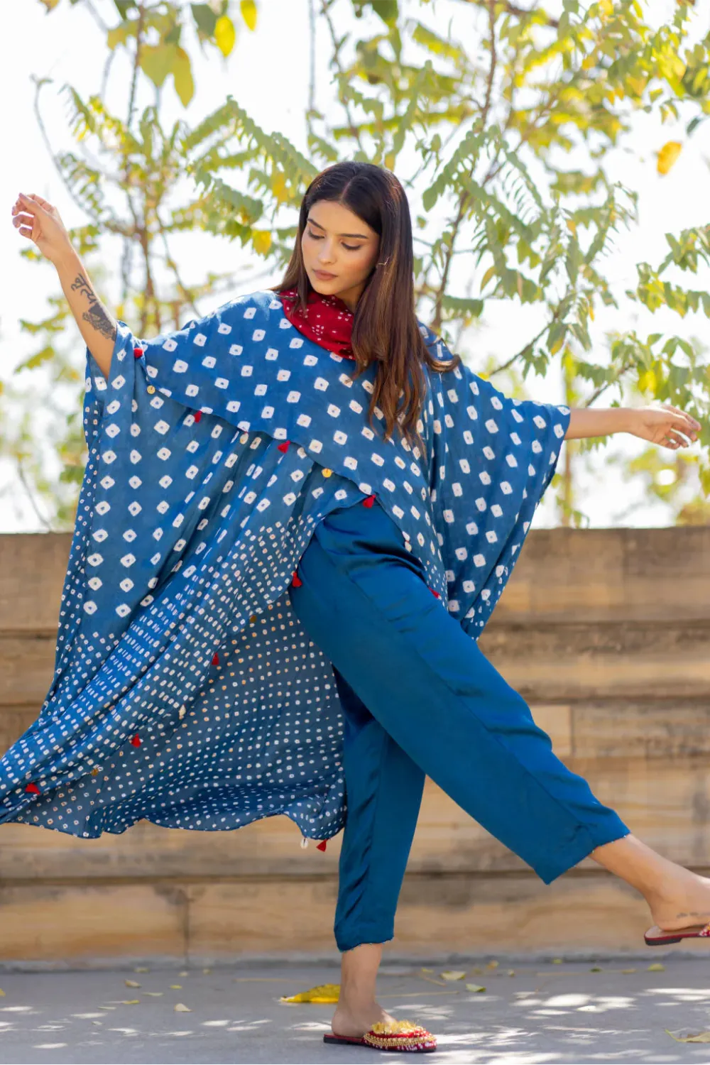 Blue Bandhani Overlap Top with Red Cowl Collar . Handmade tassles and conch shell detailing.