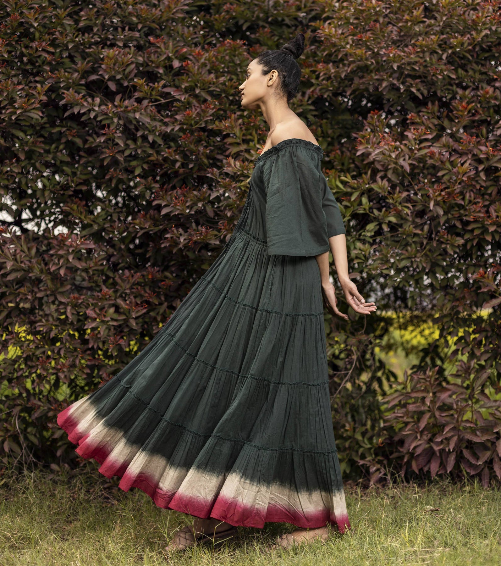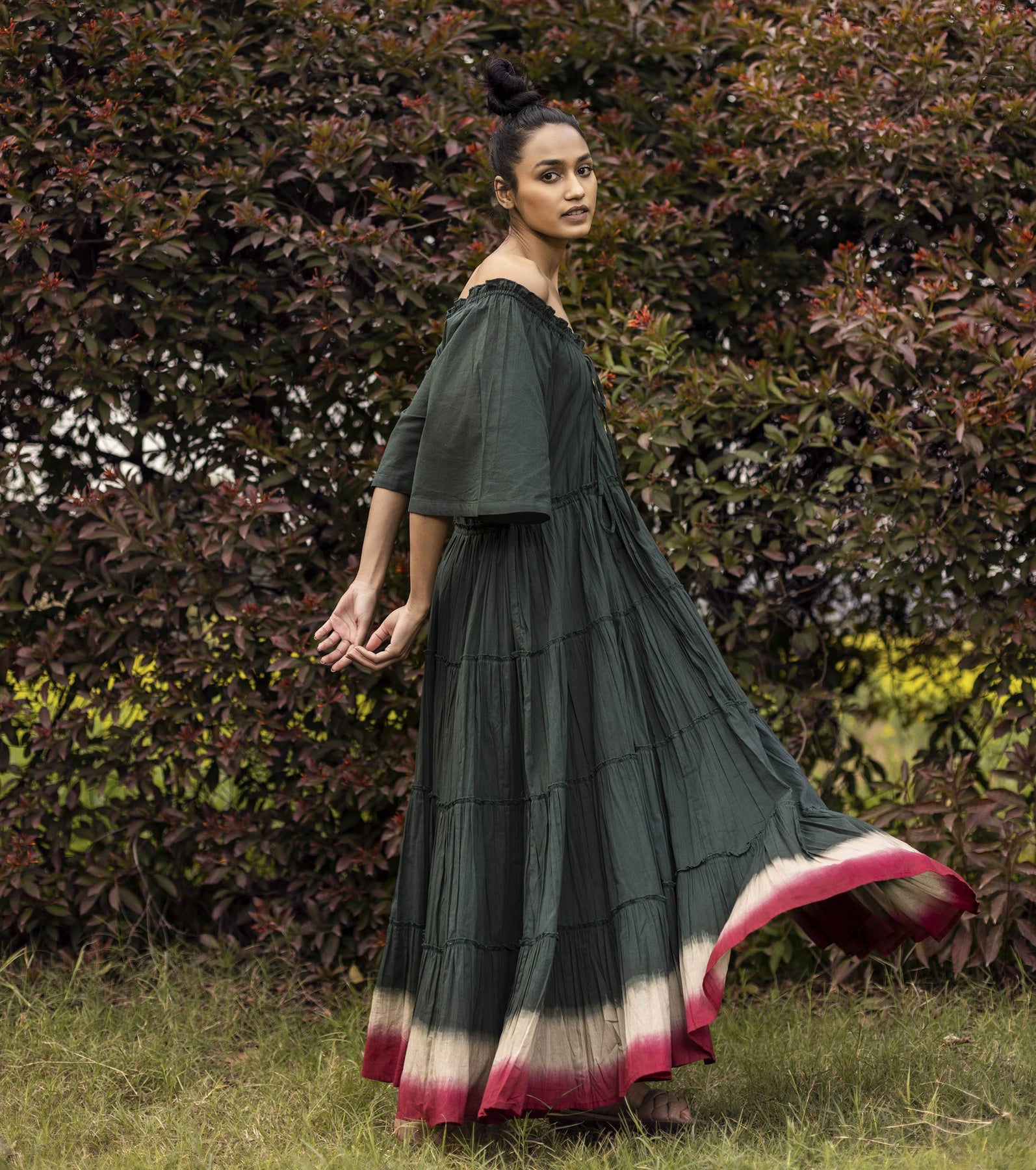 An ode to the faraway fantasy of lush, rolling hills, and an enduring romance - encapsulated in the delicate balance of earthy hues and a free-flowing drape. A lovely mossy green dip dyed with Shibori at the hem, this dress comes with side pockets.