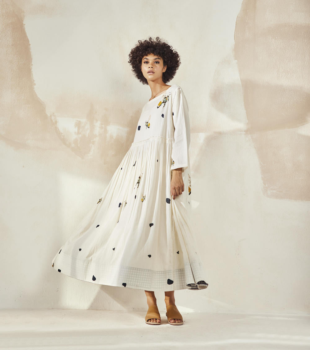 Bee printed anti-fit dress with gather detailing, loose sleeves and lace detailing.