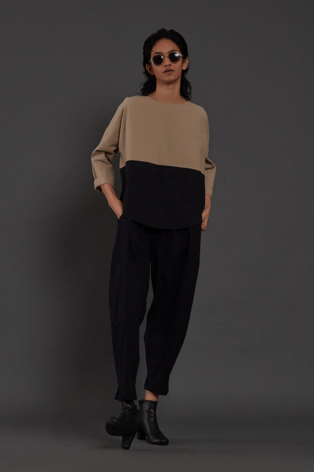 A set of relaxed-fit colour block top with full-length pleated balloon pants and side pockets.