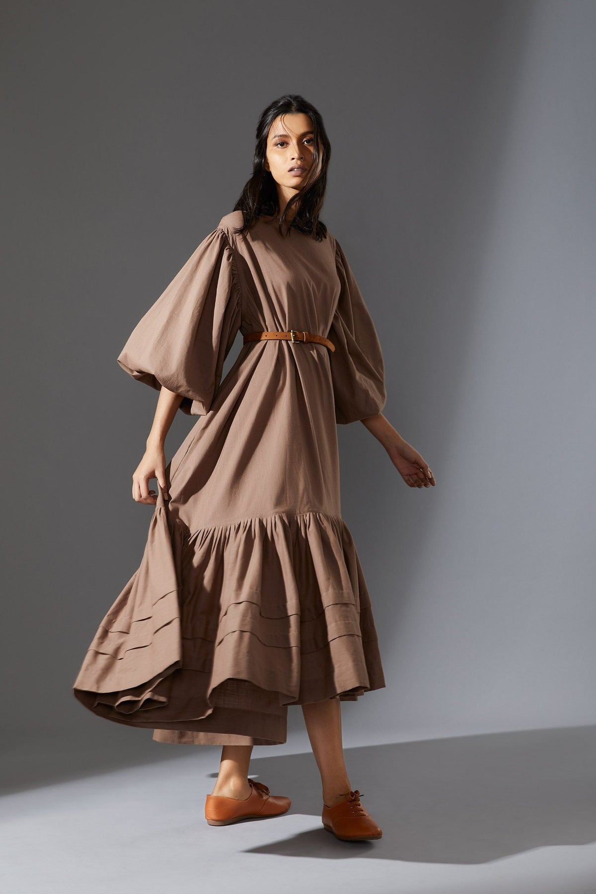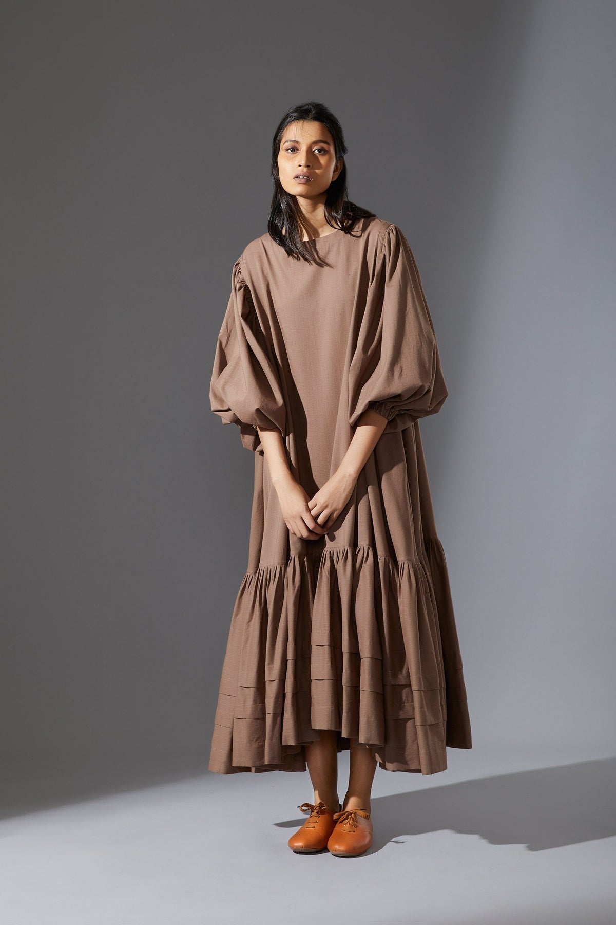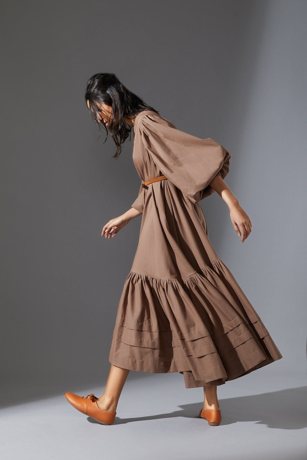 Made from luxurious handwoven cotton slub. The loose fit, voluminous blouson sleeves and swishy asymmetric hem add to the breezy, carefree feel. Wear yours with boots !!