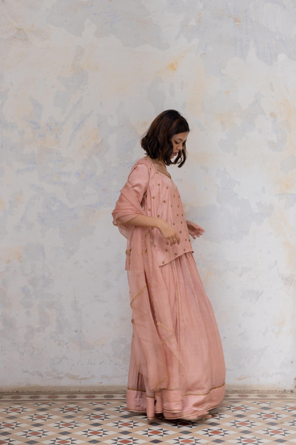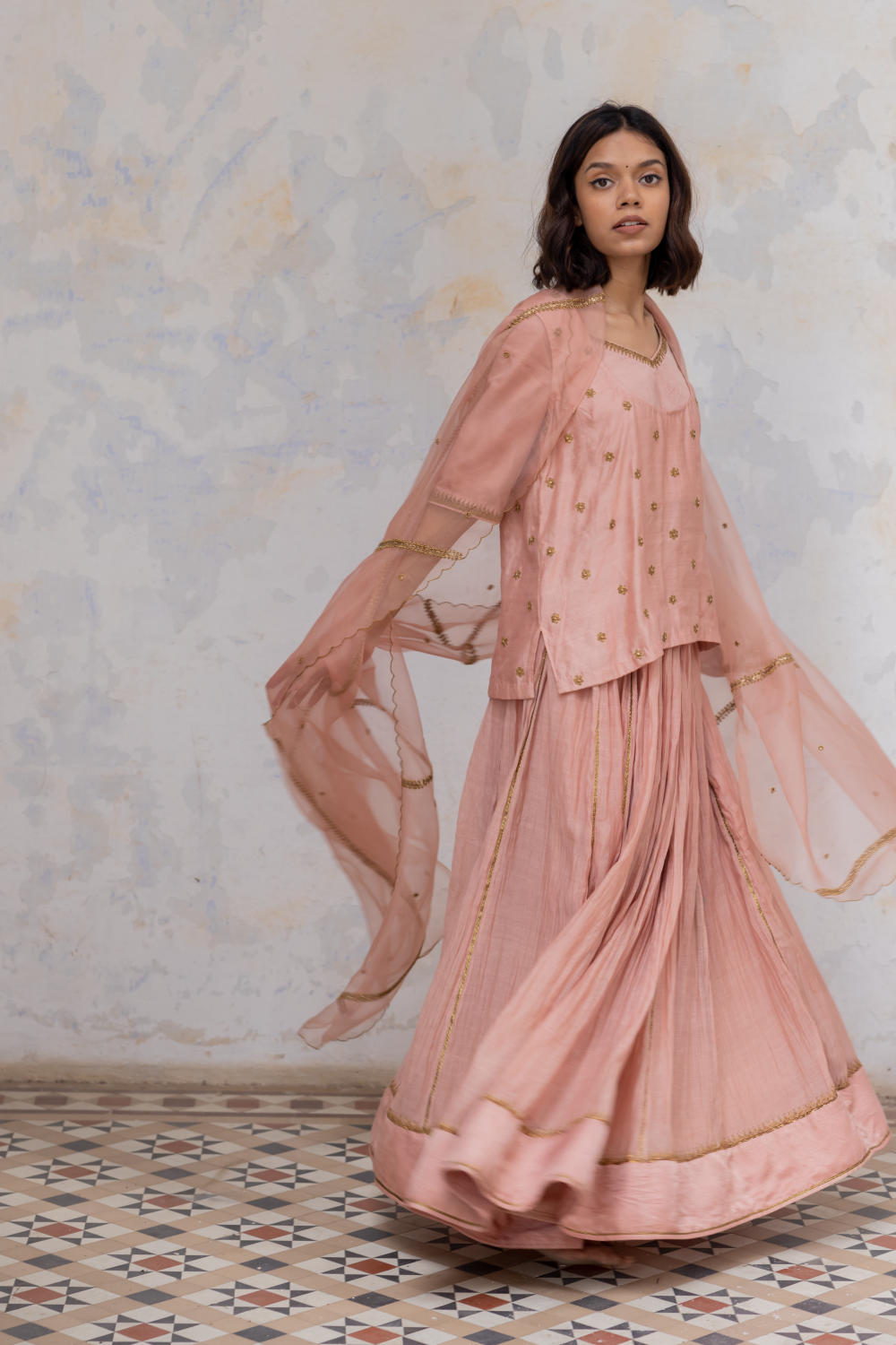 Silk organza odhani with handcrafted scallops and traditionally embroidered leheriya lines. An Epitome of amalgamation of tradition and modernity