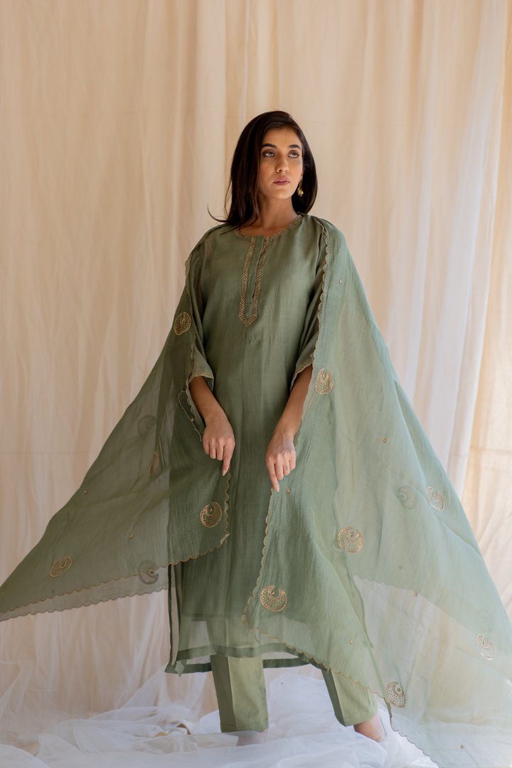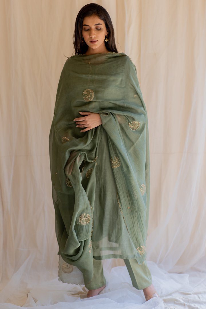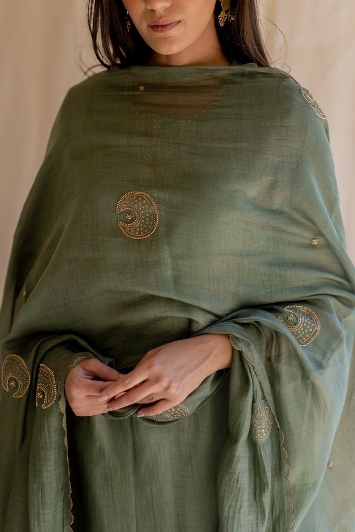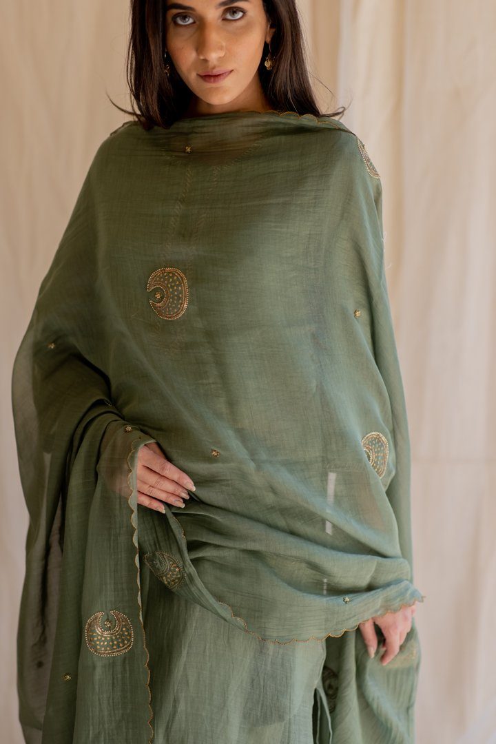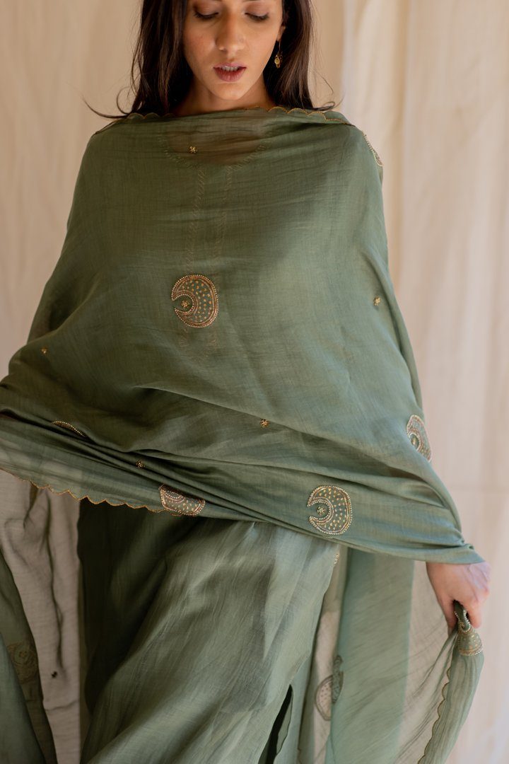 Moons scattered allover with edges scalloped, this dupatta speaks of illumination of oneself, just like the moon.