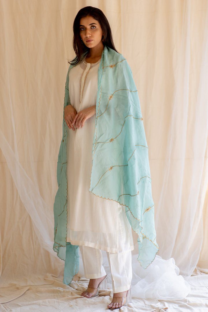 Diagonal bel allover with edges scalloped, the dupatta speaks of pushing the boundaries, each step at a time.