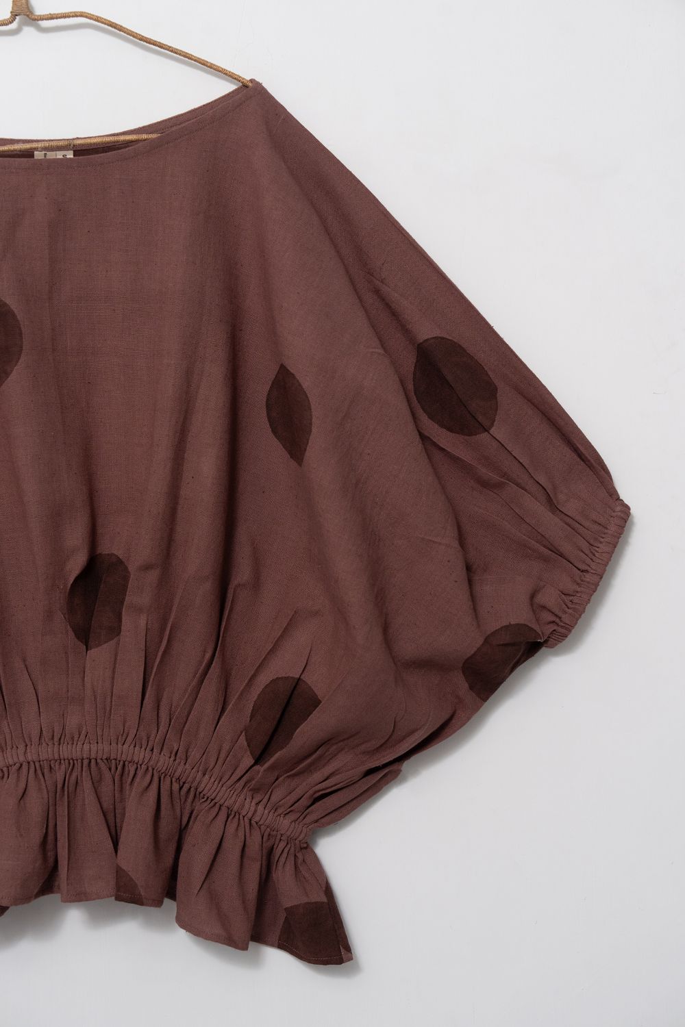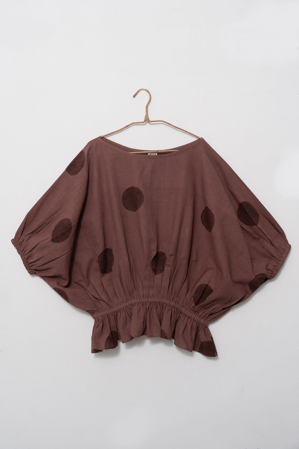 A playful twist on the relaxed, voluminous silhouette. This top features a base fabric in a medium, earthy brown, accented with large, subtly darker polka dot prints. The design maintains the wide scoop neckline and dramatic balloon shape, cinching at the hip with a gathered, elasticated hem. The print adds a contemporary, whimsical flair.