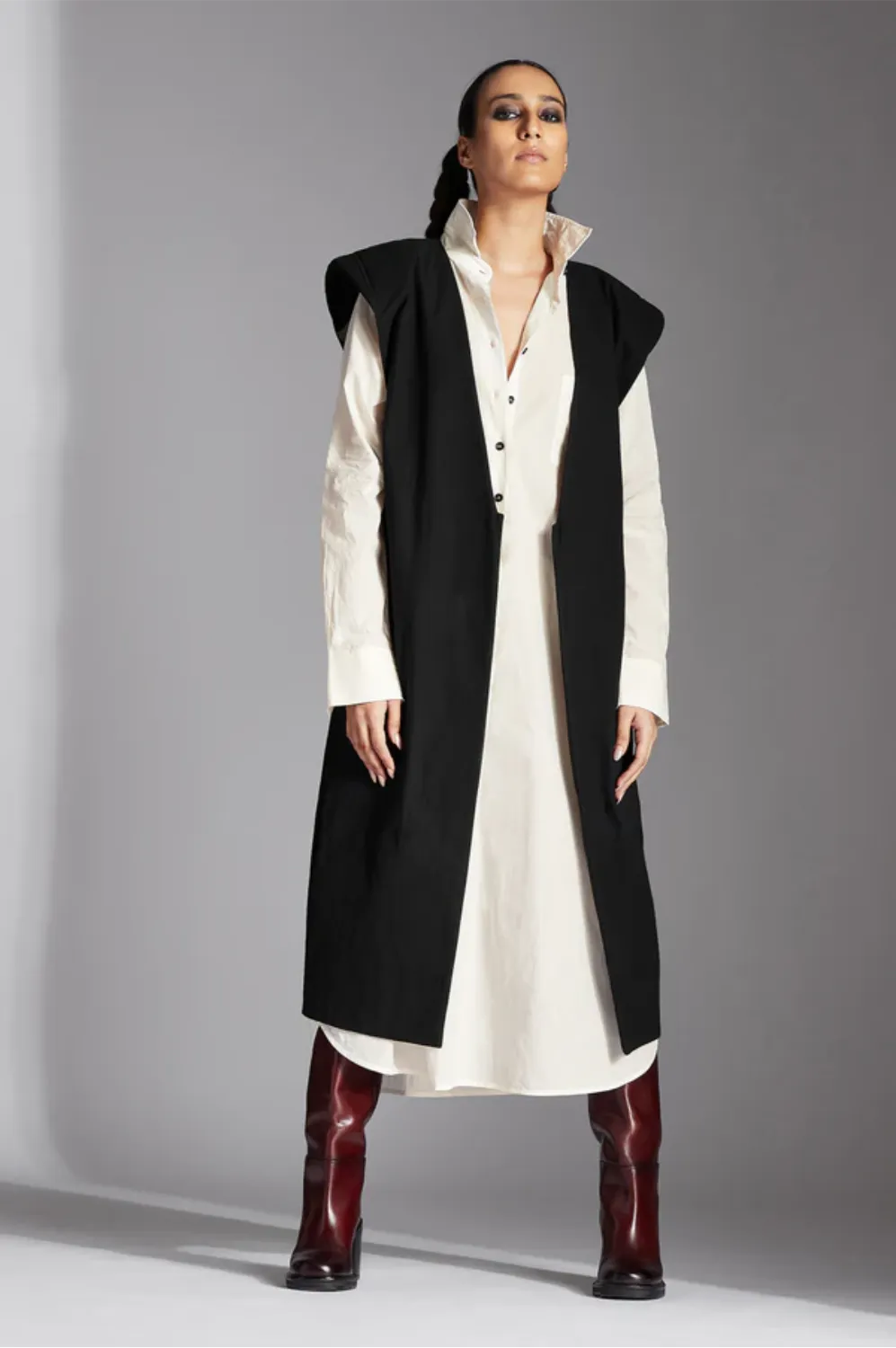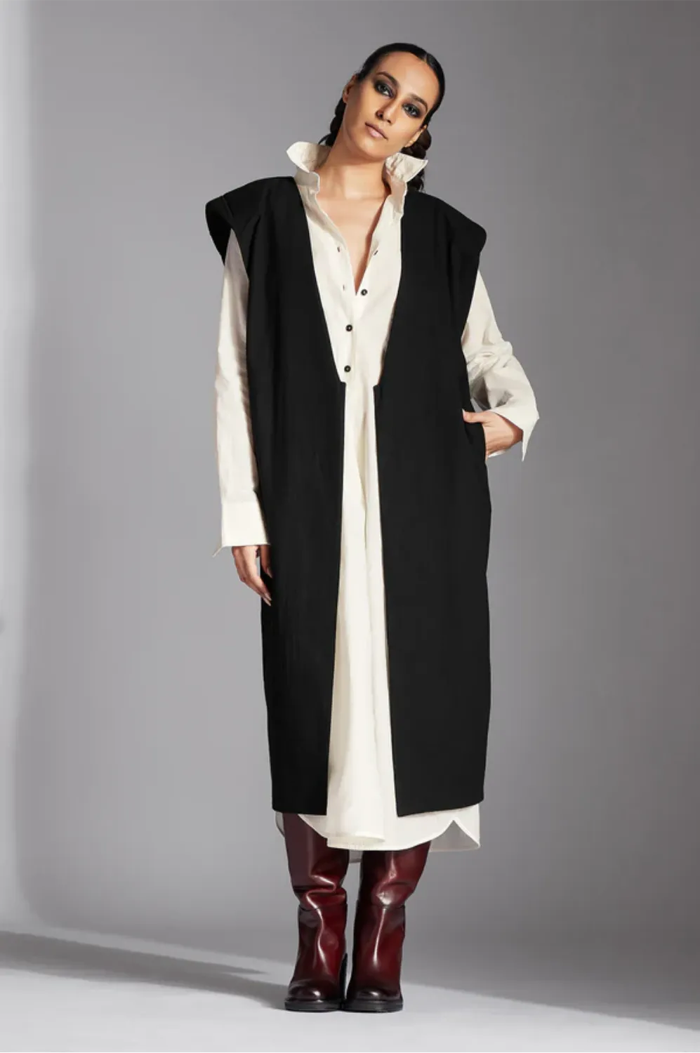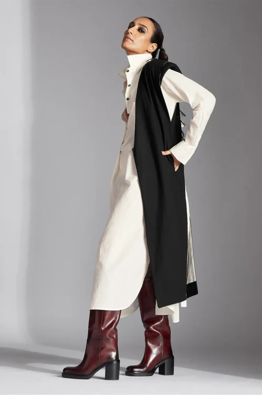 Chola’s universe begins with thoughtful materials. Recycled cottons, post-consumer fabrics, and free-cutting techniques come together in a kind of mindful choreography—one that honours form without creating waste, and prioritises movement over rigidity. This is clothing that feels lived-in yet architectural; pared-back yet quietly avant-garde.