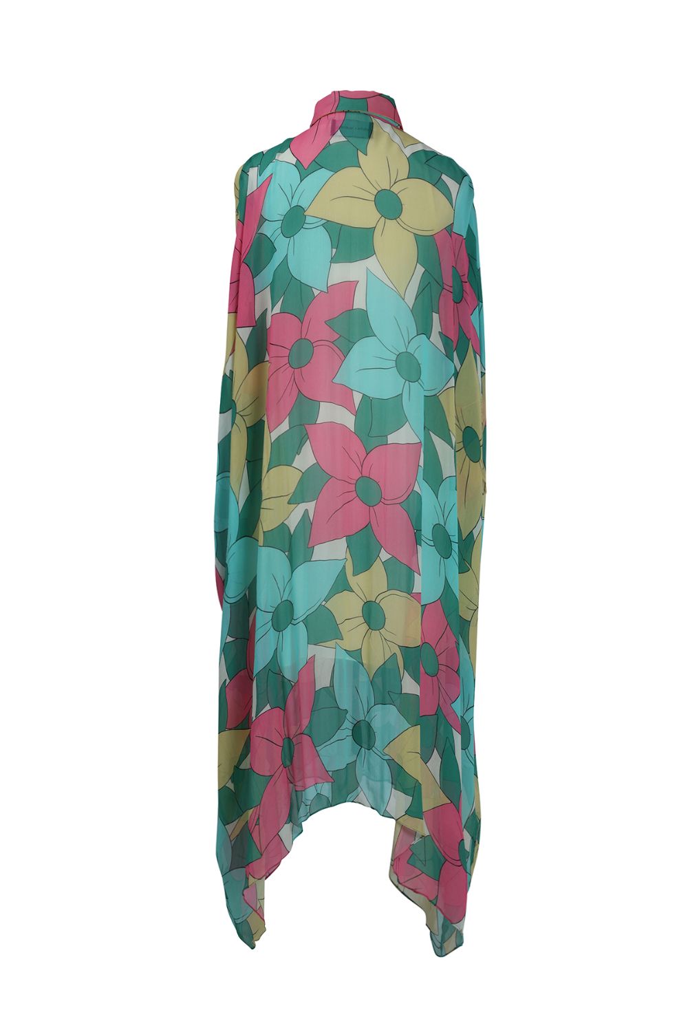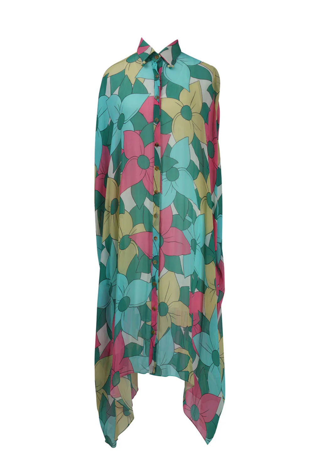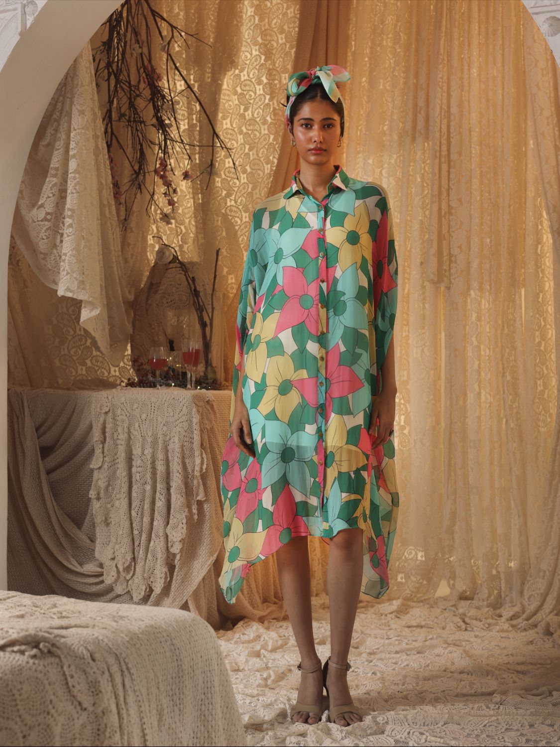 Bold blooms meet sheer grace in this multicolor floral kaftan shirt dress. Crafted in light chiffon and designed with a shirt-style collar, this piece brings a structured twist to a free-flowing silhouette. The soft inner underneath provides coverage while maintaining breathability. Whether buttoned up for brunch or left open as a beach cover-up, this dress is a must-have for your sunny getaways and monsoon retreats alike.