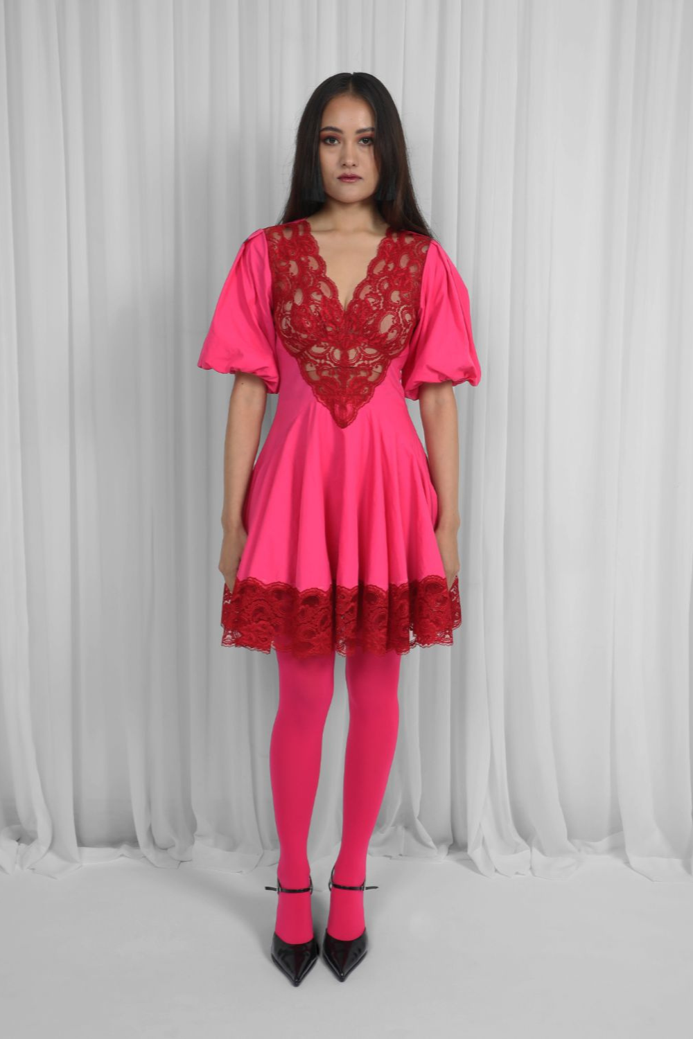 Fitted at waist and circular at bottom this dress is made of 100% cotton fabric and lace featuring puff sleevs, plunging neckline with lace cutouts at the bust and V-shaped midriff, while cut out at back adds a sexy playfulness, finishing off with intricate lace panels at bottom skirt with scalloped edge Model height is 5'8" Model wear size S garment length is 34"