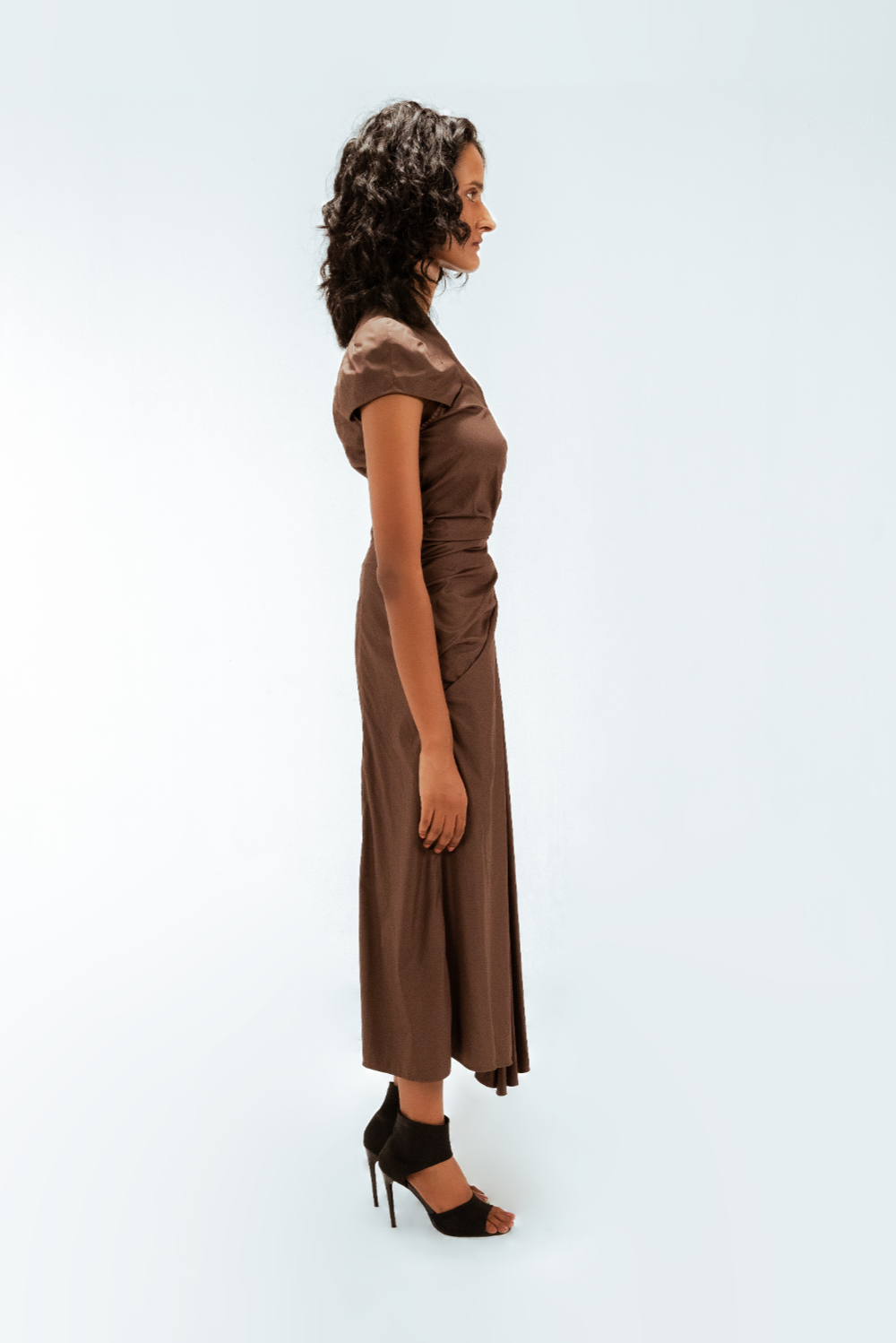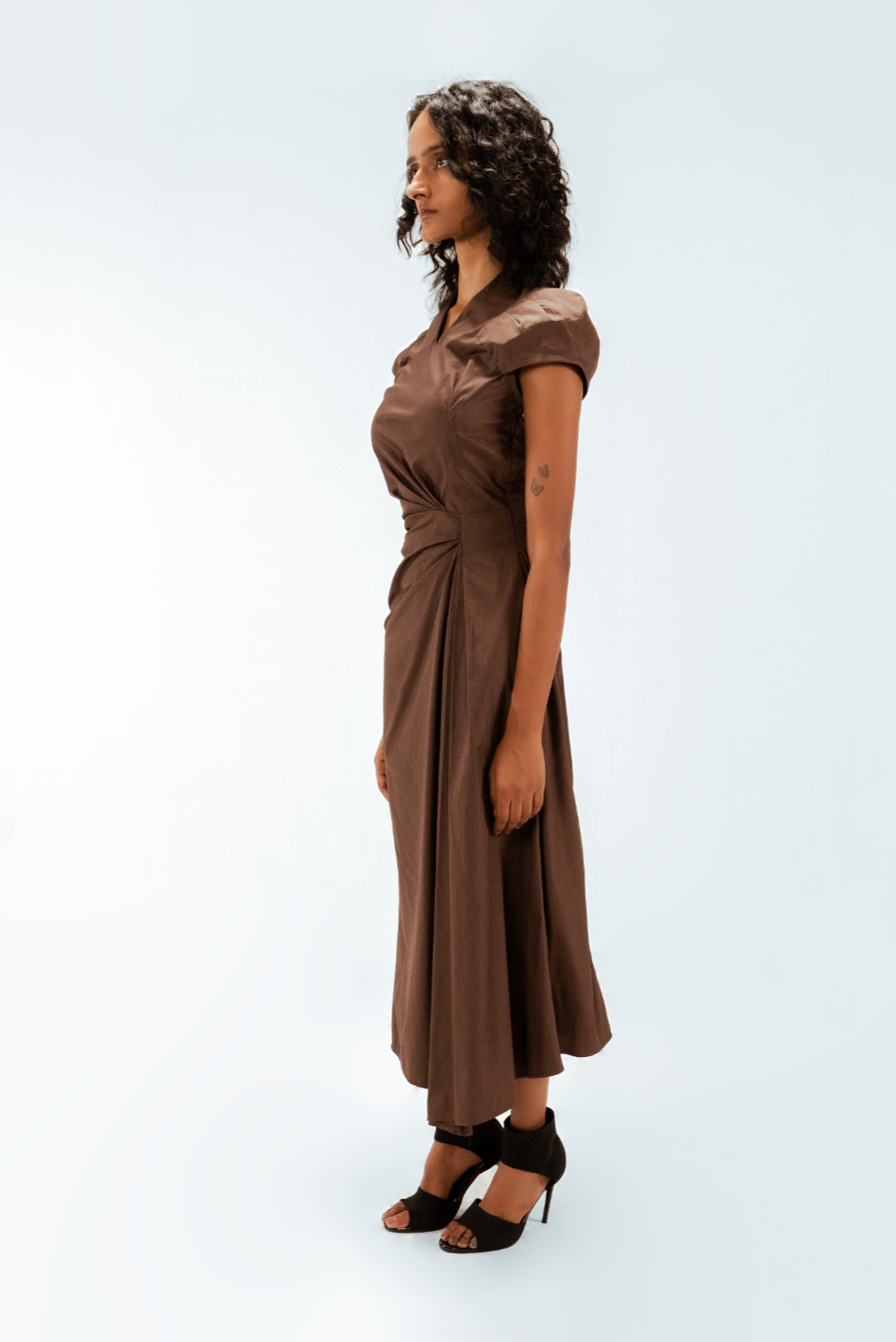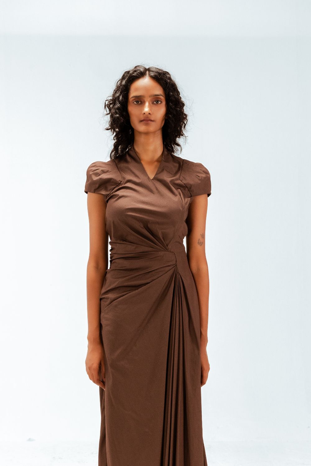 Precisely cut for a refined silhouette, this draped midi dress features sculpted cap dart sleeves that contour the shoulders with subtle structure. One-sided asymmetric pleats are expertly draped from the waist, adding depth and directional movement. Model Height is 5'9". Model wears size S. Garment length is 55"