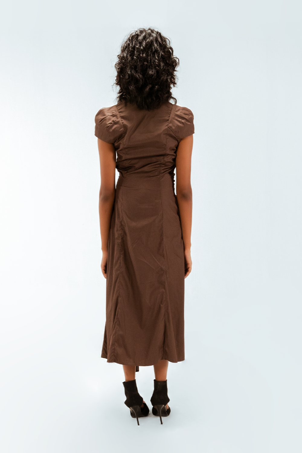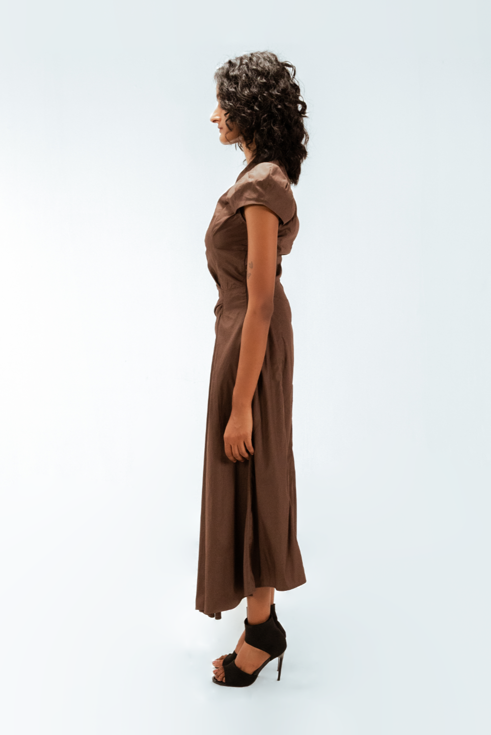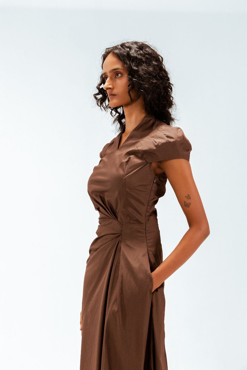 Precisely cut for a refined silhouette, this draped midi dress features sculpted cap dart sleeves that contour the shoulders with subtle structure. One-sided asymmetric pleats are expertly draped from the waist, adding depth and directional movement. Model Height is 5'9". Model wears size S. Garment length is 55"
