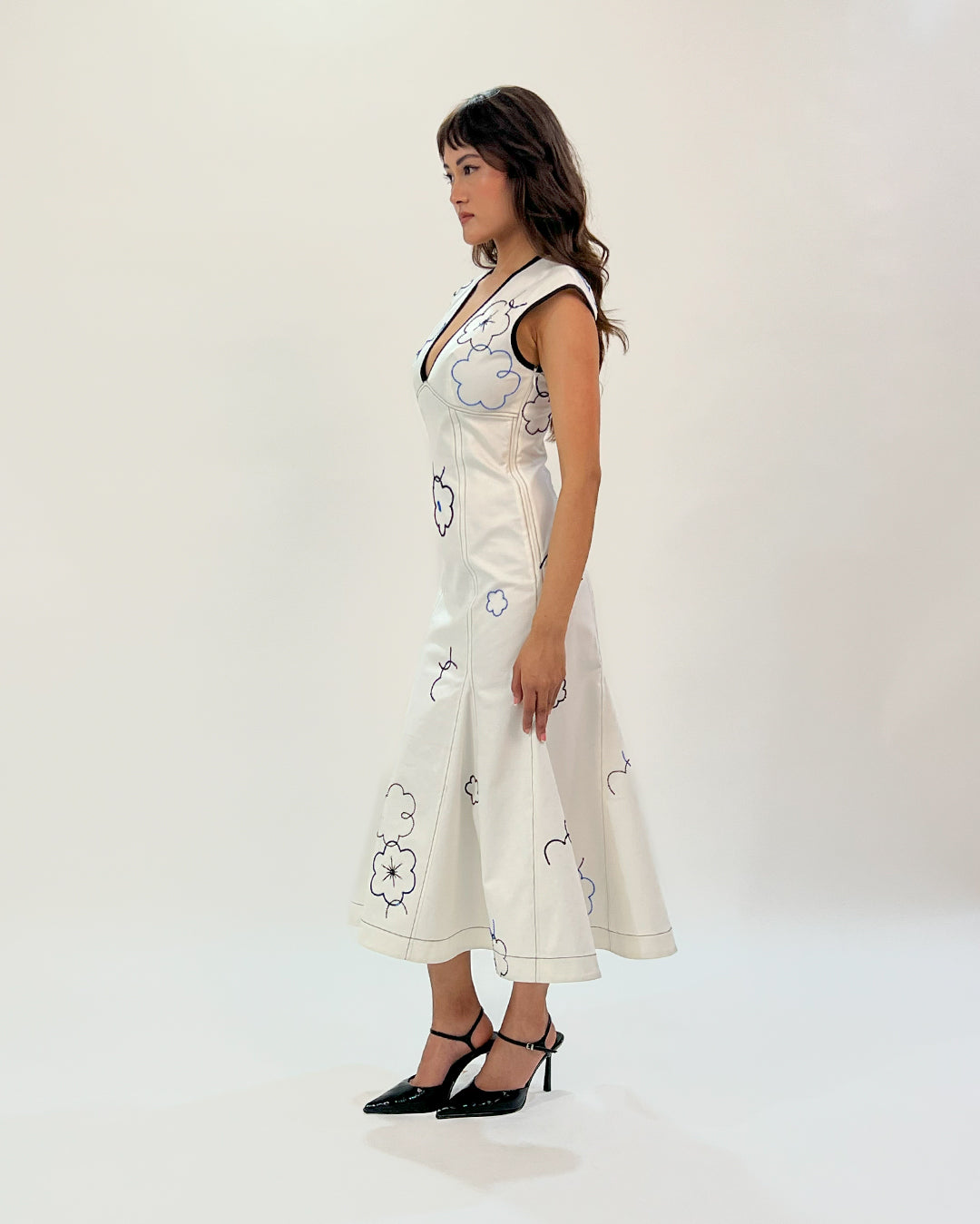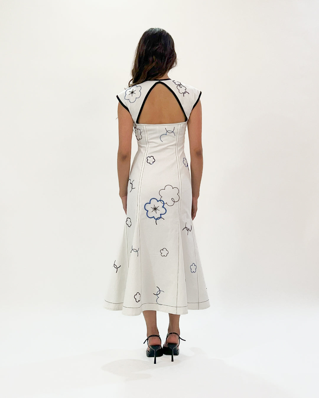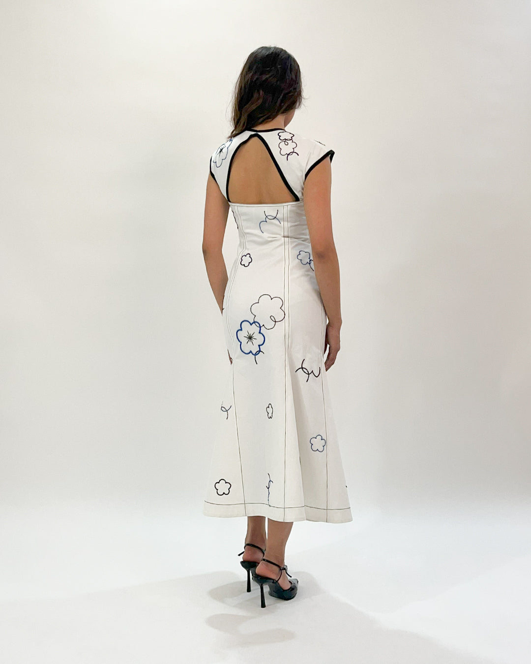This white denim panelled dress exudes modern elegance. Its backless design is paired with intricate bead and sequin embellishments. The plunging neckline, complemented by an underbust contour cut, enhances the dress, while the contrast piping and top stitch offers a refined structural detail. The dress is tailored to fit the hips, then gently flares at the bottom with godets. Model wear size S model height is 5'8 garment length is 50".