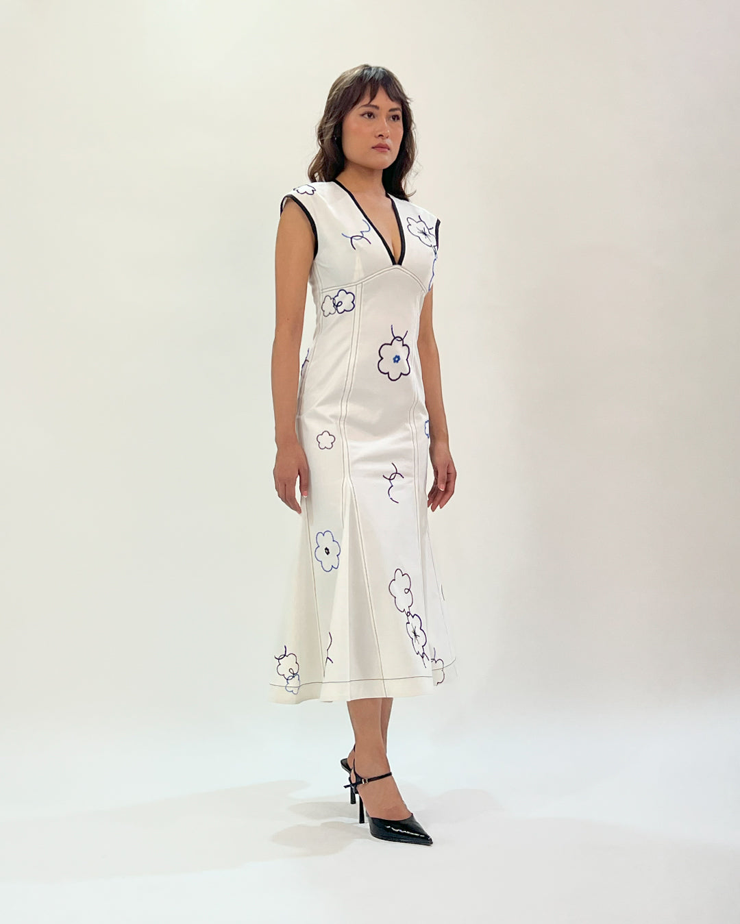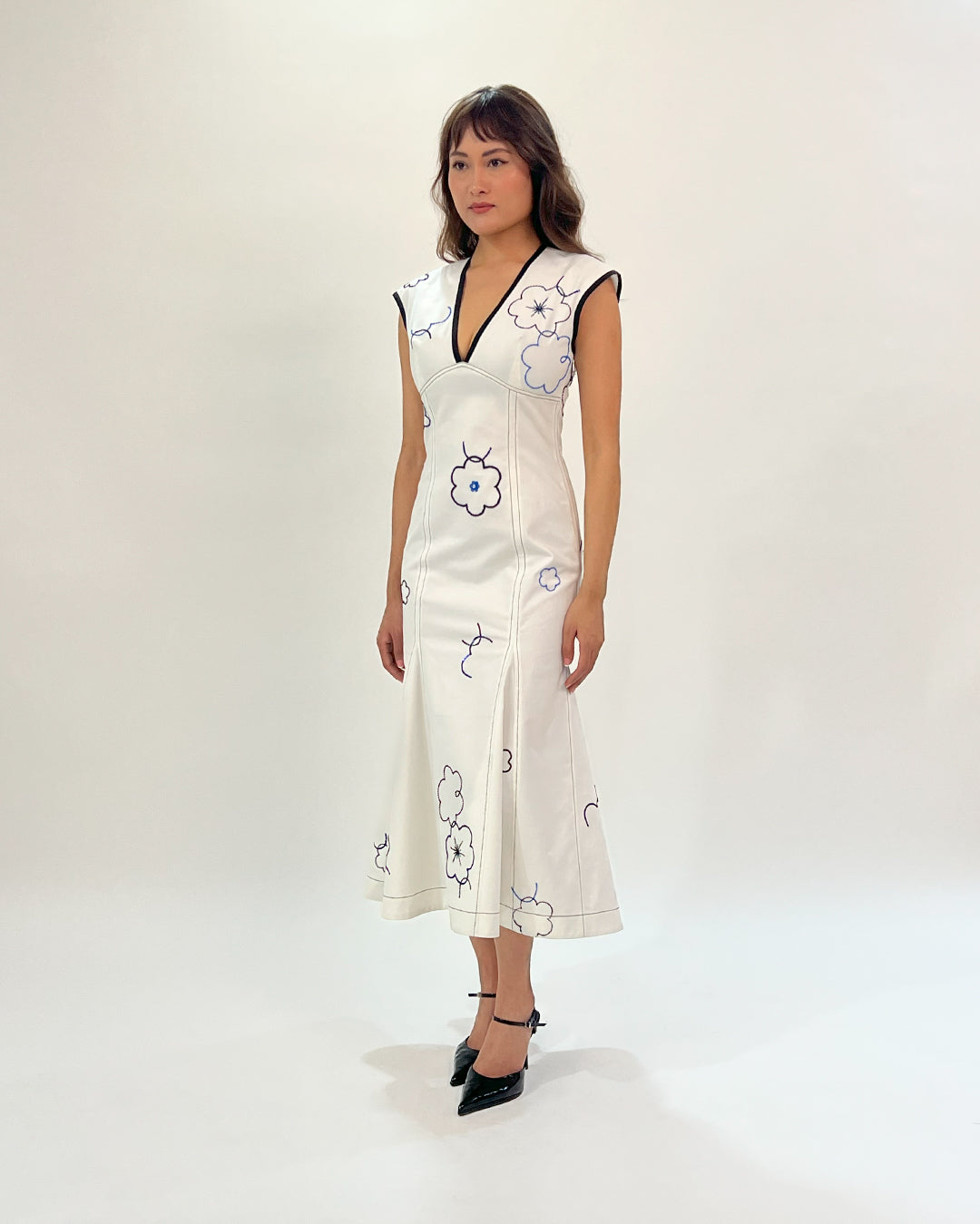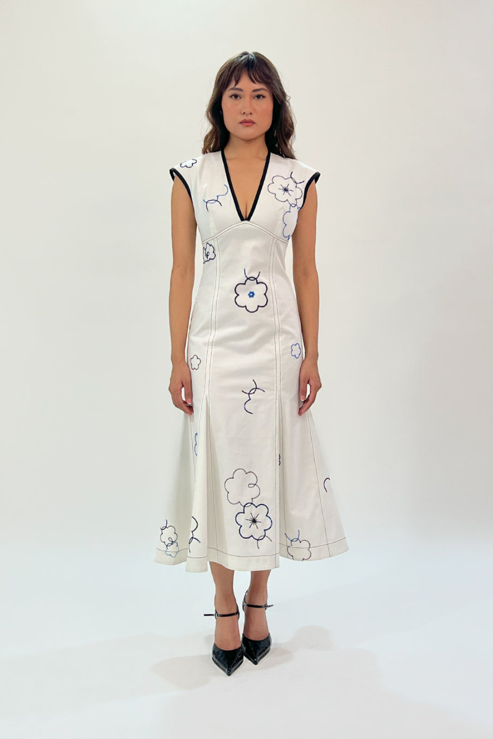 This white denim panelled dress exudes modern elegance. Its backless design is paired with intricate bead and sequin embellishments. The plunging neckline, complemented by an underbust contour cut, enhances the dress, while the contrast piping and top stitch offers a refined structural detail. The dress is tailored to fit the hips, then gently flares at the bottom with godets. Model wear size S model height is 5'8 garment length is 50".