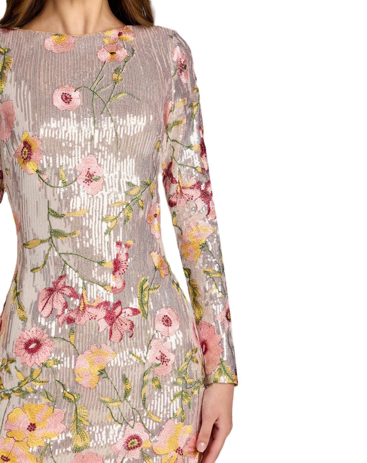 69075 - Silver Sequined Mixed Media Floral Embellished Mini Dress