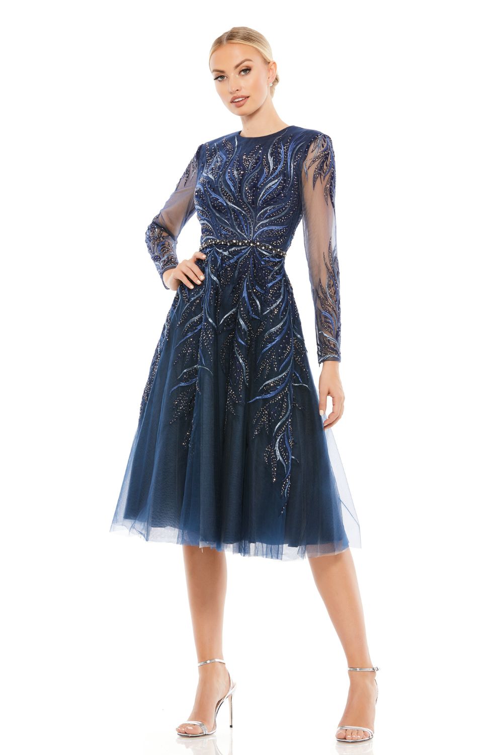 n Embellished fit-and-flare cocktail dress with semi-sheer long