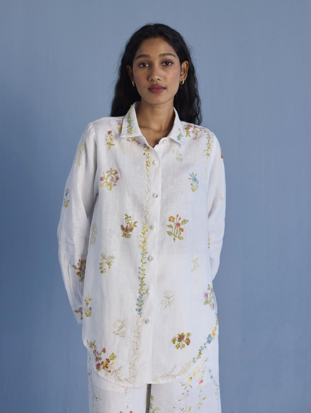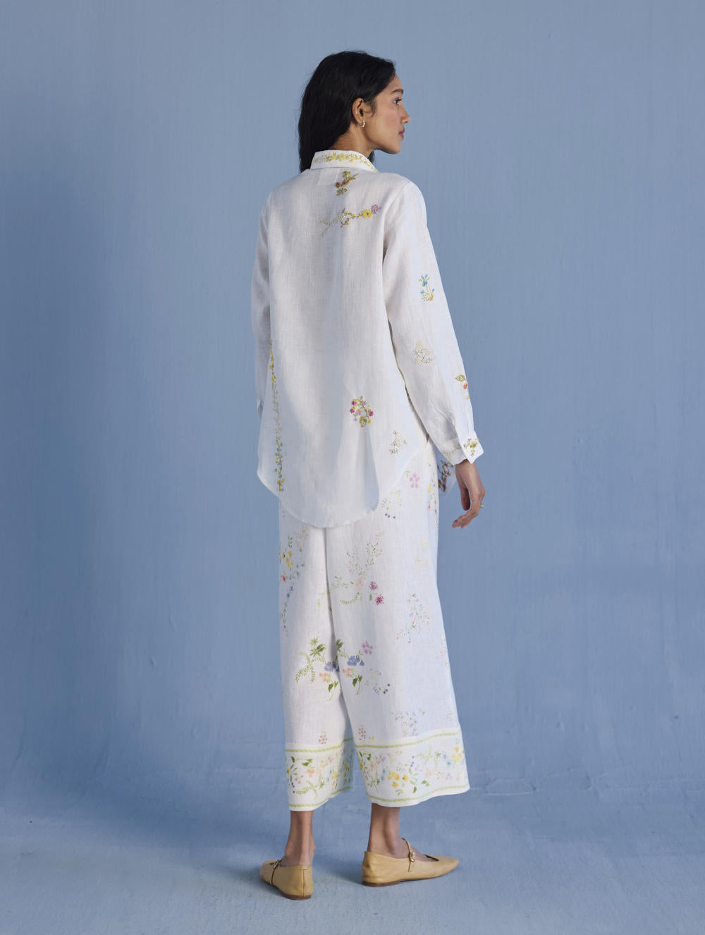 Top - Our favourite statement shirt crafted in our soft signature yarn-dyed linen is meticulously hand-embroidered with delicate, yet textural, floral motifs in mixed materials using multi-colour threads and beads. The shirt is finished with a long side slit detail and floral printed linen buttons.