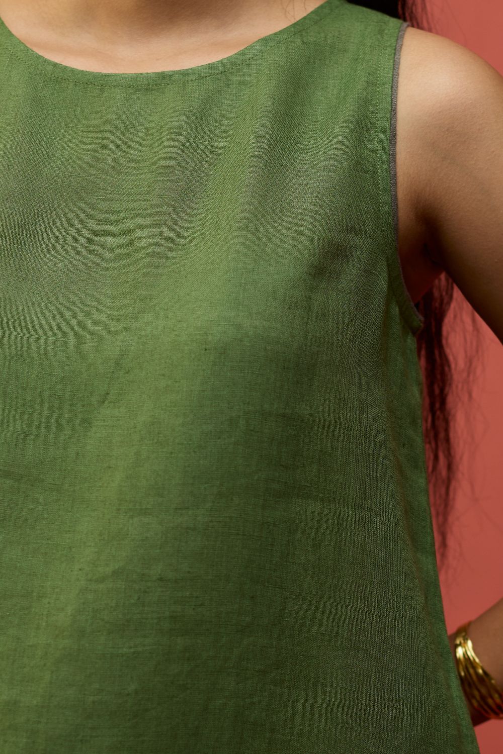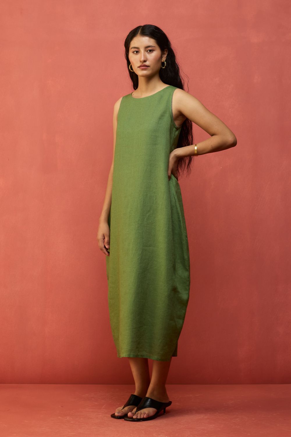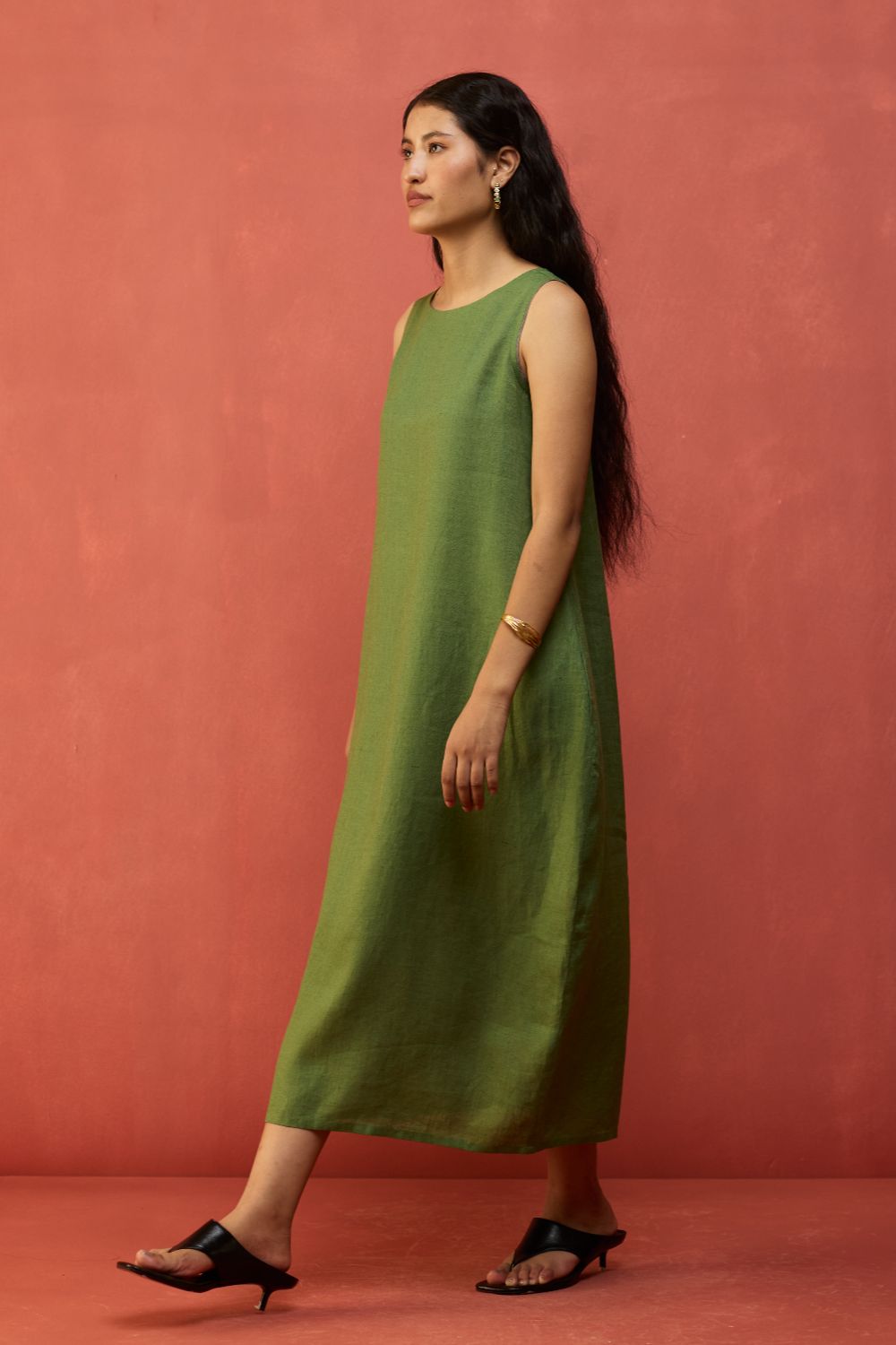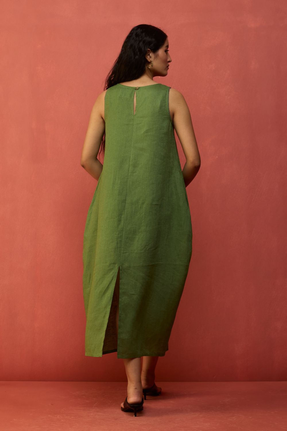 A sleeveless full-length dress with a soft parabola silhouette is thoughtfully crafted in a our signature soft yarn-dyed linen. Designed in a comfortable fit with a center back slit for easy movement and pockets while maintaining the shaped silhouette. The Juro dress is finished with contrast linen detailing along the sleeve hem.