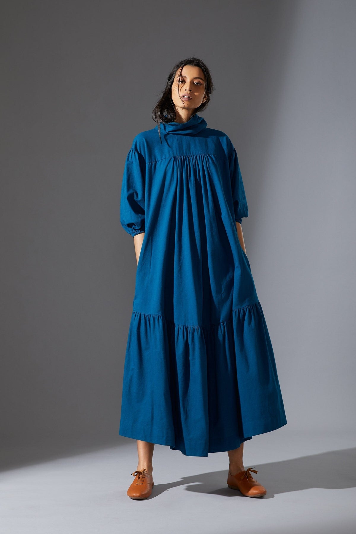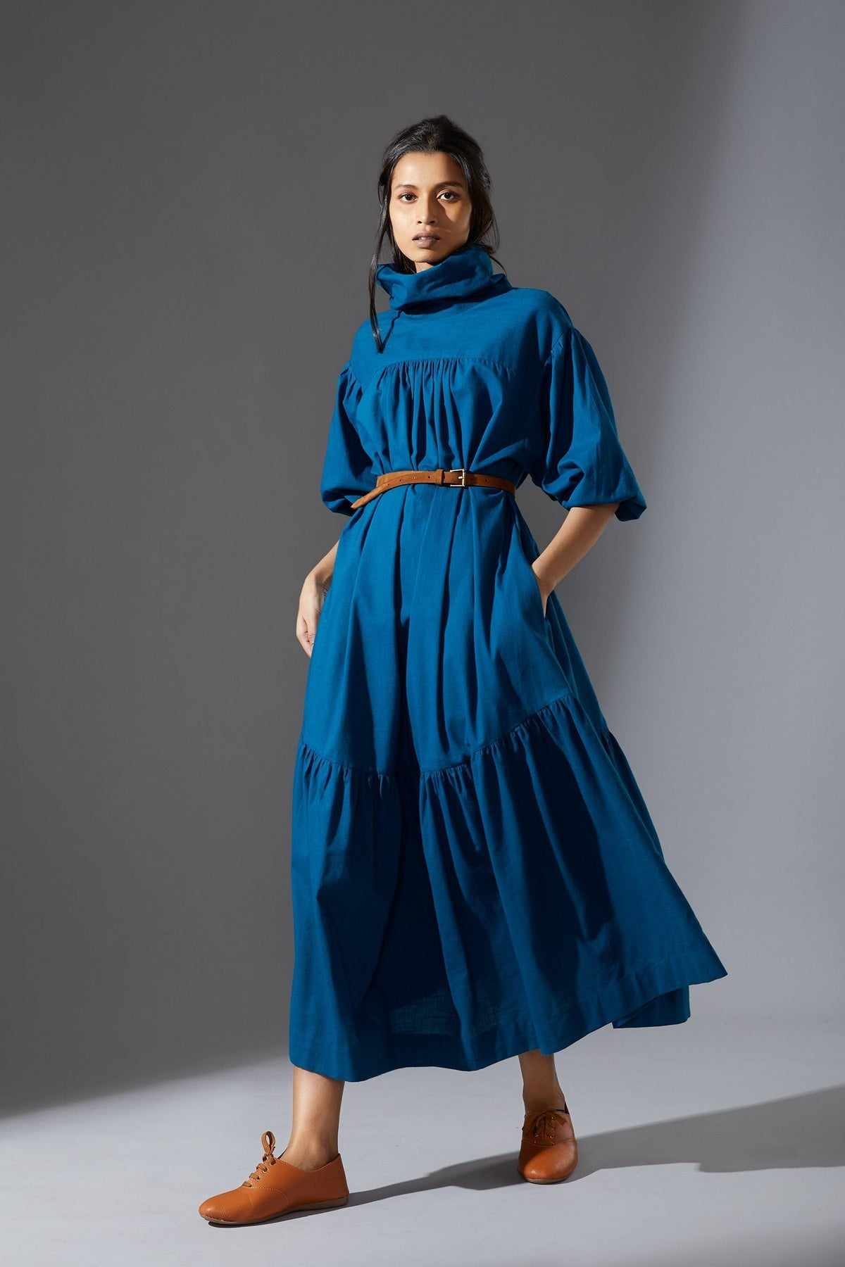This fun and stylish dress is made with a luxurious handwoven cotton slub fabric. It has pretty blouson sleeves, high collar and an adjustable belt to define the loose shape. Style yours with lace-up sandals and a tote.