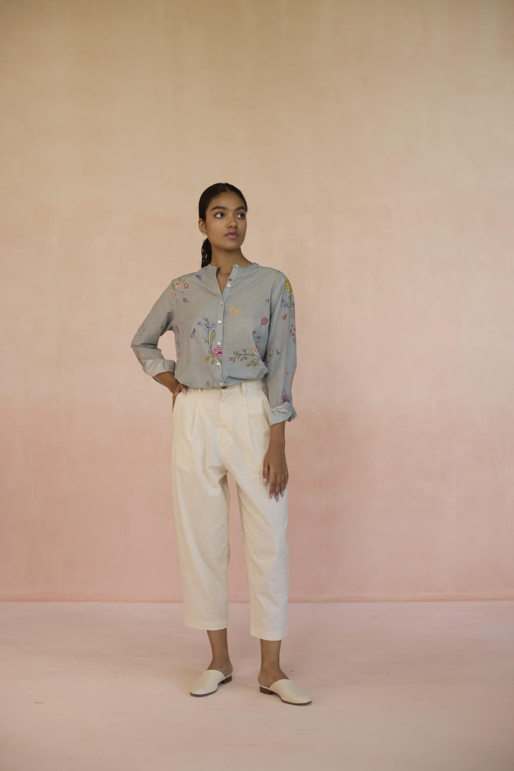 The Garden shirt has an exquisite range of flowers. With a bouquet of flowers from the garden carefully applied in pattern that showcases the flowers in full summer bloom. The band collared shirt is made with 100% handspun, handwoven cotton that lends grace and form to the fabric. Hand-sewn shell buttons and hand-swen seams adds a touch of individuality. The soft, yet durable cotton drapes effortlessly, offering comfort without compromising on style. Designed for effortless wear, makes it a go-to choice for daily wear.